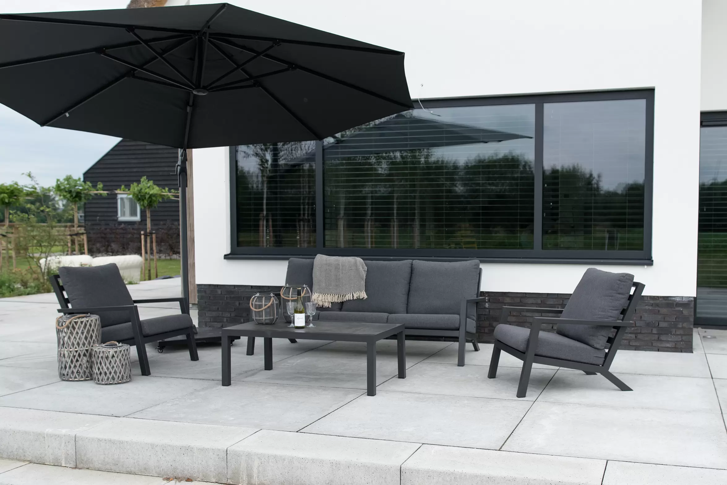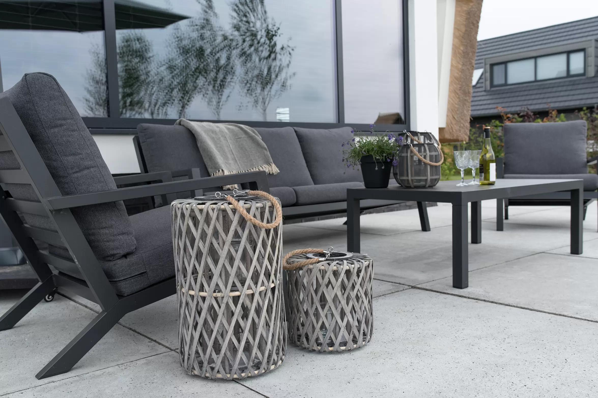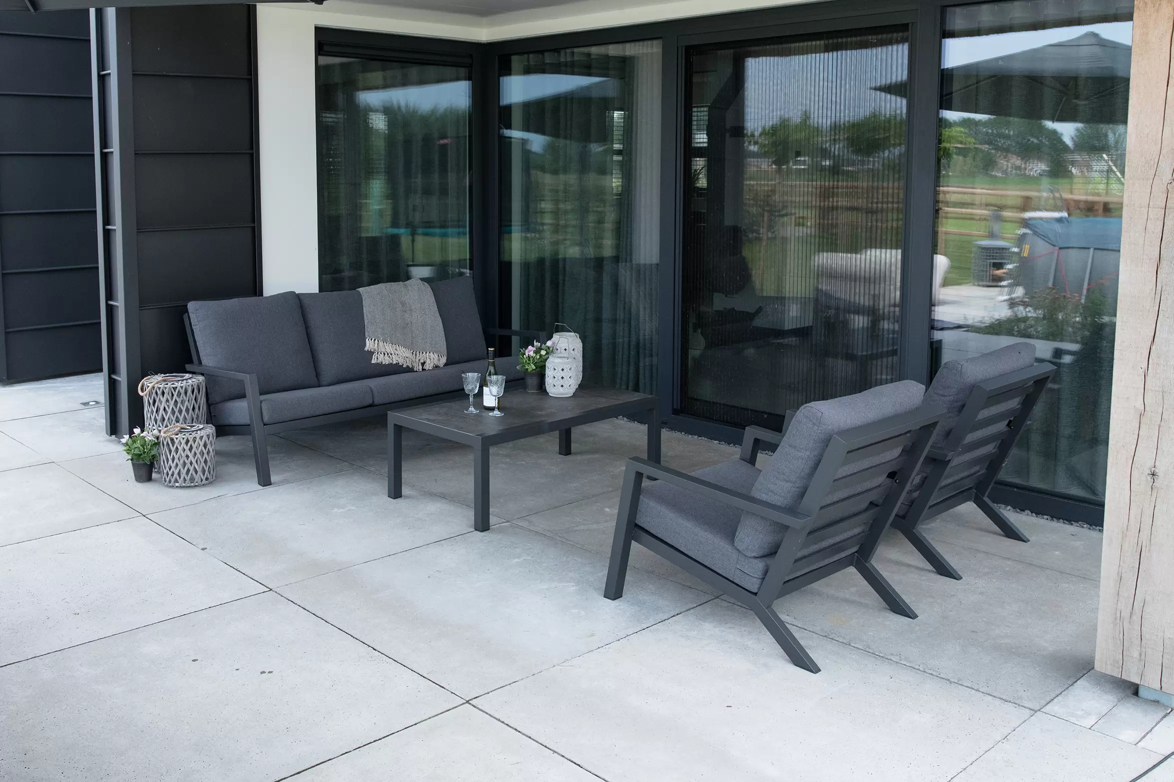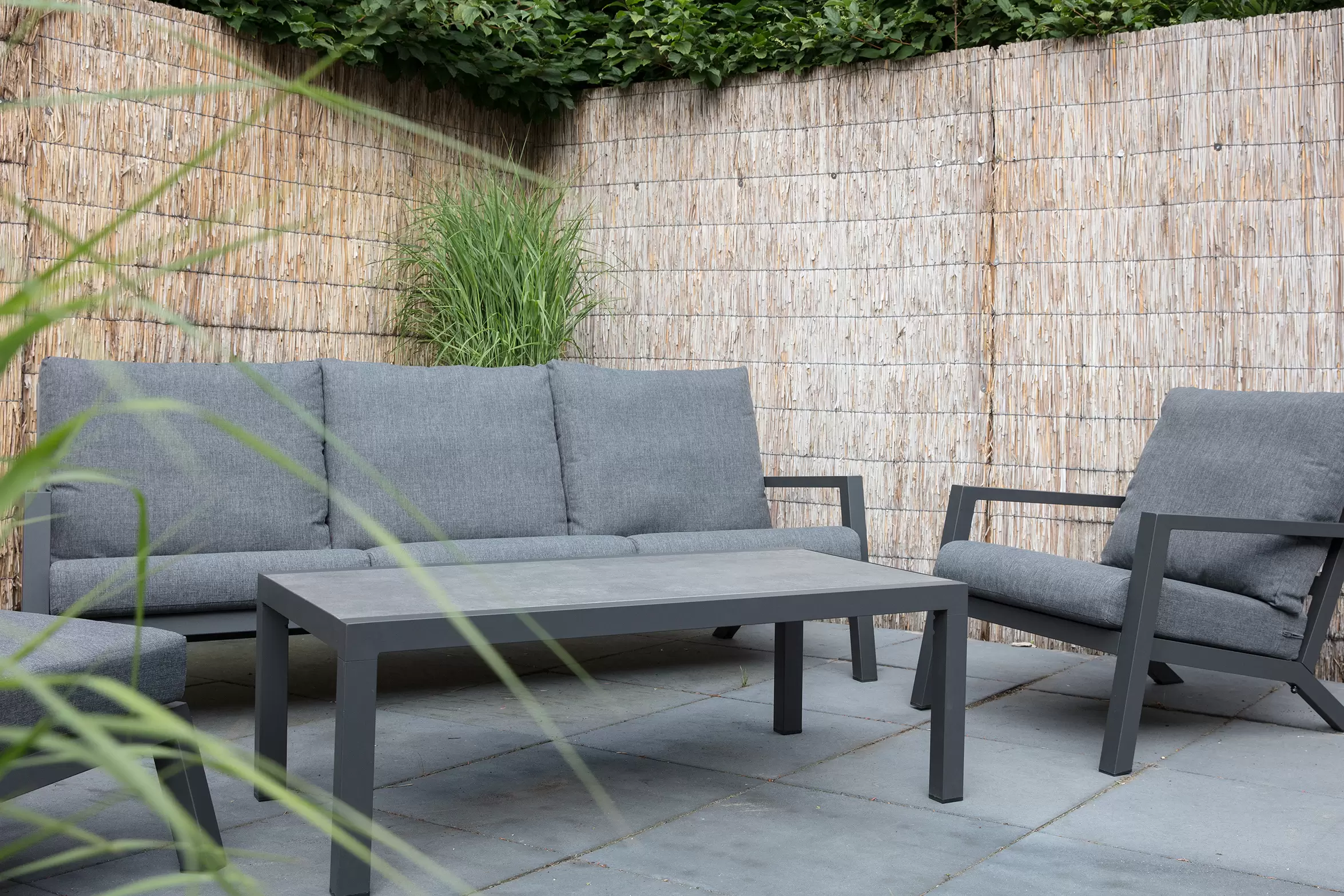 Meble wypoczynkowe są dostarczane z wodoodporną tapicerką siedziska i oparcia. Grubość poduszek siedziska: 12 cm.