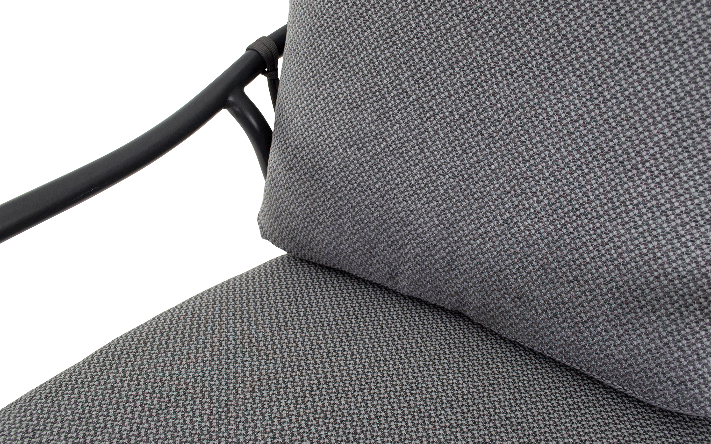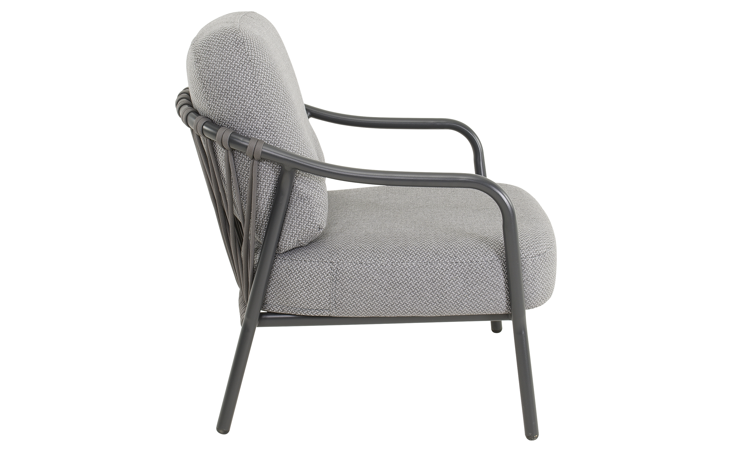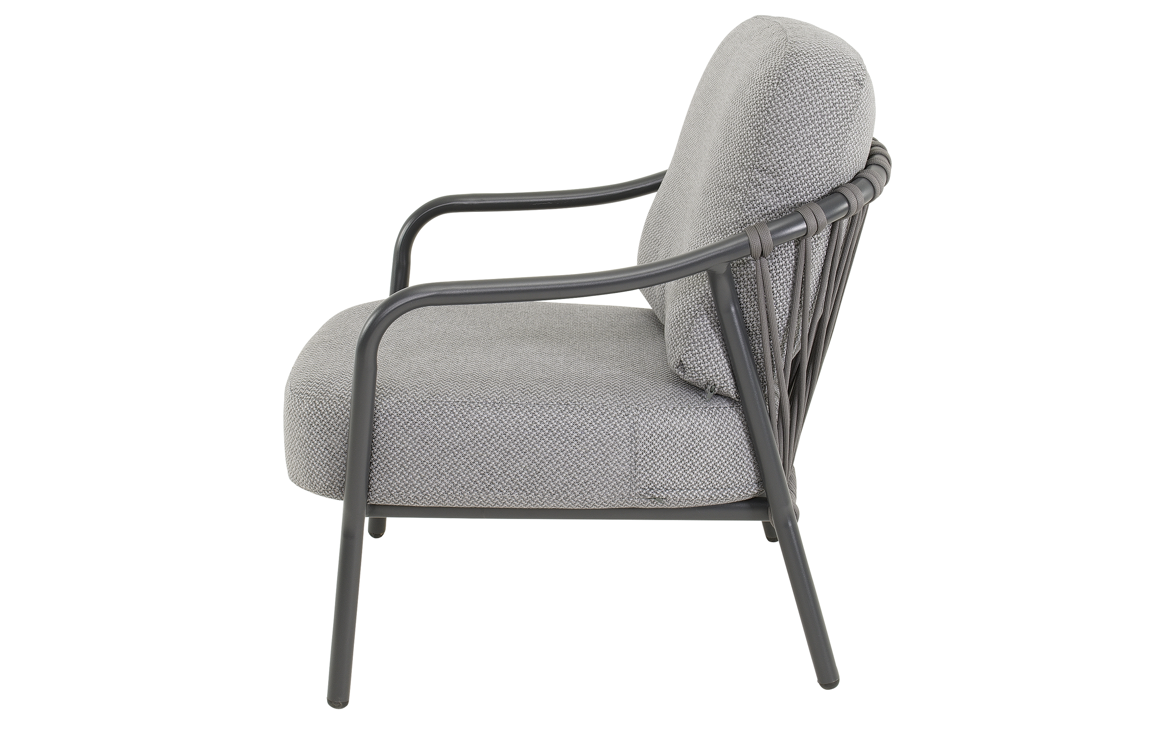 Fotel ogrodowy DURBAN marki Lesli Living to elegancka propozycja do strefy wypoczynkowej na tarasie, w ogrodzie lub oranżerii. Jego konstrukcja wykonana jest z aluminium malowanego proszkowo w kolorze matowego antracytu, co zapewnia trwałość, odporność na korozję i nowoczesny wygląd. Oparcie i boki fotela zdobią ciemnoszare wyploty z liny polipropylenowej o przekroju 18×9 mm, które nadają lekkości i zapewniają przewiewne, komfortowe siedzenie. Siedzisko wyposażone jest w miękką poduszkę z tkaniny Olefin o gramaturze 300 g/m² — materiału odpornego na wilgoć, promieniowanie UV i zabrudzenia.