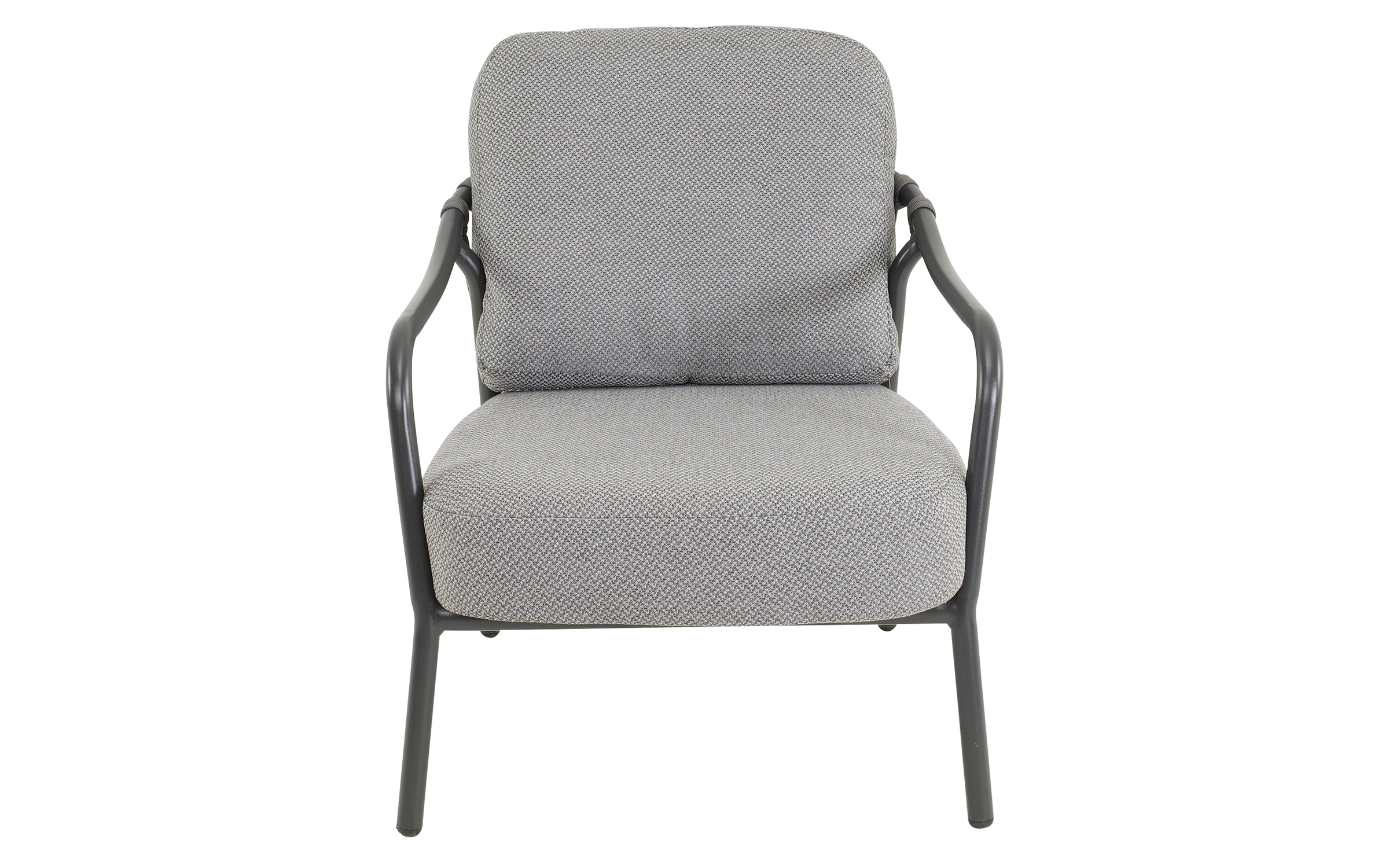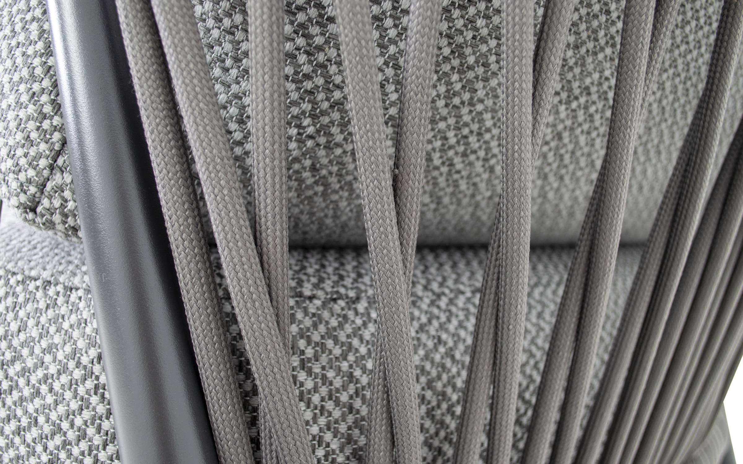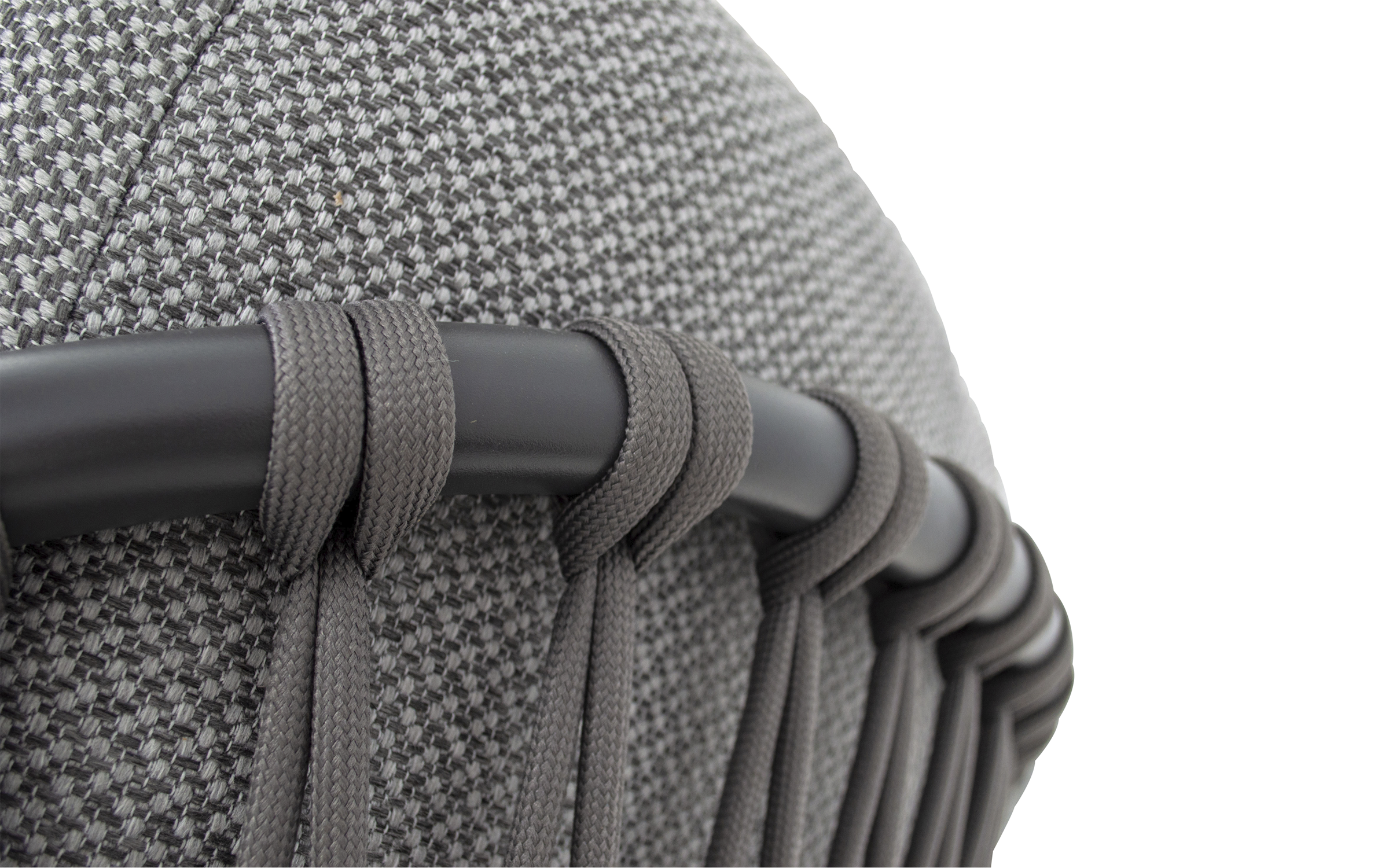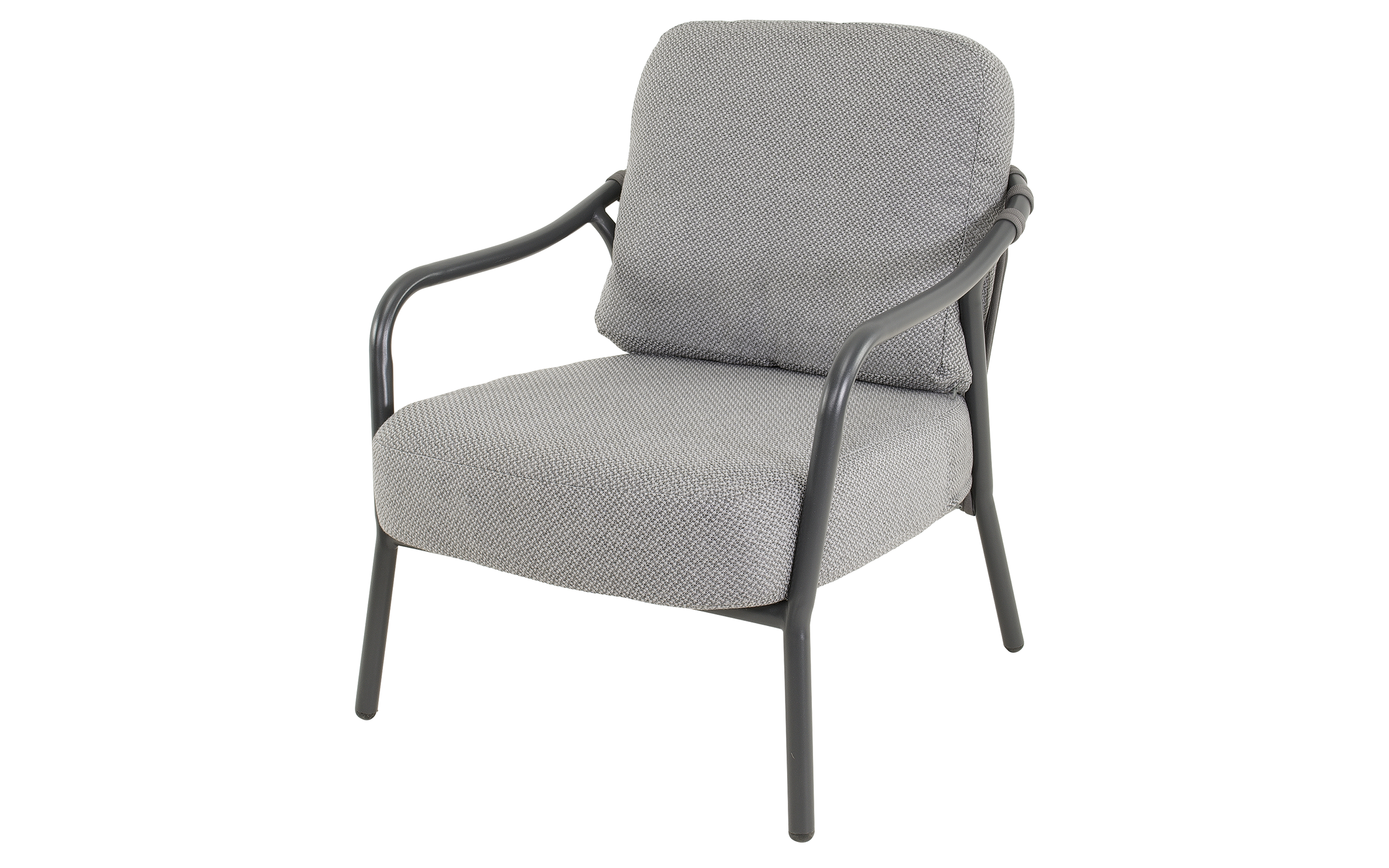 Fotel ogrodowy DURBAN marki Lesli Living to elegancka propozycja do strefy wypoczynkowej na tarasie, w ogrodzie lub oranżerii. Jego konstrukcja wykonana jest z aluminium malowanego proszkowo w kolorze matowego antracytu, co zapewnia trwałość, odporność na korozję i nowoczesny wygląd. Oparcie i boki fotela zdobią ciemnoszare wyploty z liny polipropylenowej o przekroju 18×9 mm, które nadają lekkości i zapewniają przewiewne, komfortowe siedzenie. Siedzisko wyposażone jest w miękką poduszkę z tkaniny Olefin o gramaturze 300 g/m² — materiału odpornego na wilgoć, promieniowanie UV i zabrudzenia.
