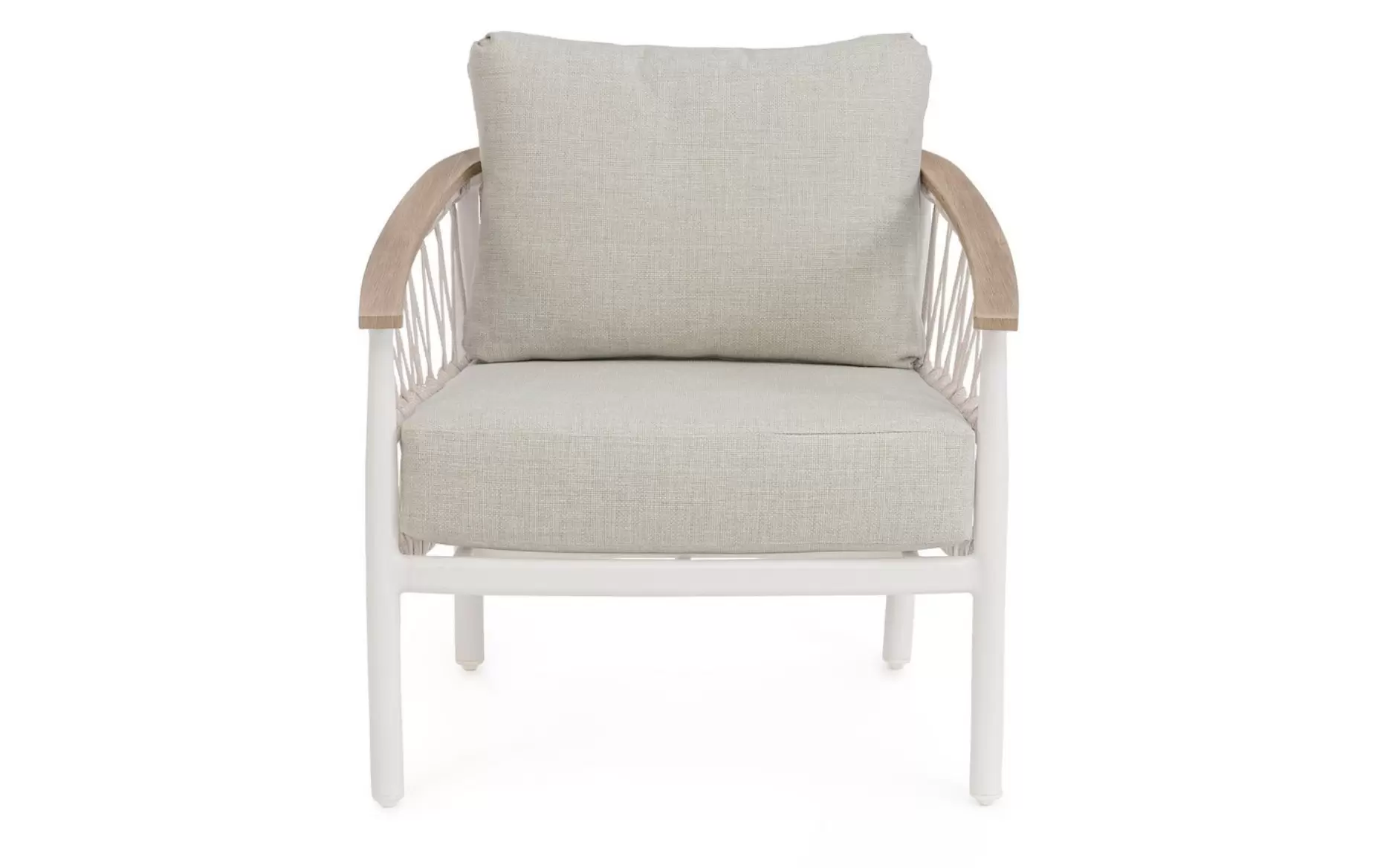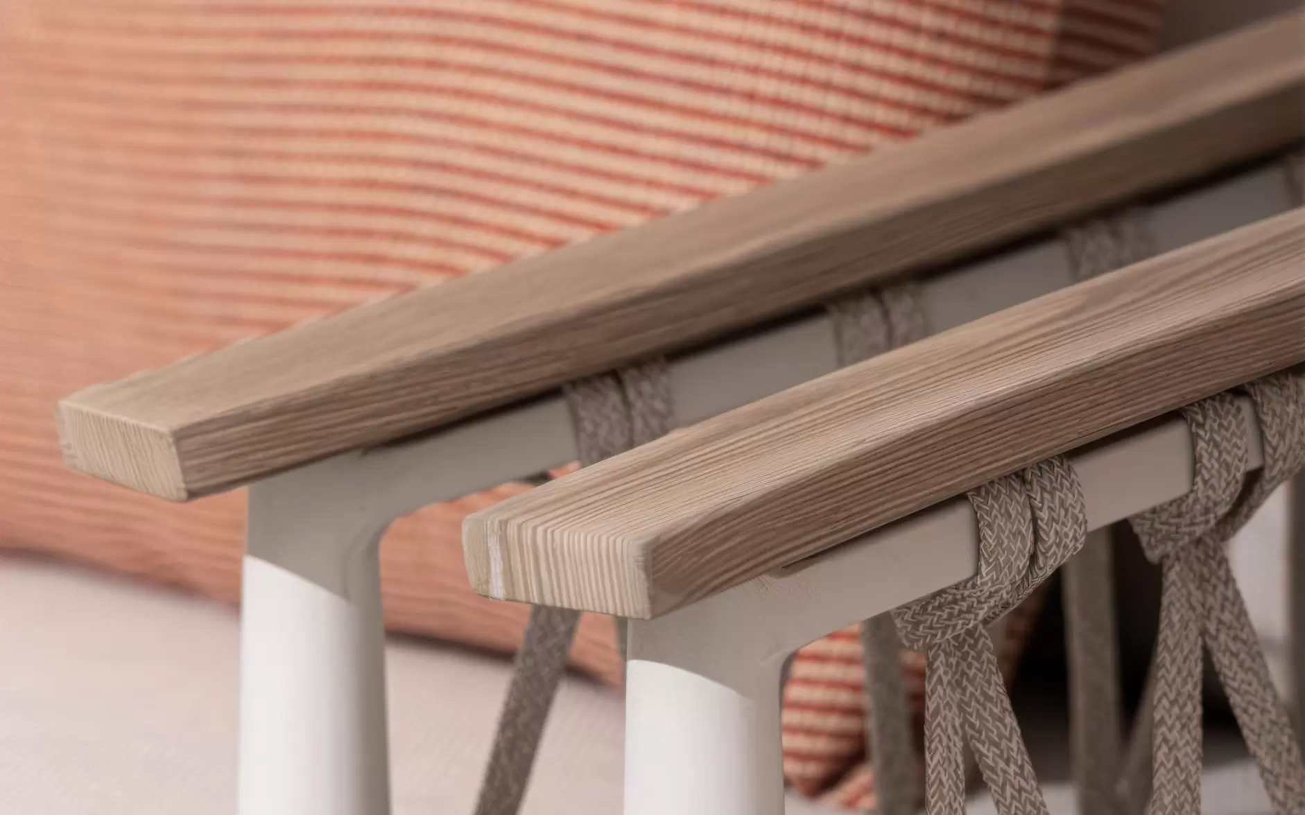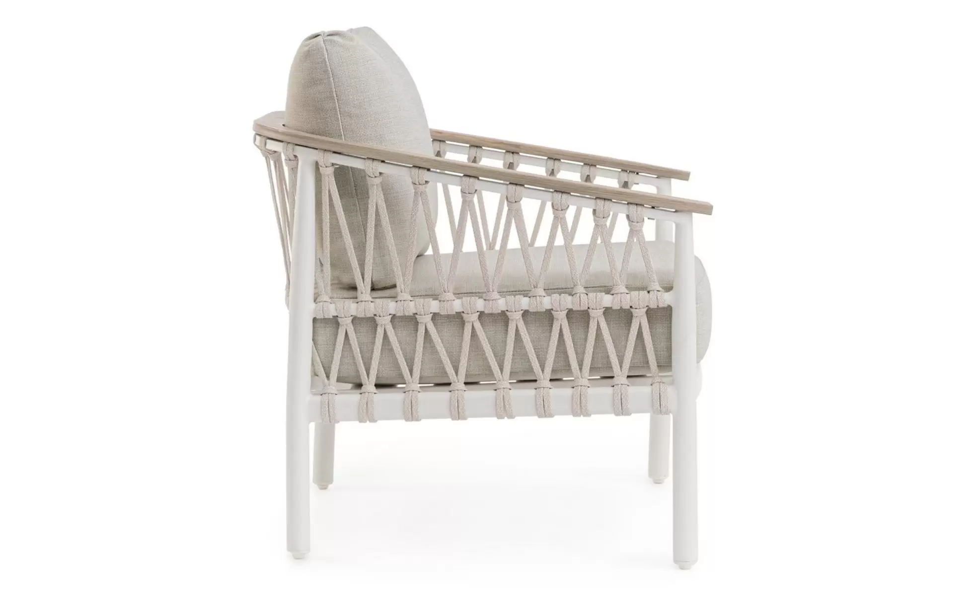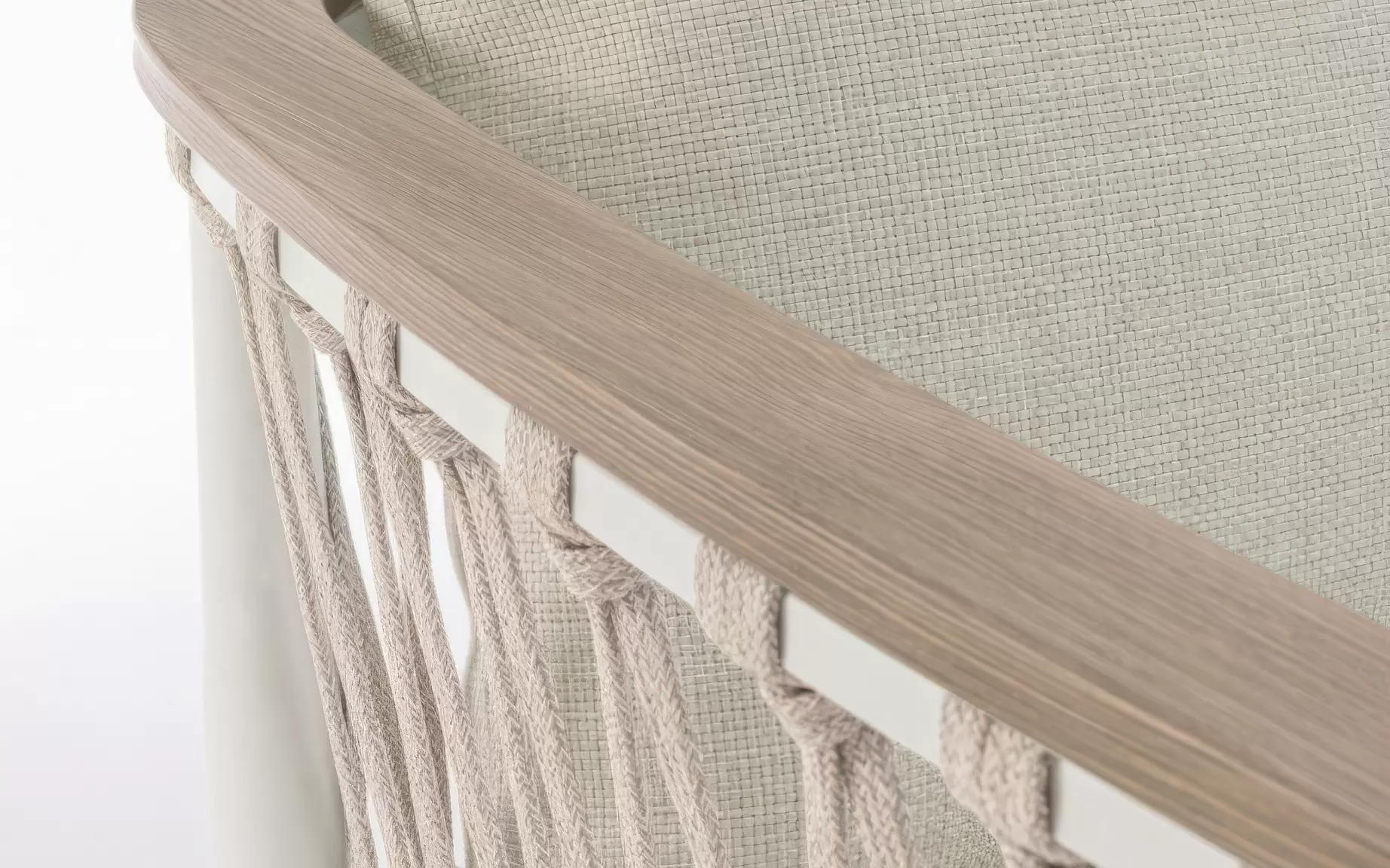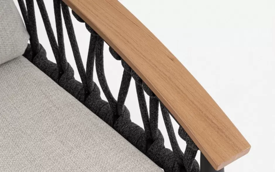 Plecionka rope – syntetyczna lina o wysokiej gęstości włókien, odporna na UV i wilgoć. Zachowuje sprężystość i kolor przez wiele sezonów, nadając fotelowi rzemieślniczy, elegancki charakter.