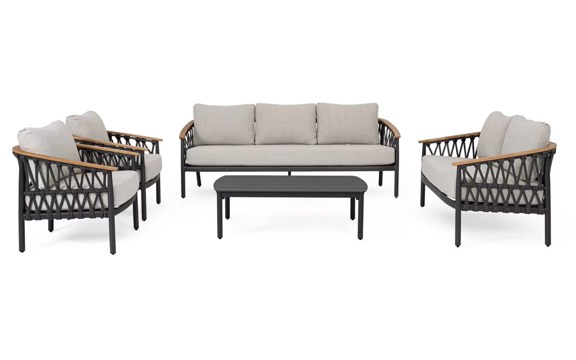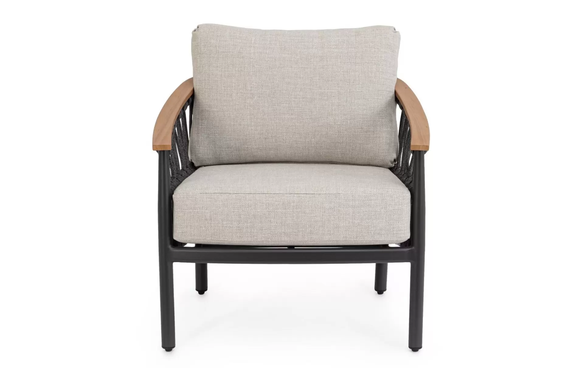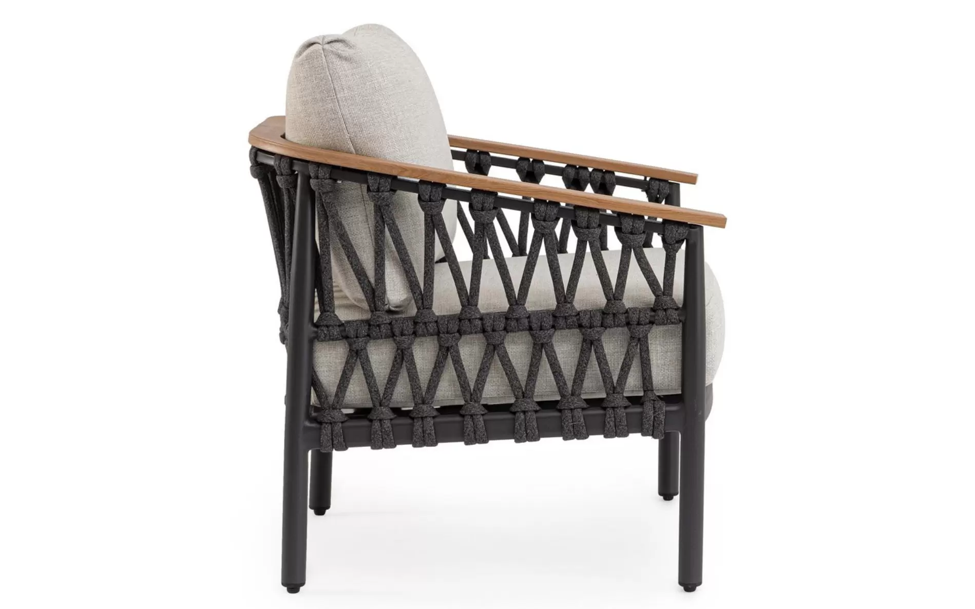 Stabilna konstrukcja opiera się na aluminiowej ramie, której antracytowe wykończenie kontrastuje z misternie plecioną liną, nadającą fotelowi unikalny, a zarazem naturalny charakter. Detale, takie jak podłokietniki wykończone nakładkami o wyglądzie drewna teak, wprowadzają do projektu szczyptę szlachetnego ciepła. To połączenie surowości metalu z miękkością splotów sprawia, że FENIX jest synonimem nowoczesnego stylu, który nie traci na przytulności.