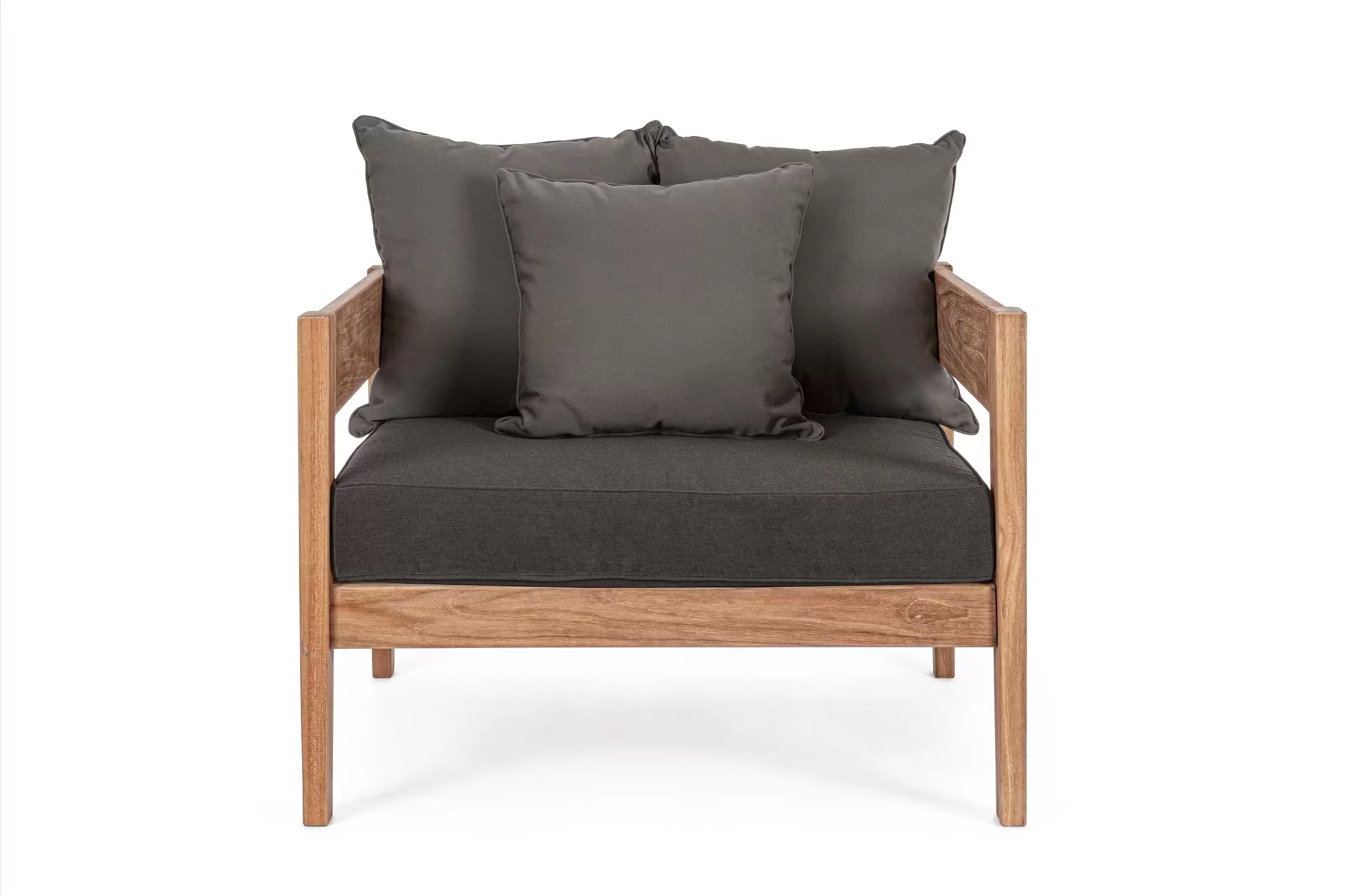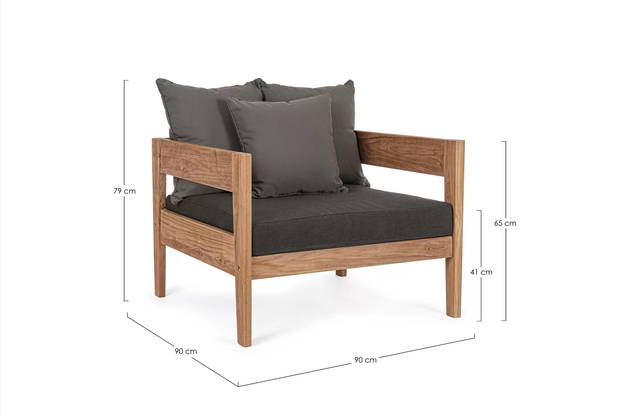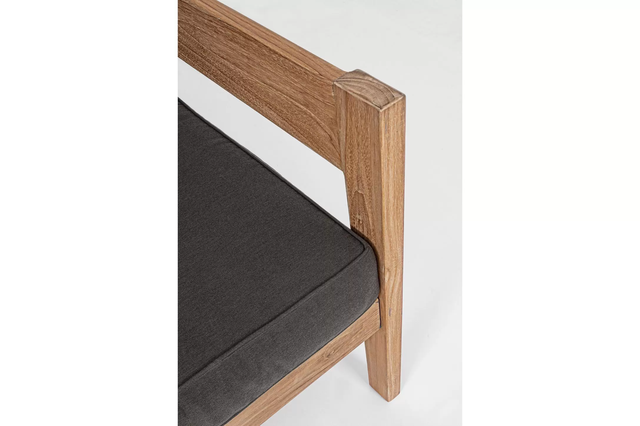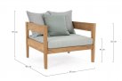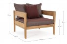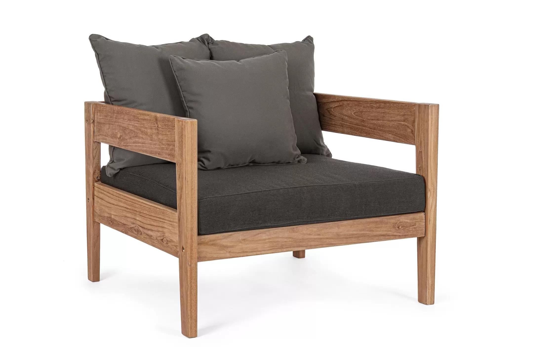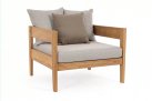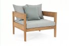 Nowoczesny i prosty w formie fotel do ogrodowego patio z drewna teakowego z ciemnoszarymi poduszkami.