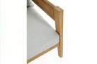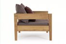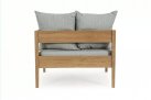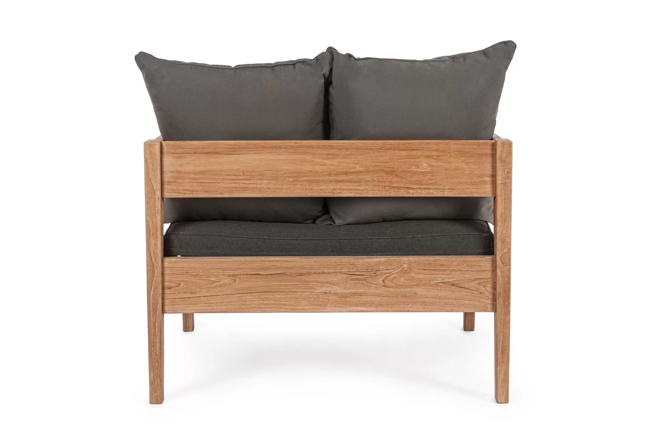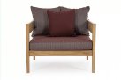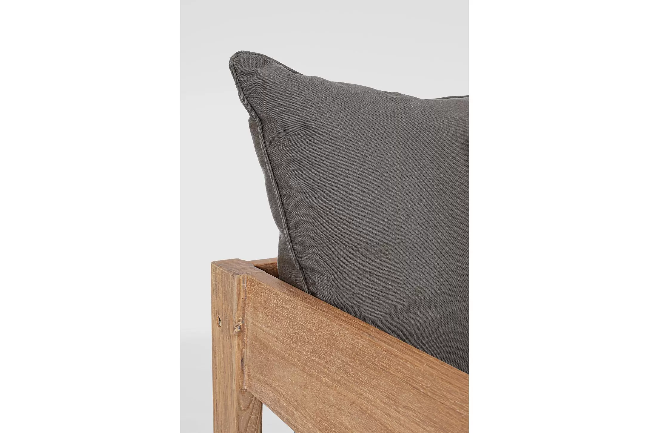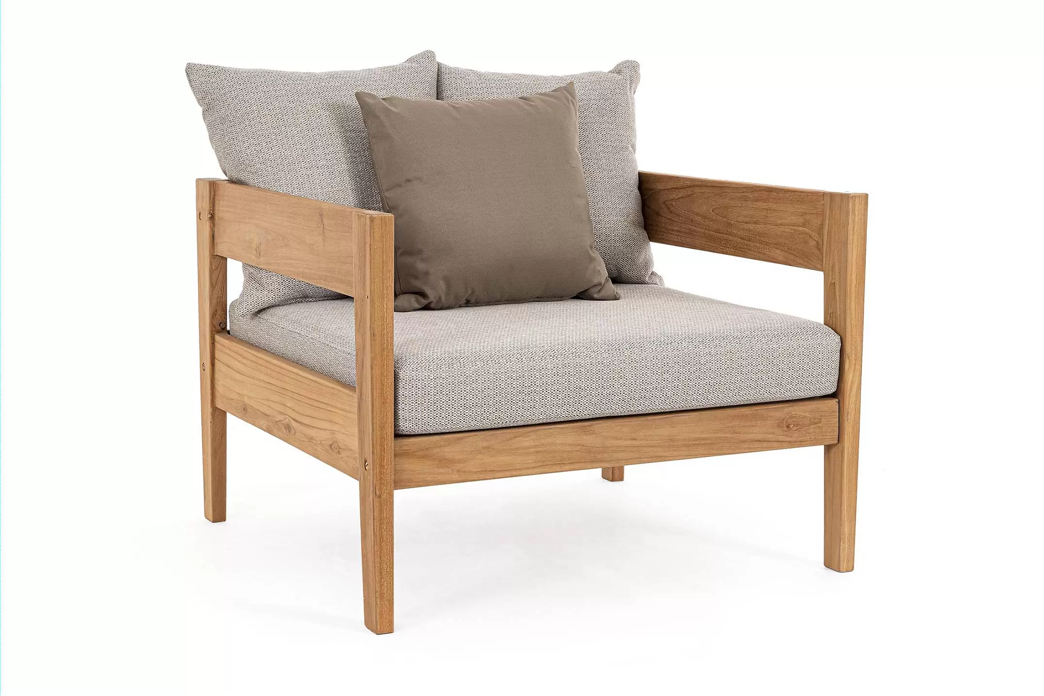 Nowoczesny i prosty w formie fotel do ogrodowego patio z drewna teakowego z ciemnoszarymi poduszkami.