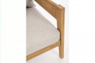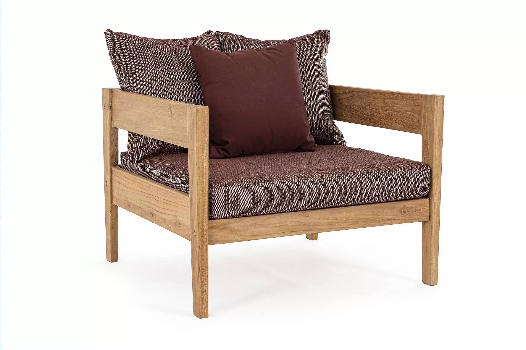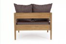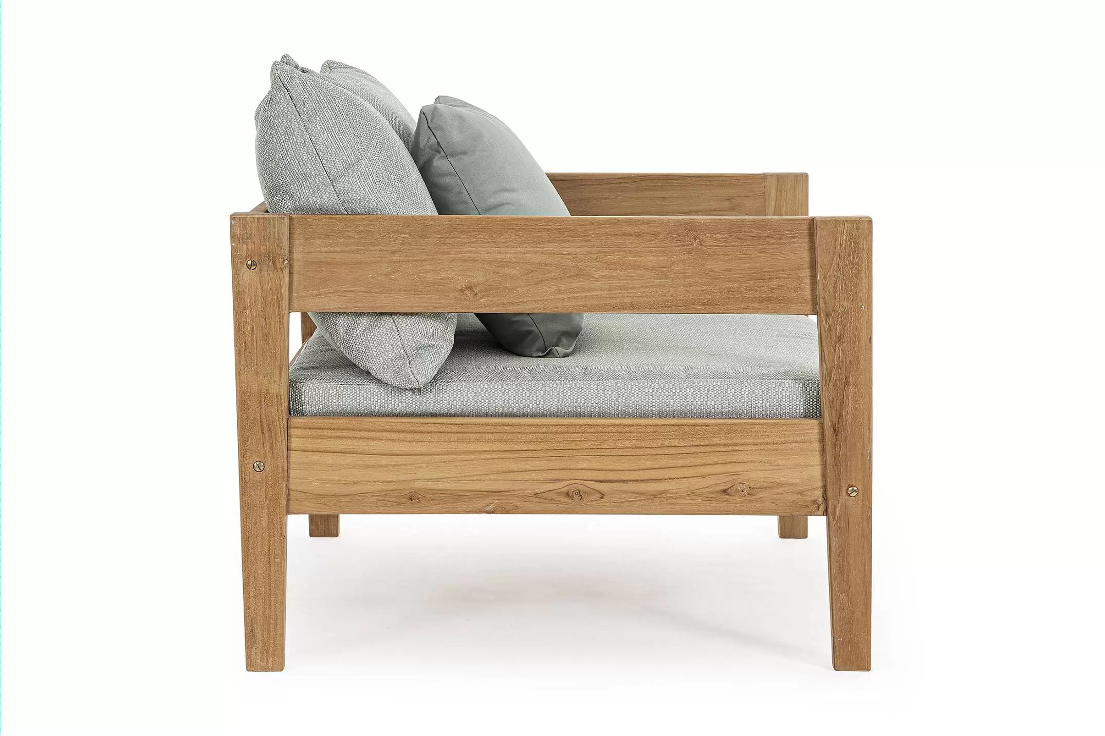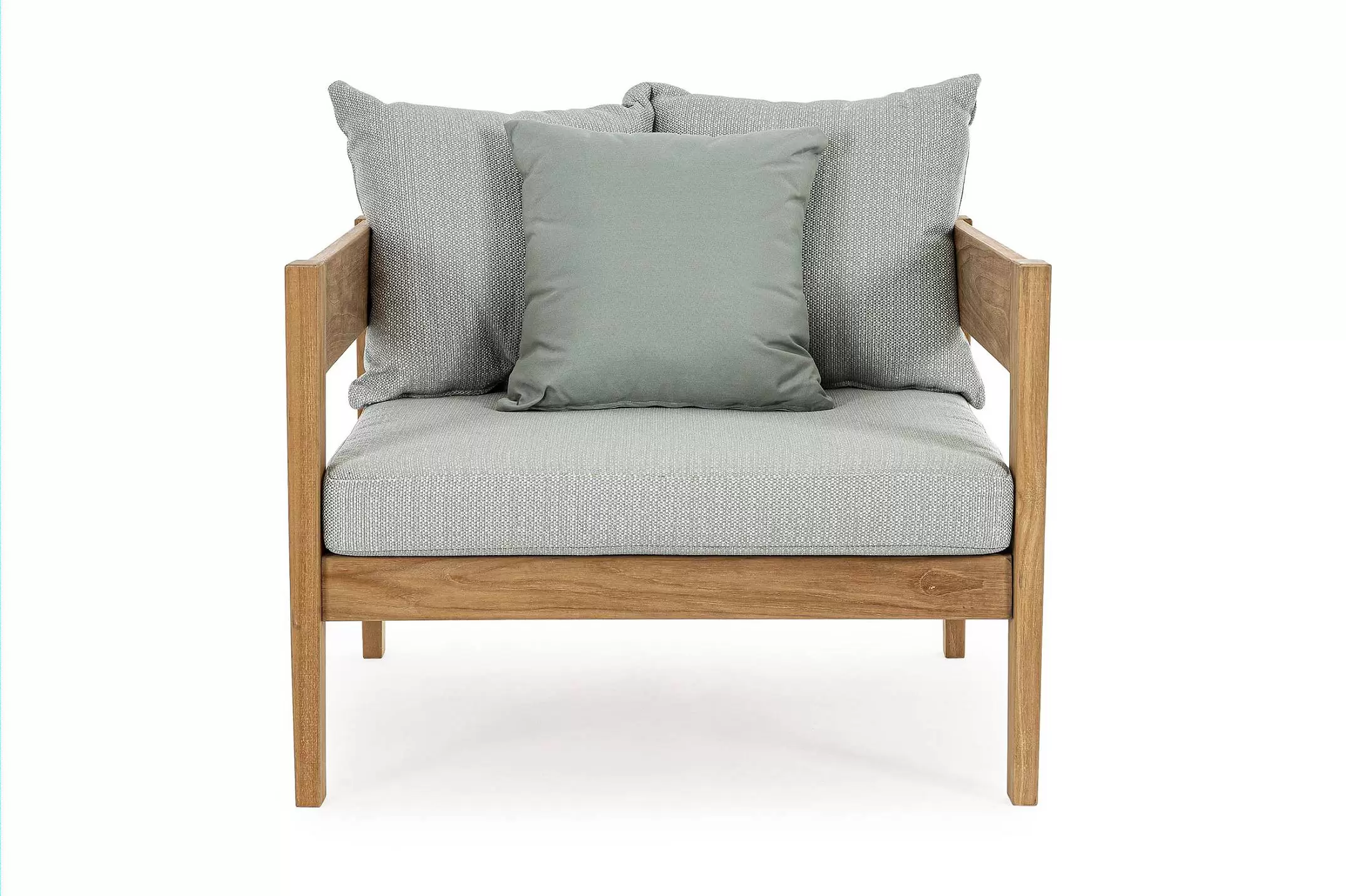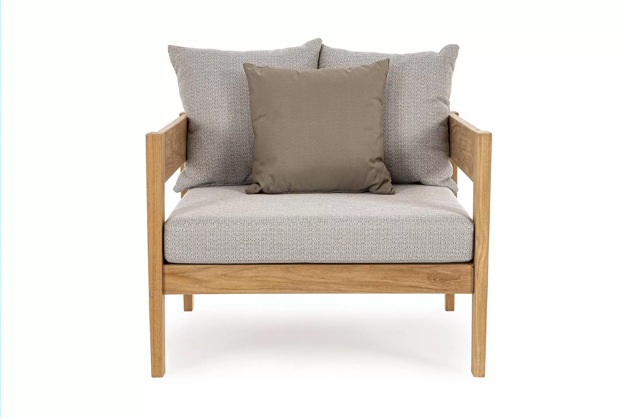Nowoczesny i prosty w formie fotel do ogrodowego patio z drewna teakowego z ciemnoszarymi poduszkami.