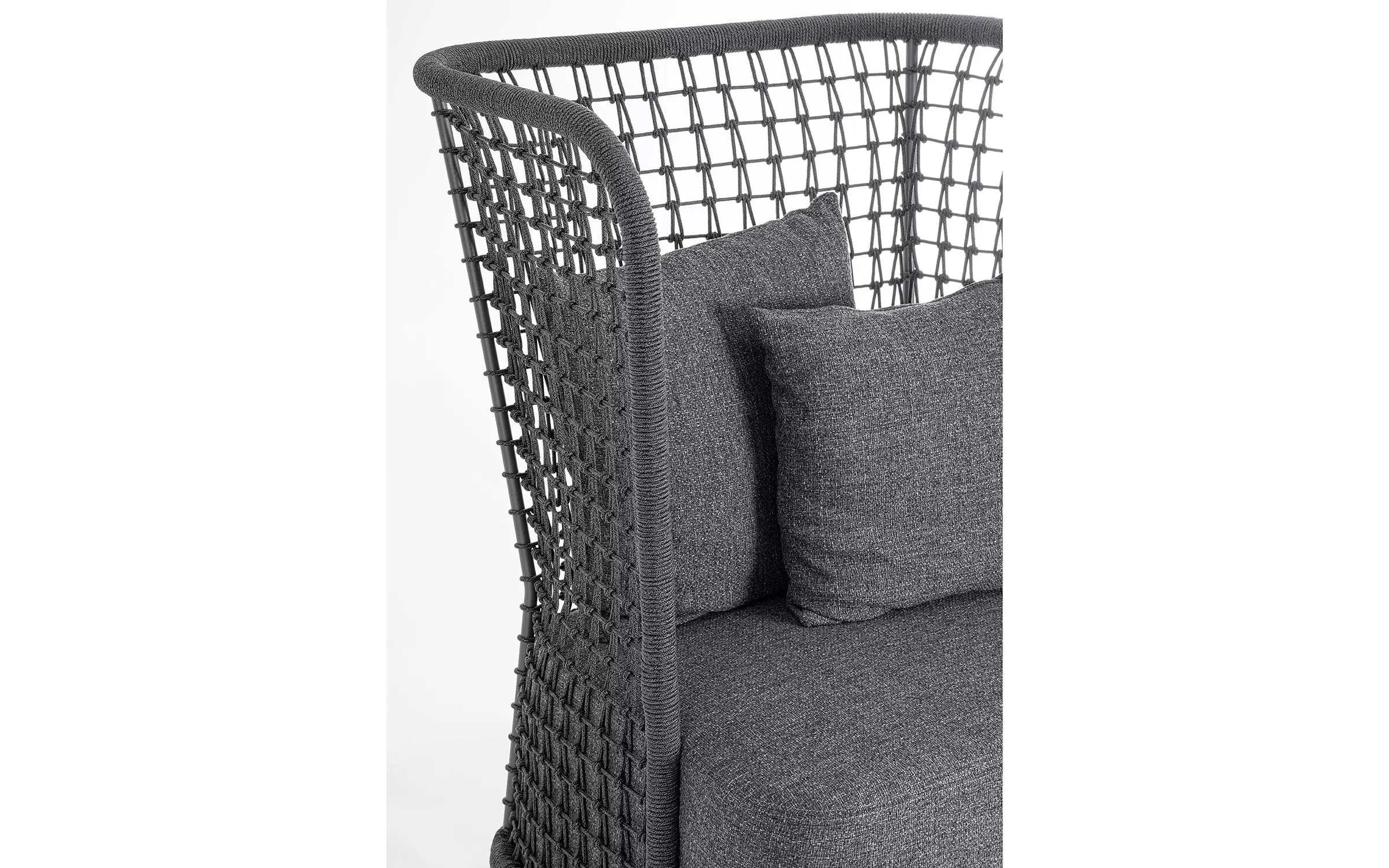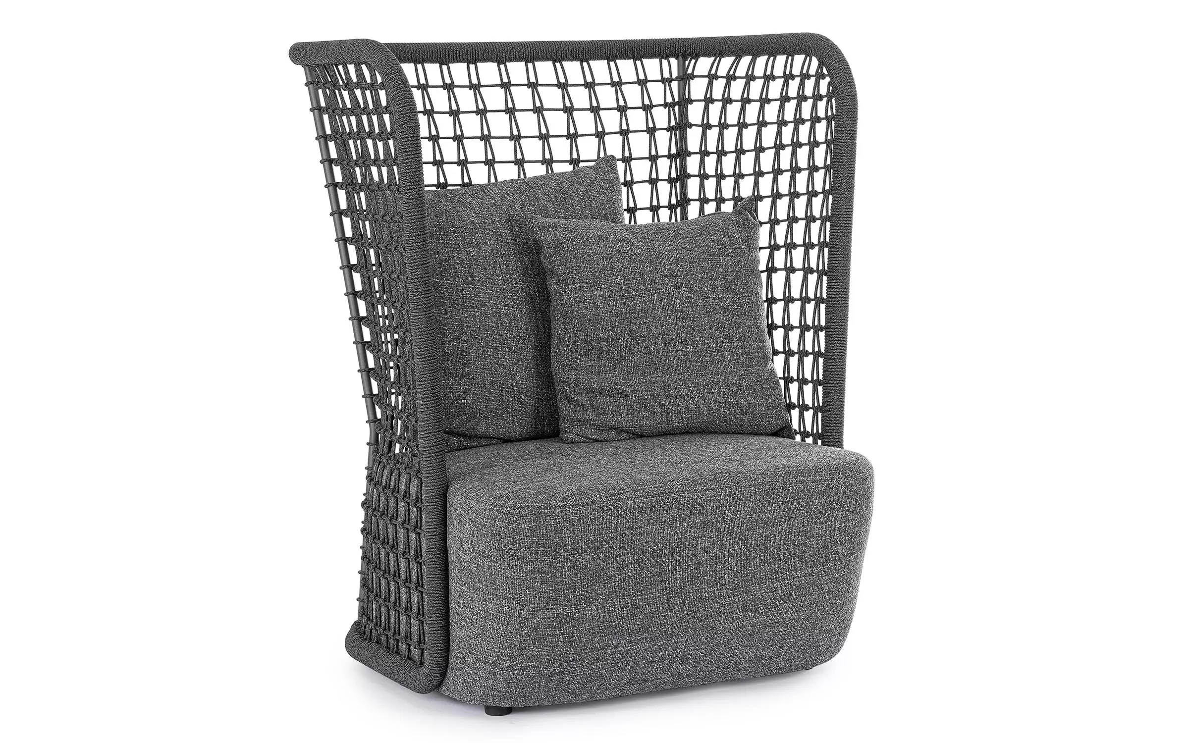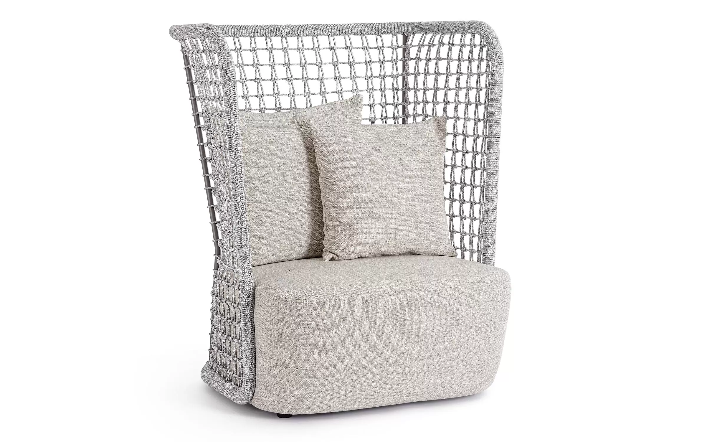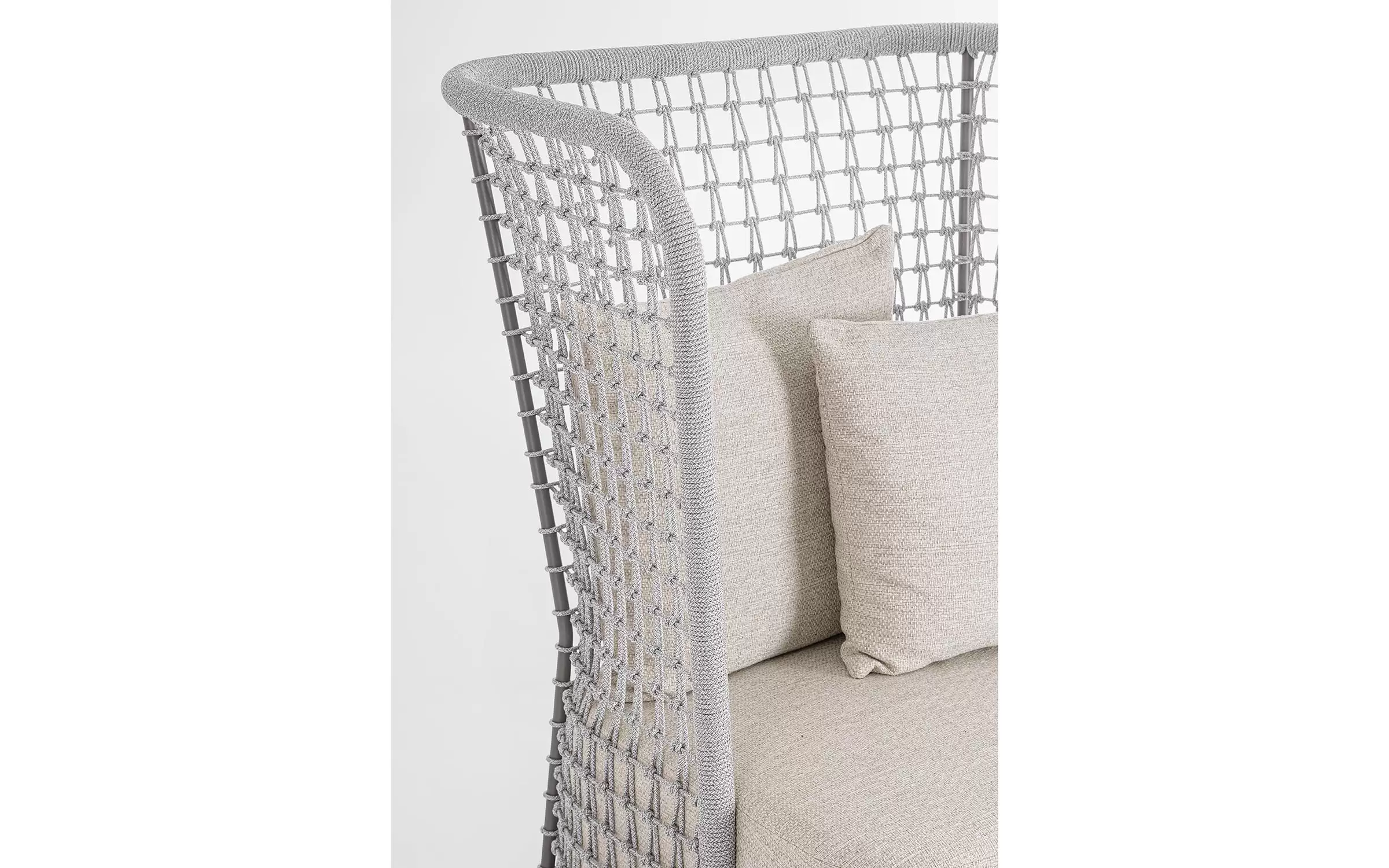 Wysoki fotel ogrodowy z bardzo gruba poduszką siedziska i jaśkami na oparciu. Niespotykany styl wyznacza wysokie oparcie z plecionką z liny polipropylenowej.