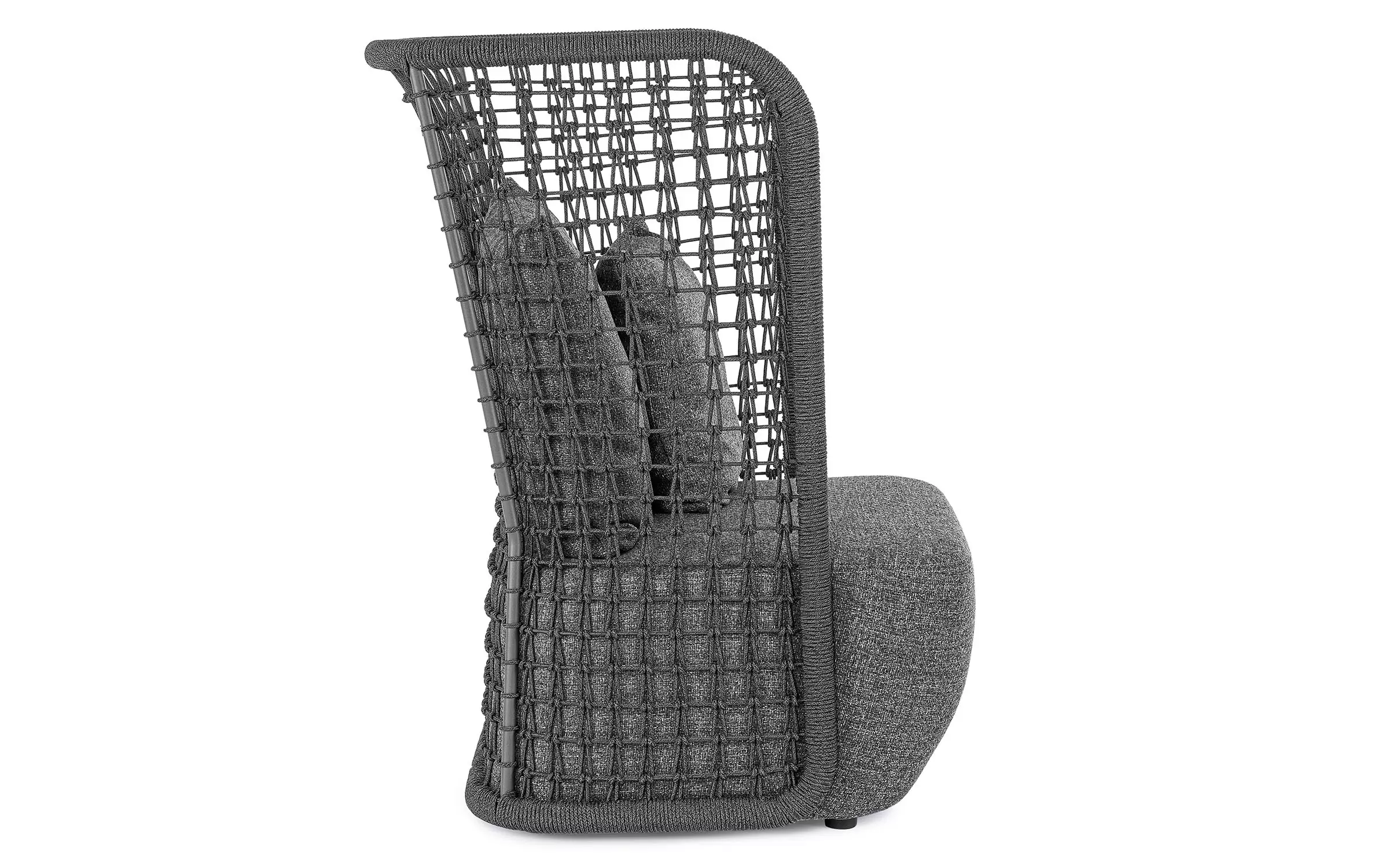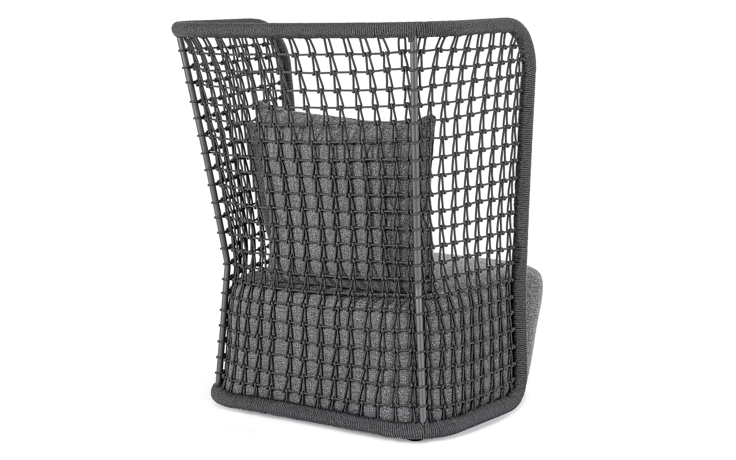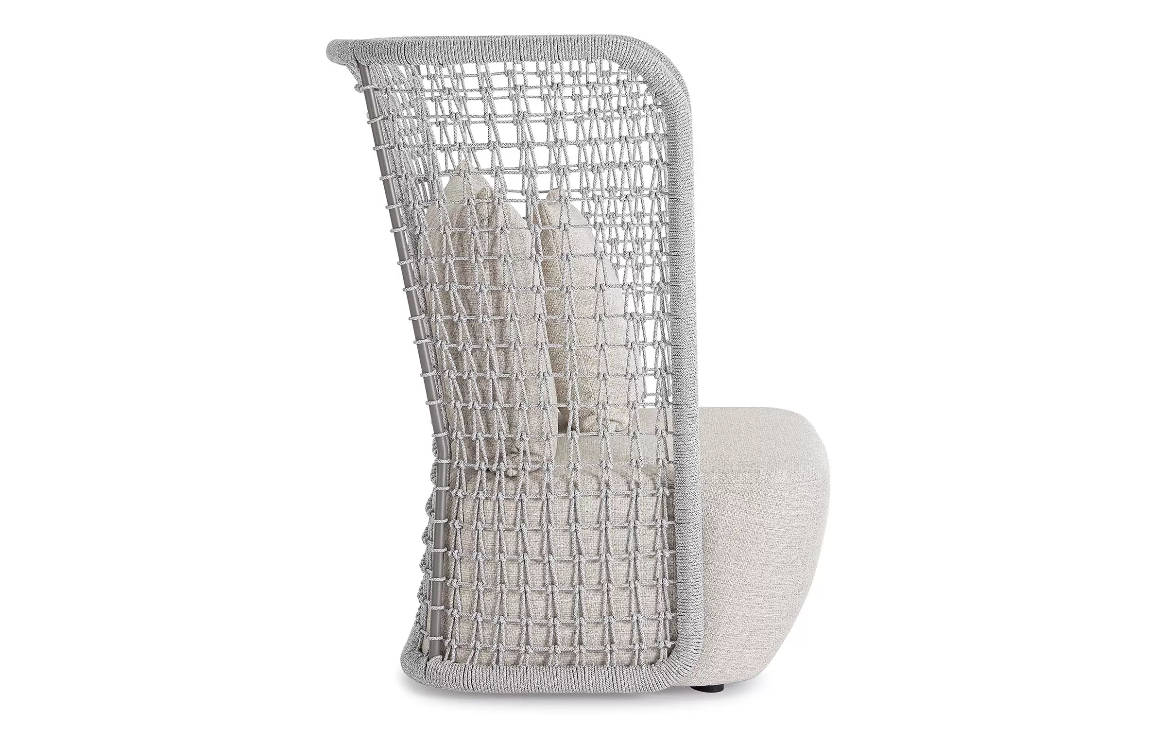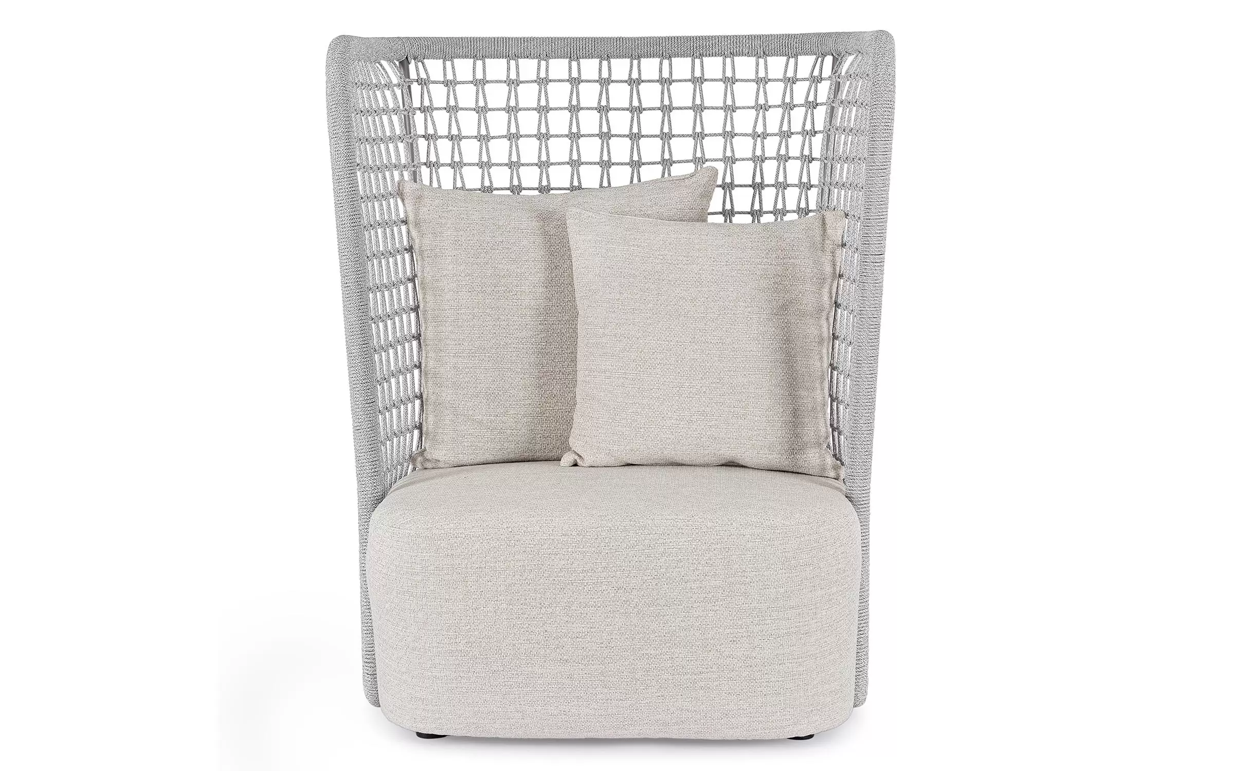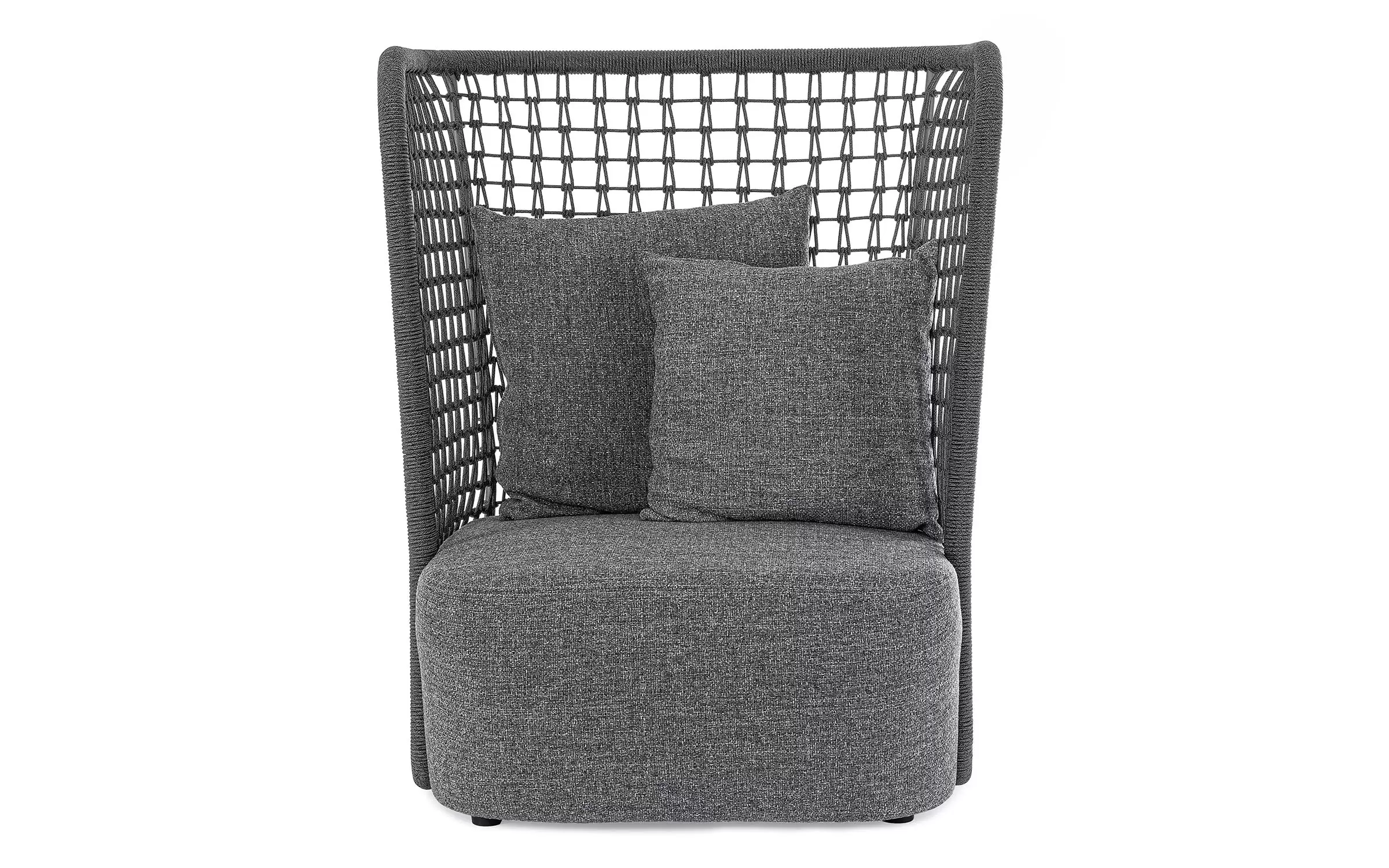 Wysoki fotel ogrodowy z bardzo gruba poduszką siedziska i jaśkami na oparciu. Niespotykany styl wyznacza wysokie oparcie z plecionką z liny polipropylenowej.