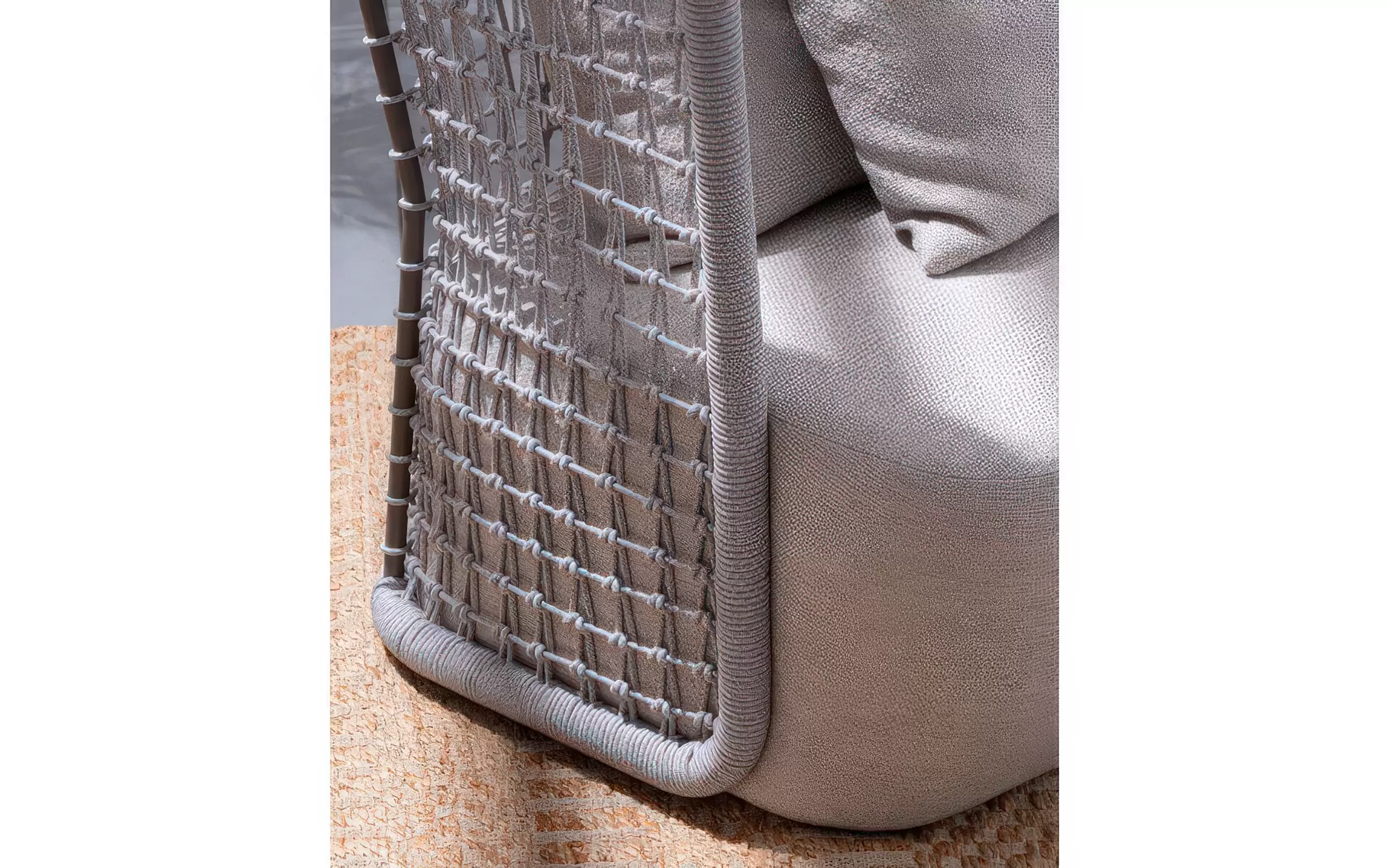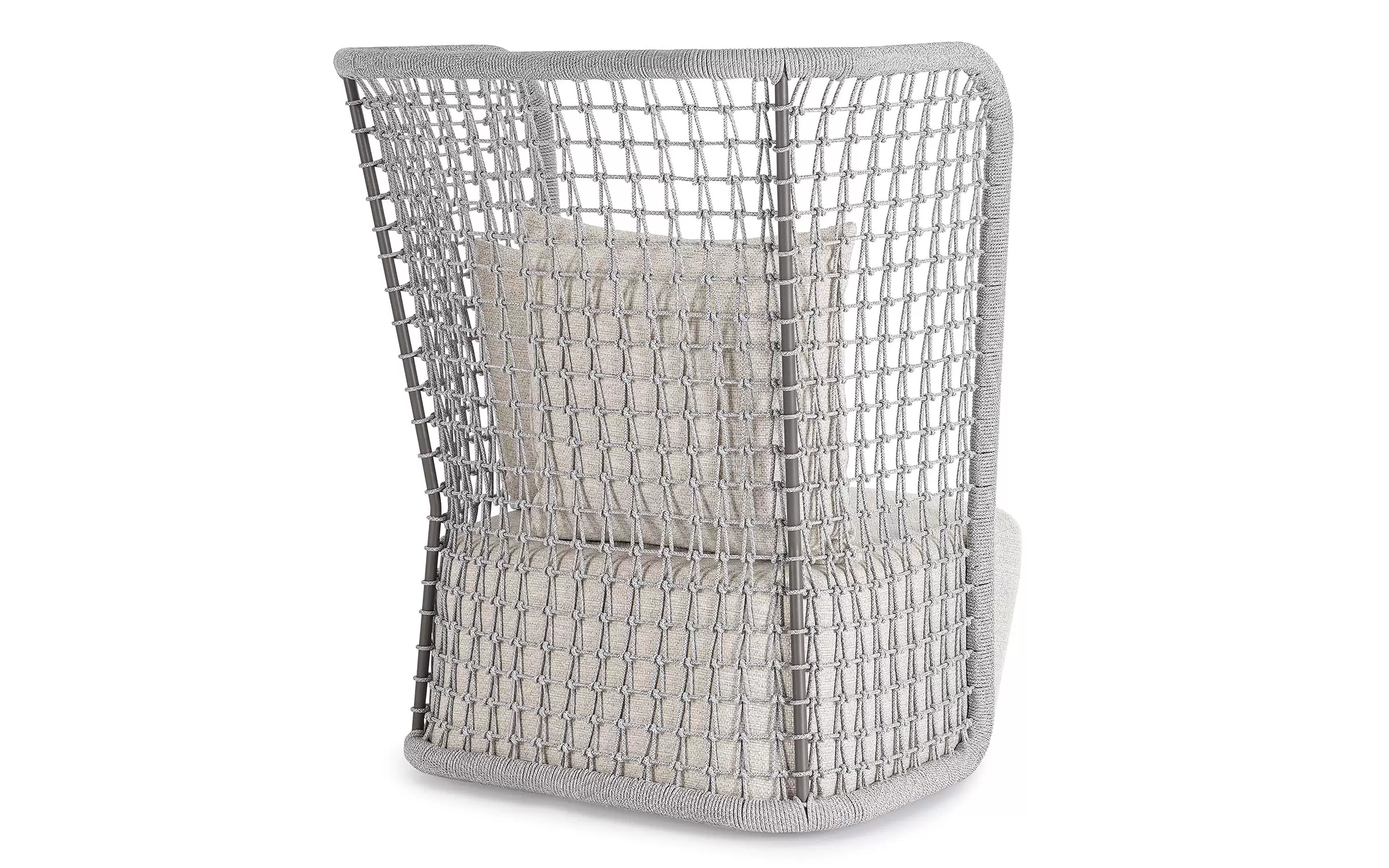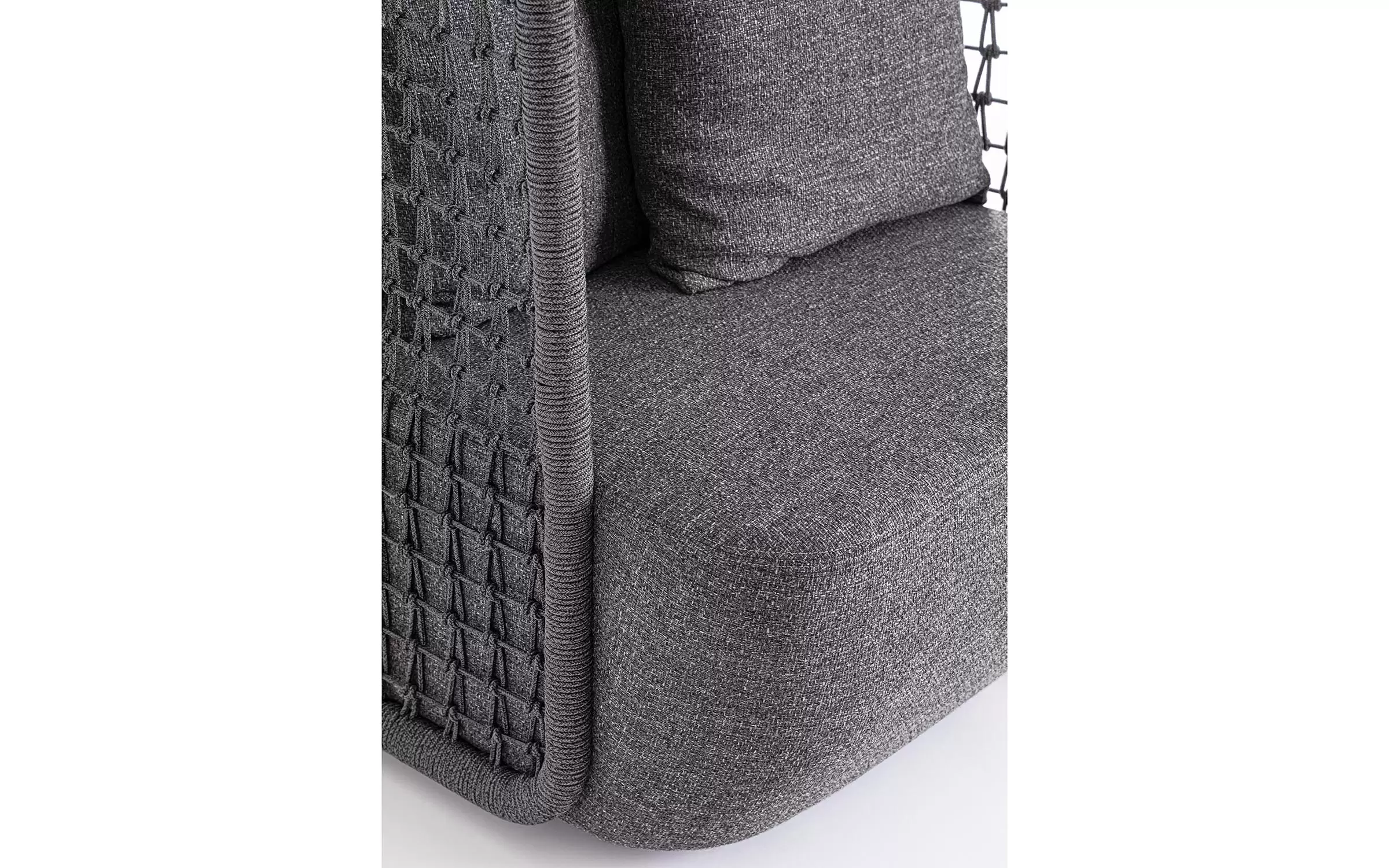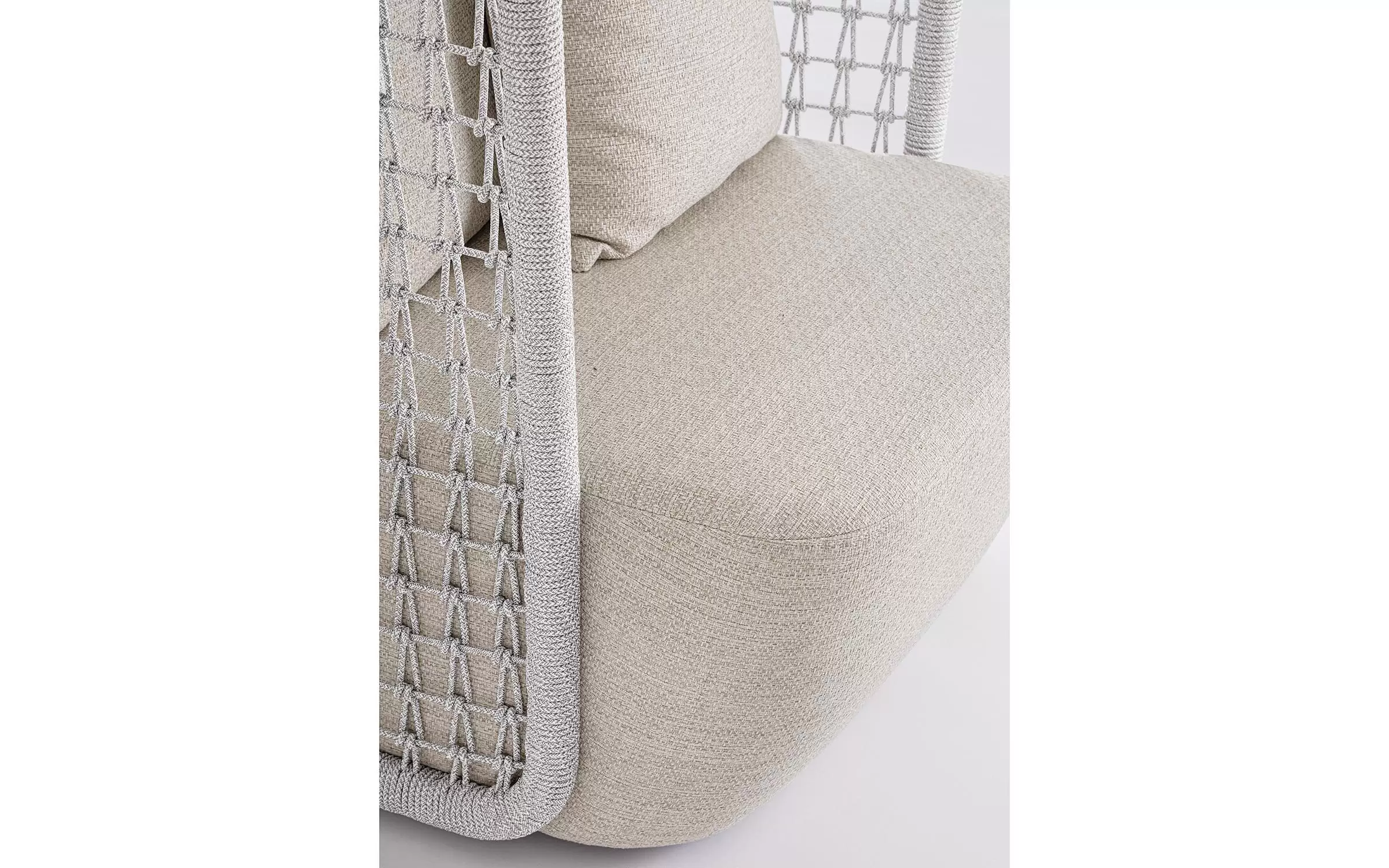 Wysoki fotel ogrodowy z bardzo gruba poduszką siedziska i jaśkami na oparciu. Niespotykany styl wyznacza wysokie oparcie z plecionką z liny polipropylenowej.