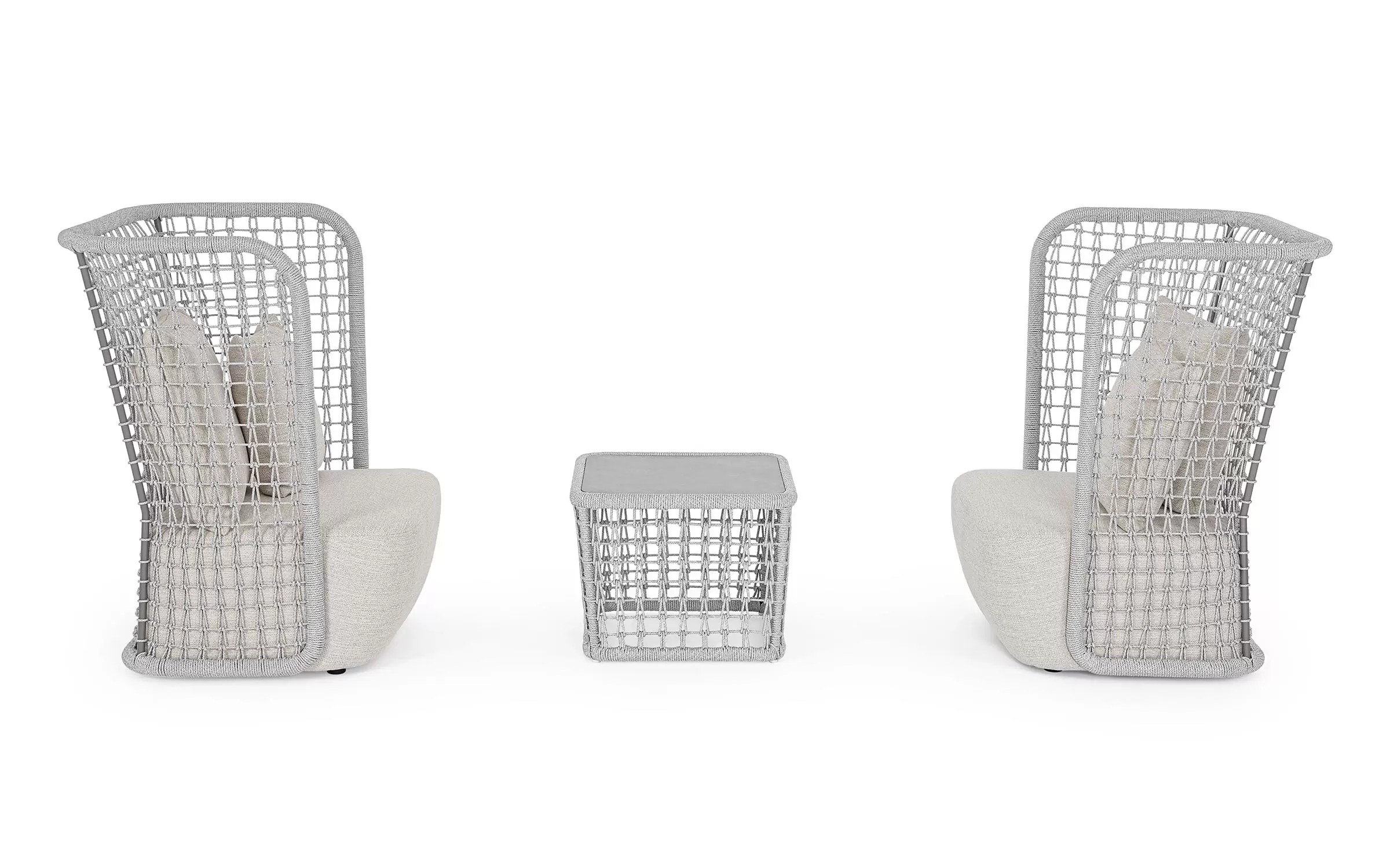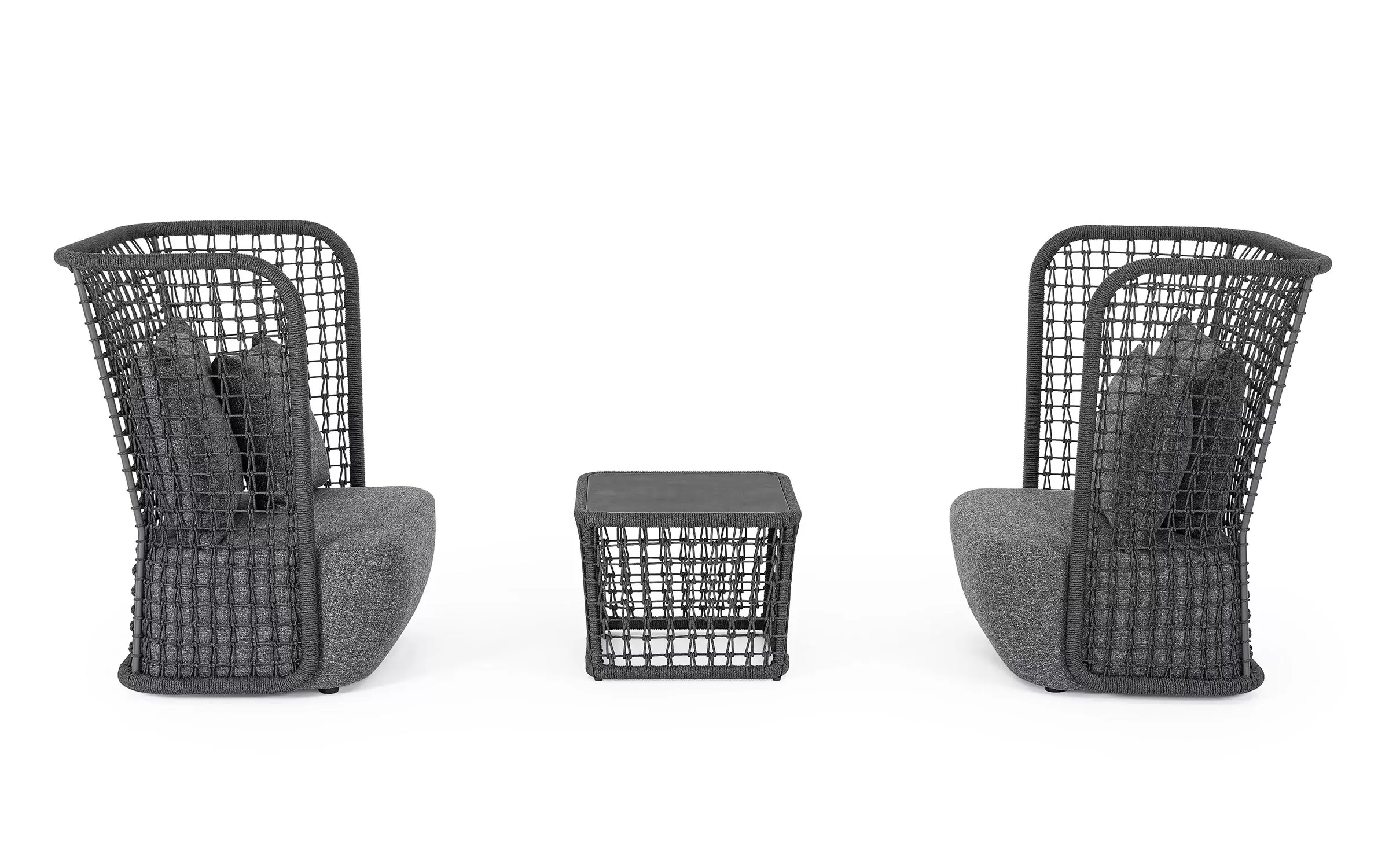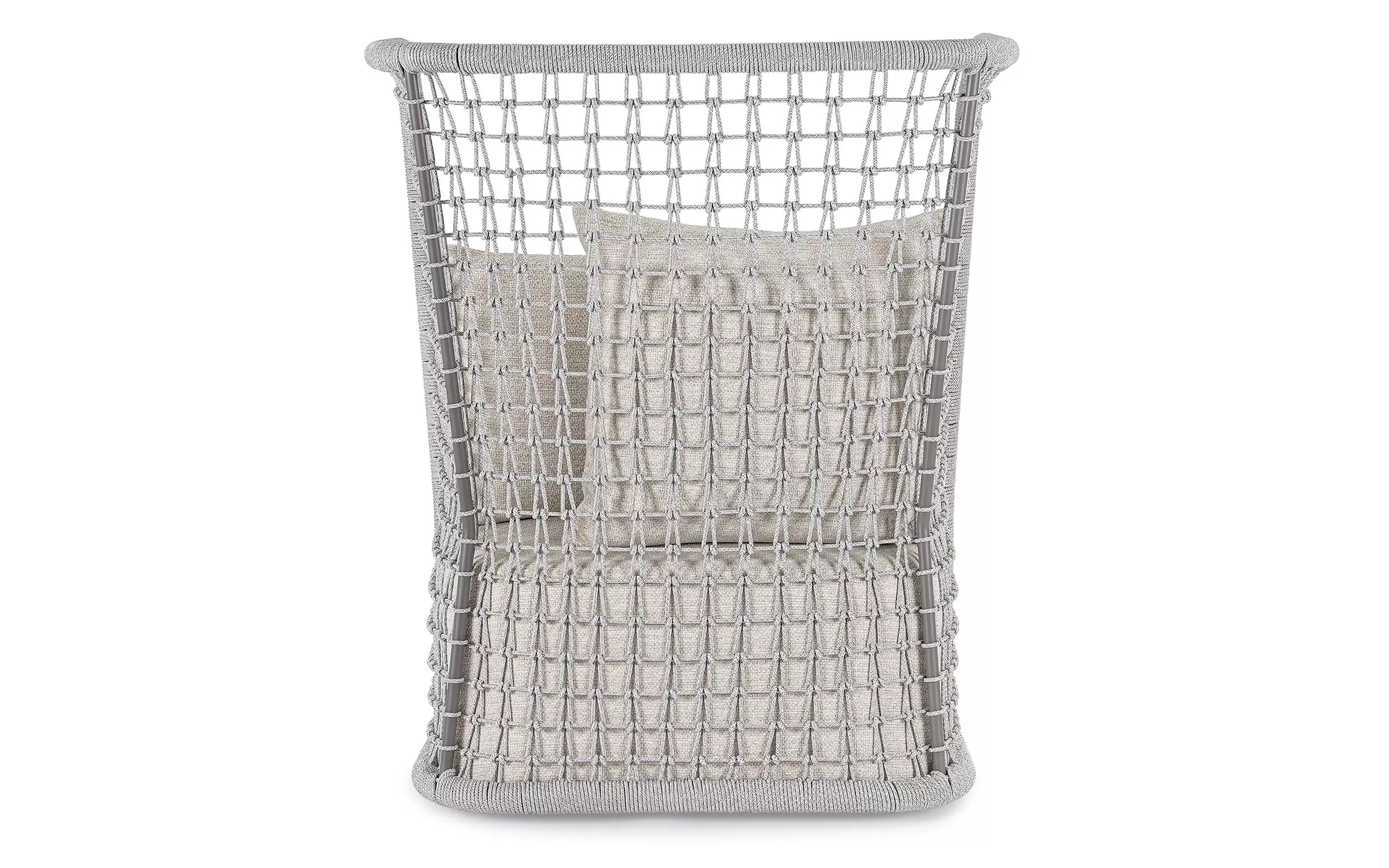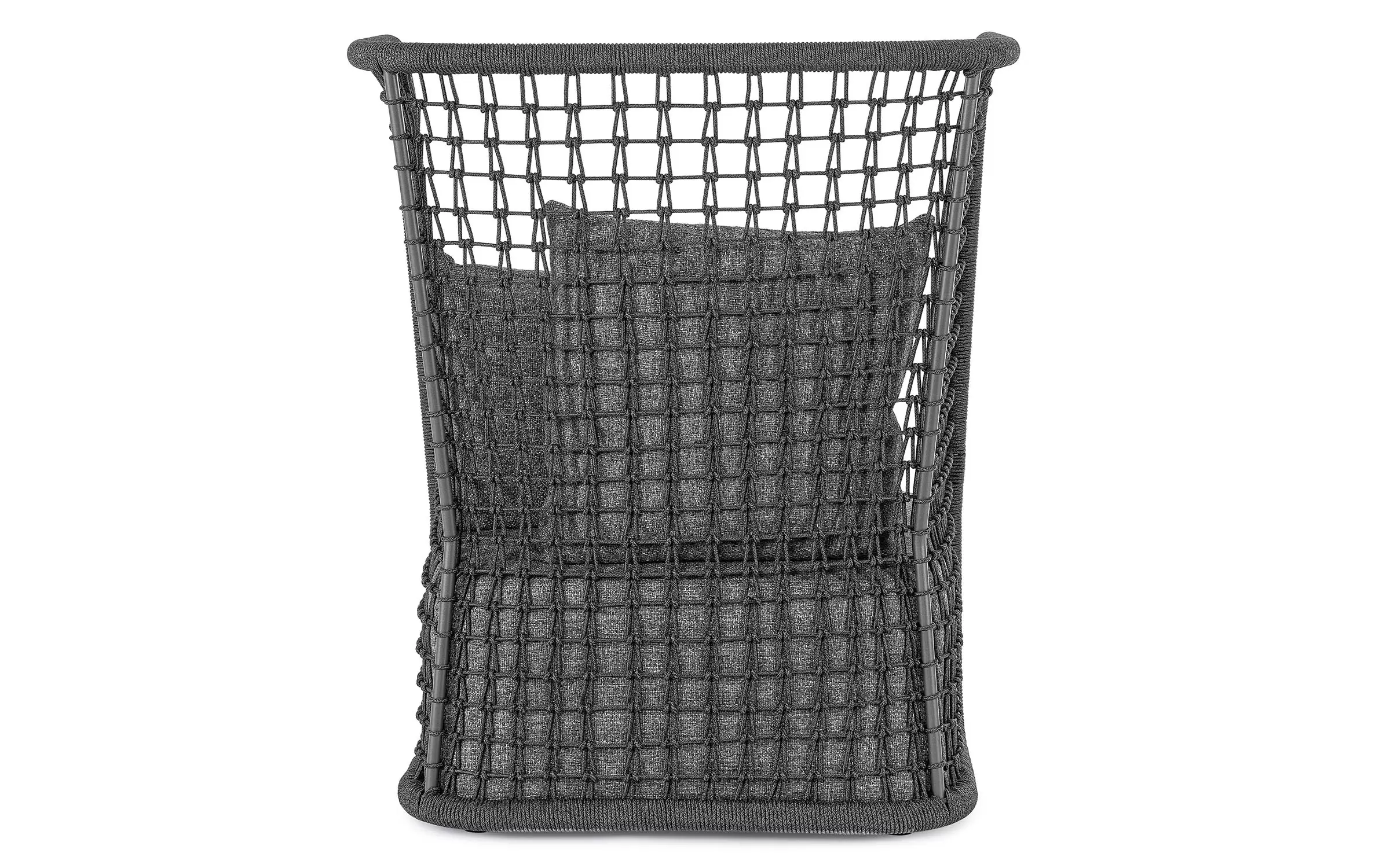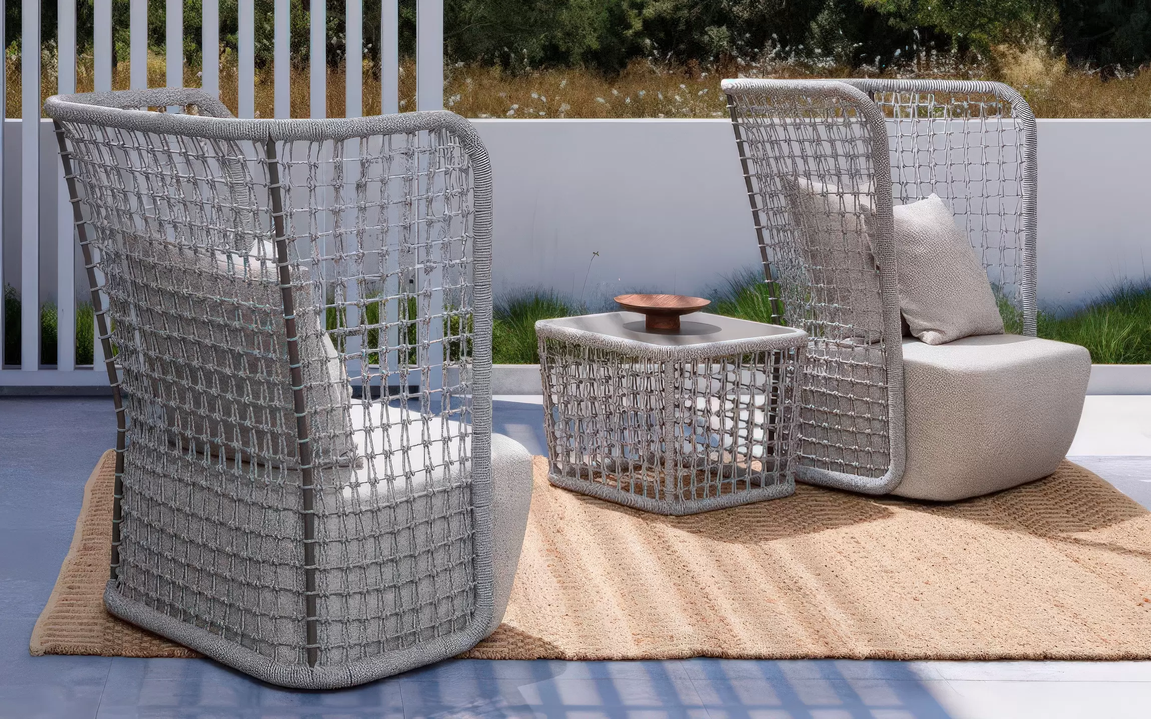 Wysoki fotel ogrodowy z bardzo gruba poduszką siedziska i jaśkami na oparciu. Niespotykany styl wyznacza wysokie oparcie z plecionką z liny polipropylenowej.