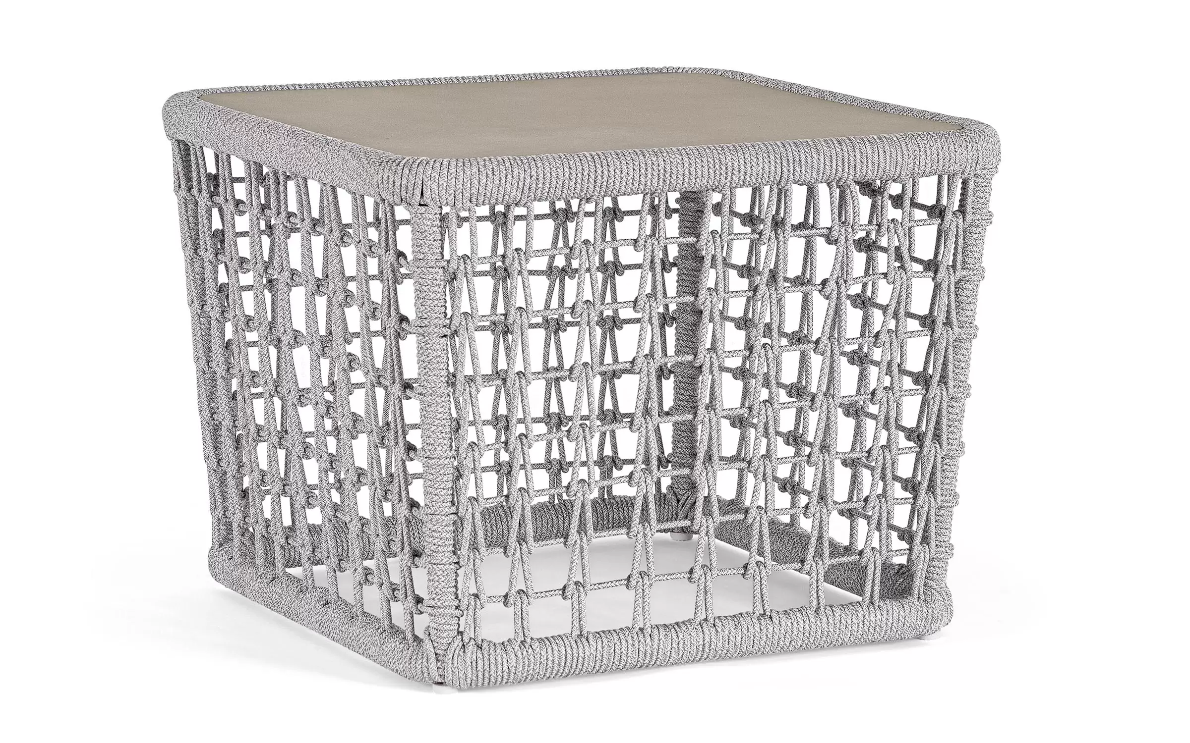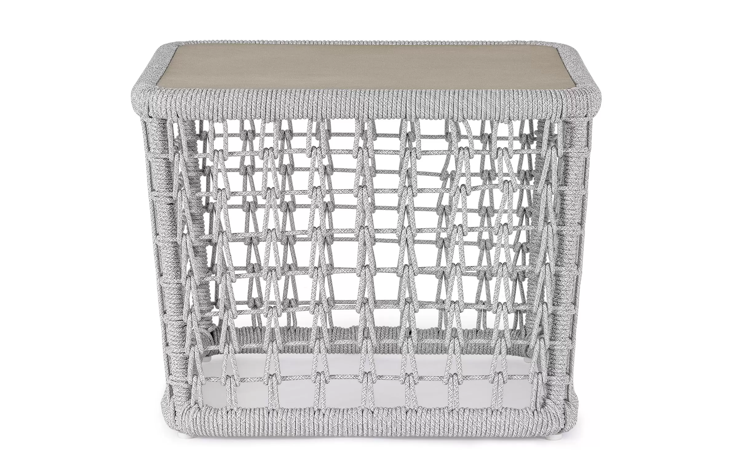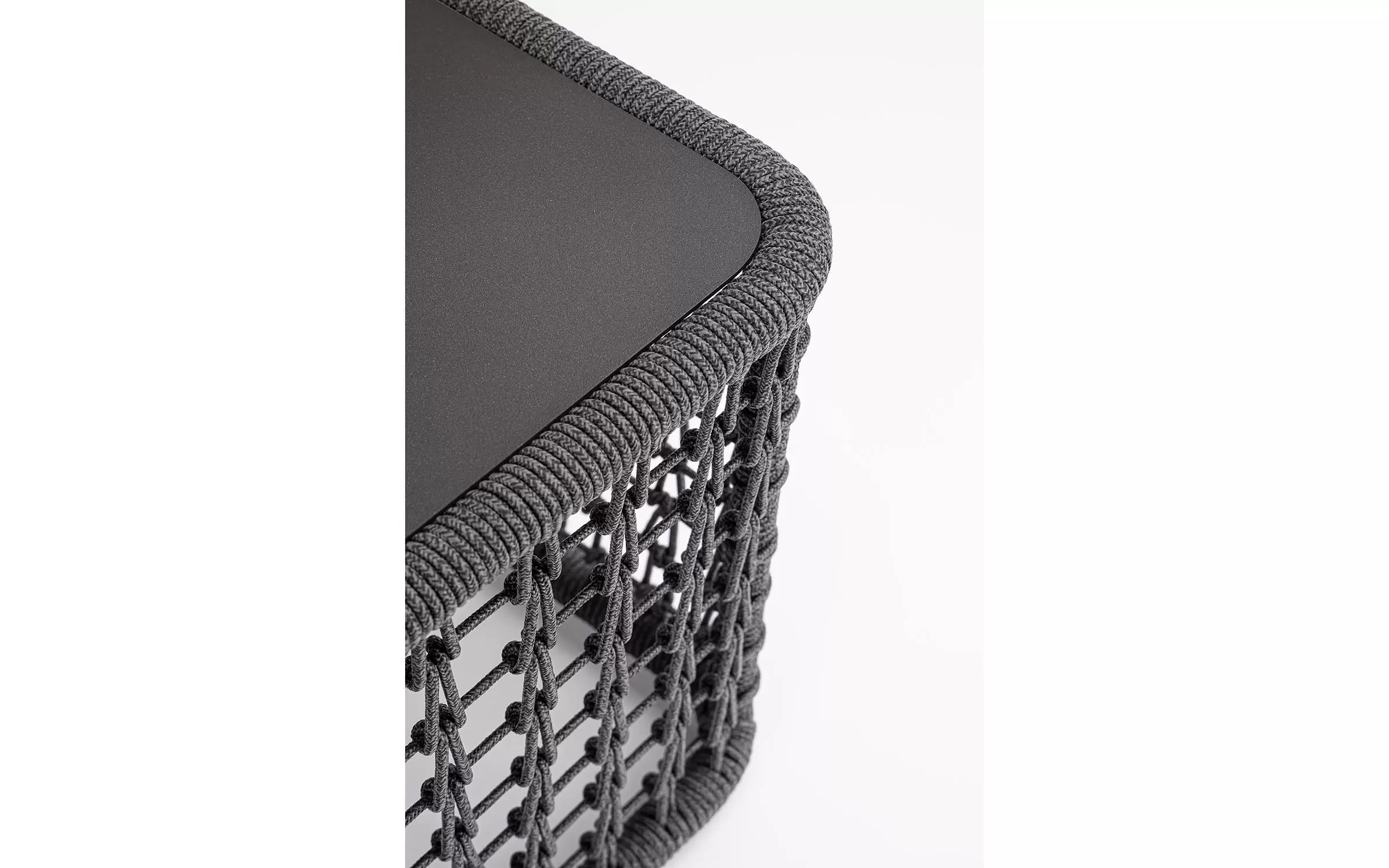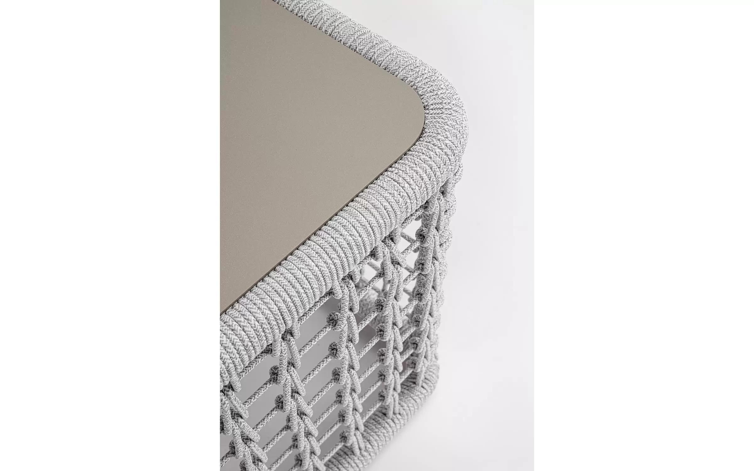 Wysoki fotel ogrodowy z bardzo gruba poduszką siedziska i jaśkami na oparciu. Niespotykany styl wyznacza wysokie oparcie z plecionką z liny polipropylenowej.
