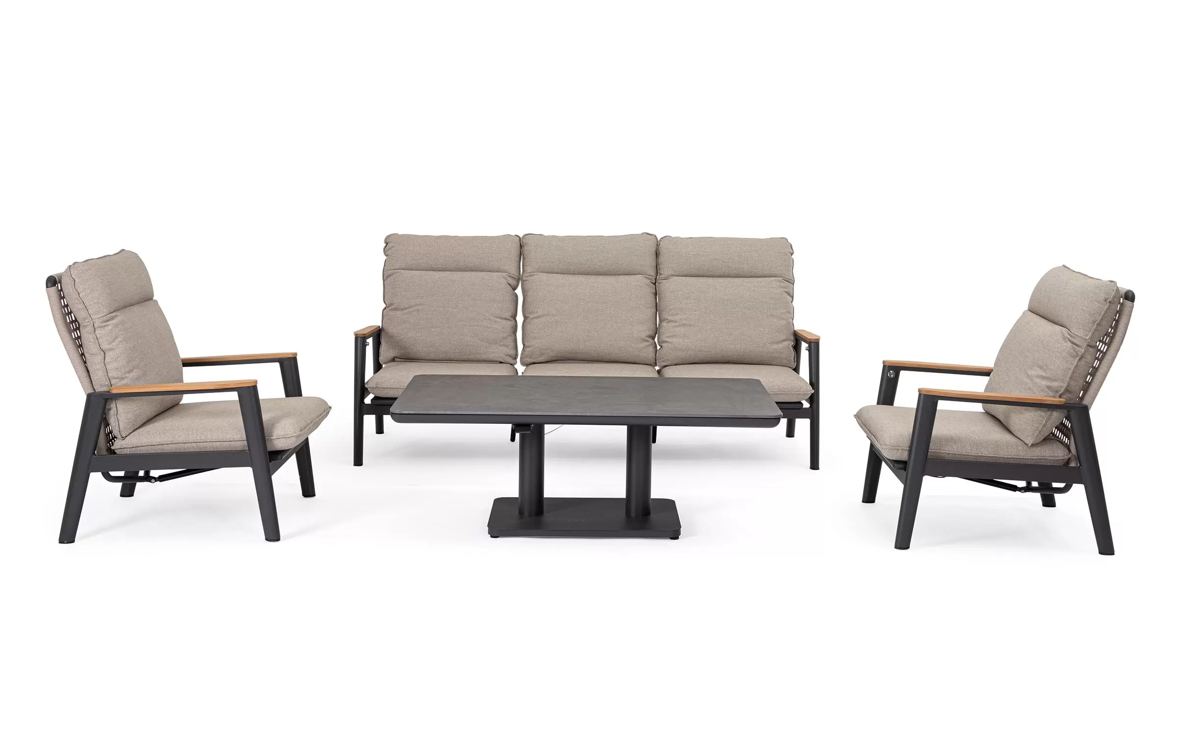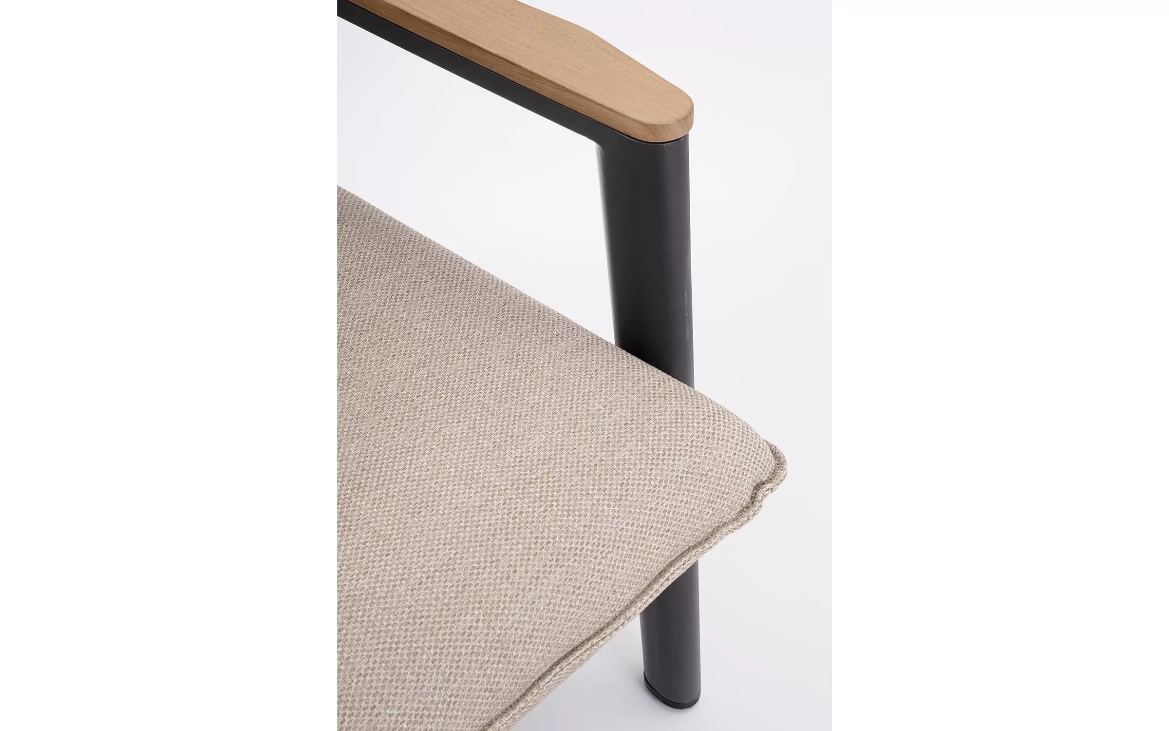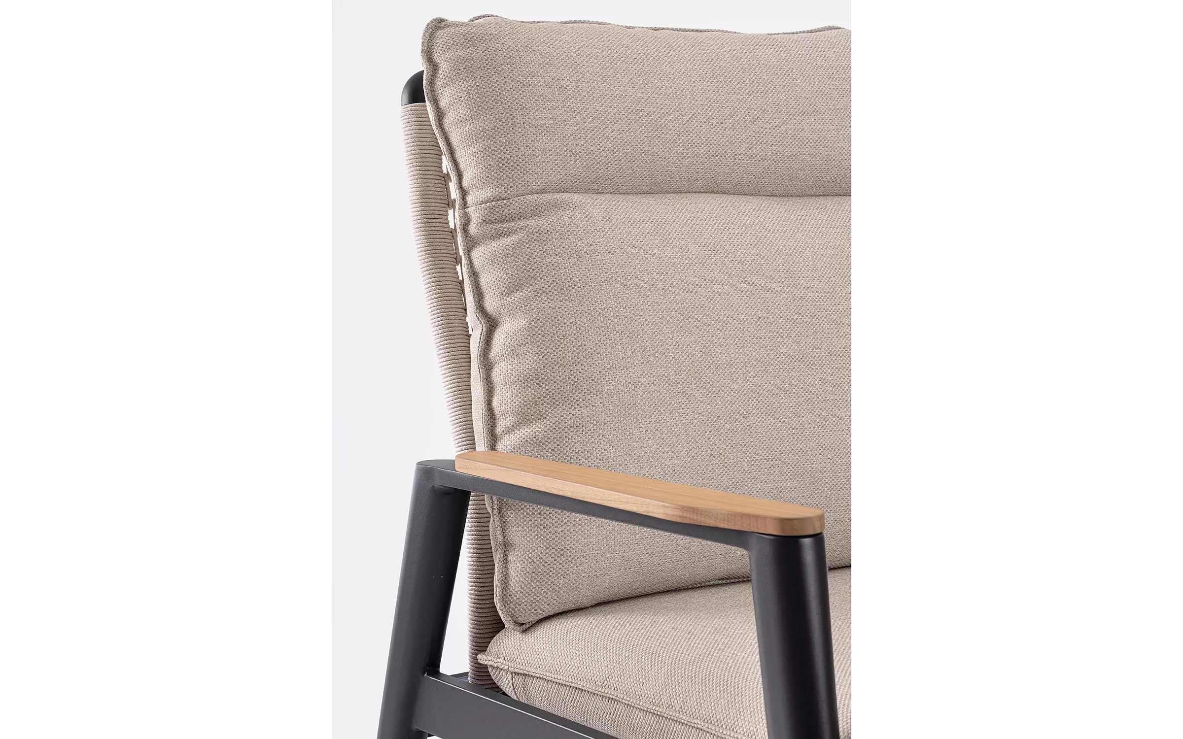 Fotel posiada podłokietniki z drewna teakowego. Siedzisko fotela z tekstyliny. Oparcia pięknie wyplatane z beżowej liny polipropylenowej odpornej na warunki atmosferyczne.