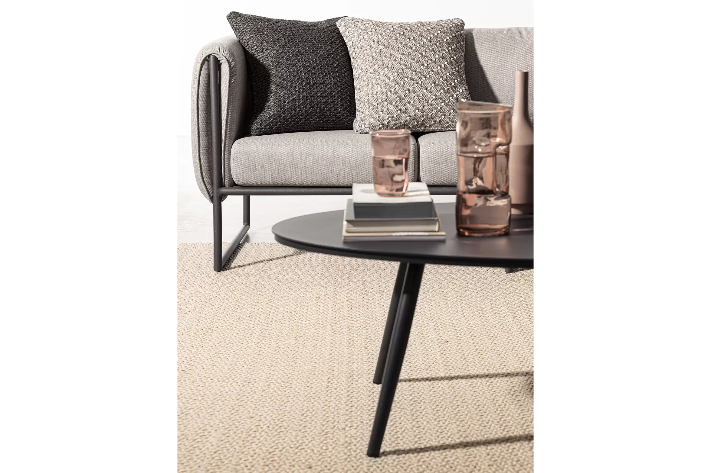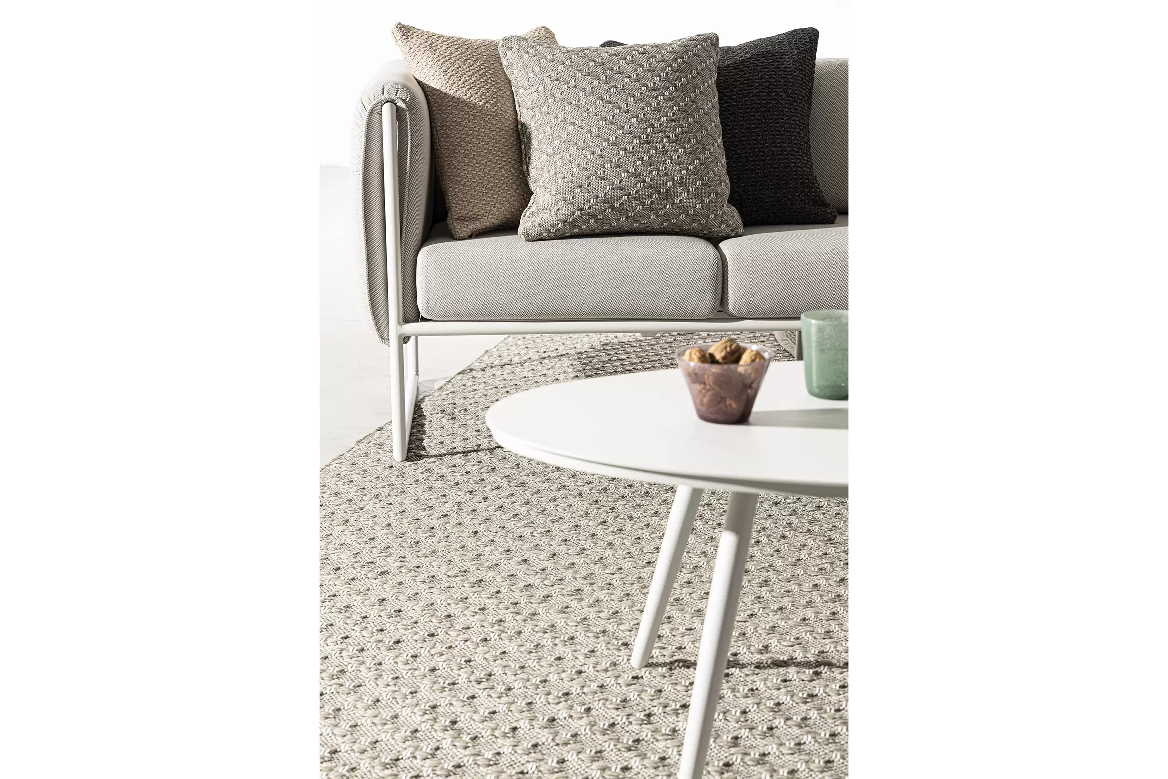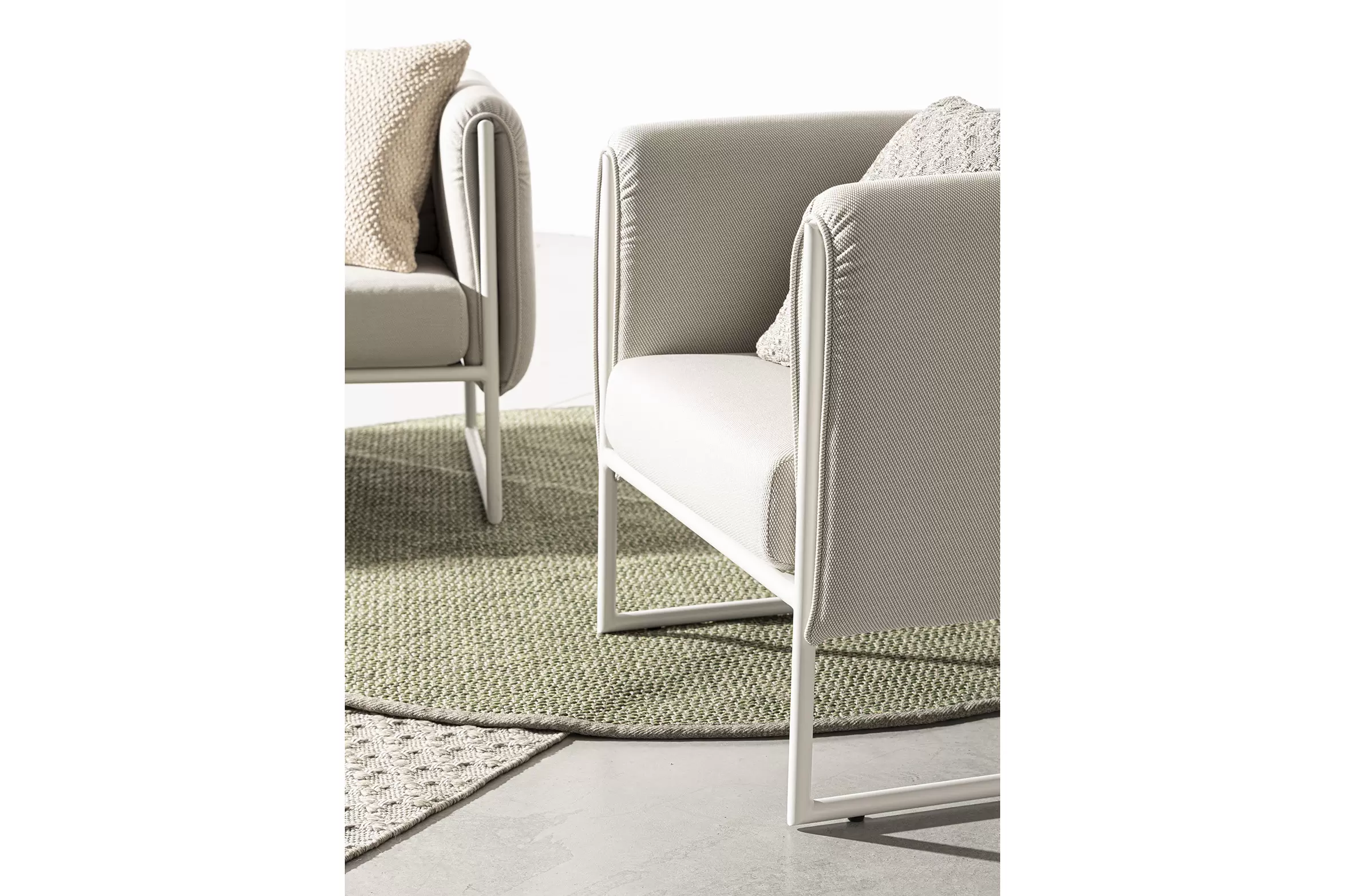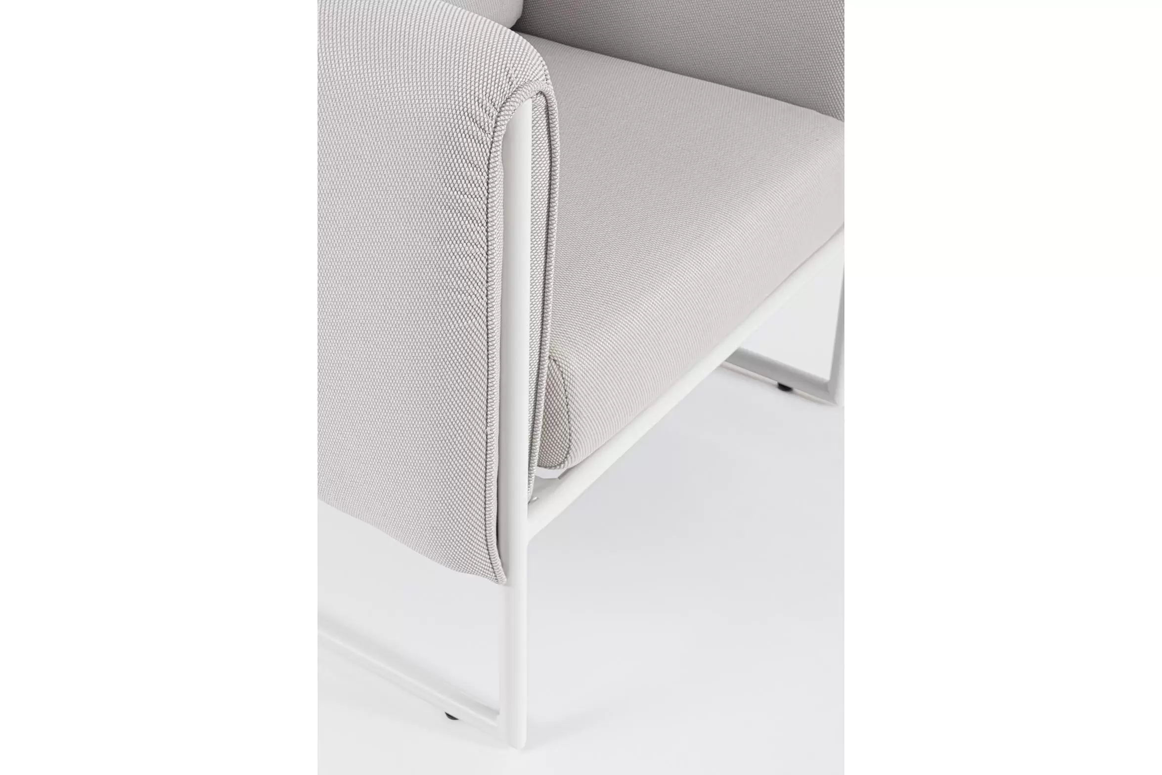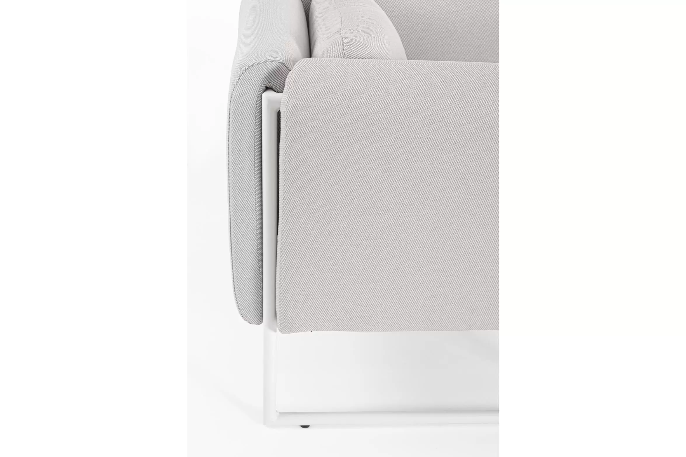 Poduszki na oparciu ze zdejmowalną poszewką z materiału Olefin identycznego jak użyty do obicia siedzisk i boków.