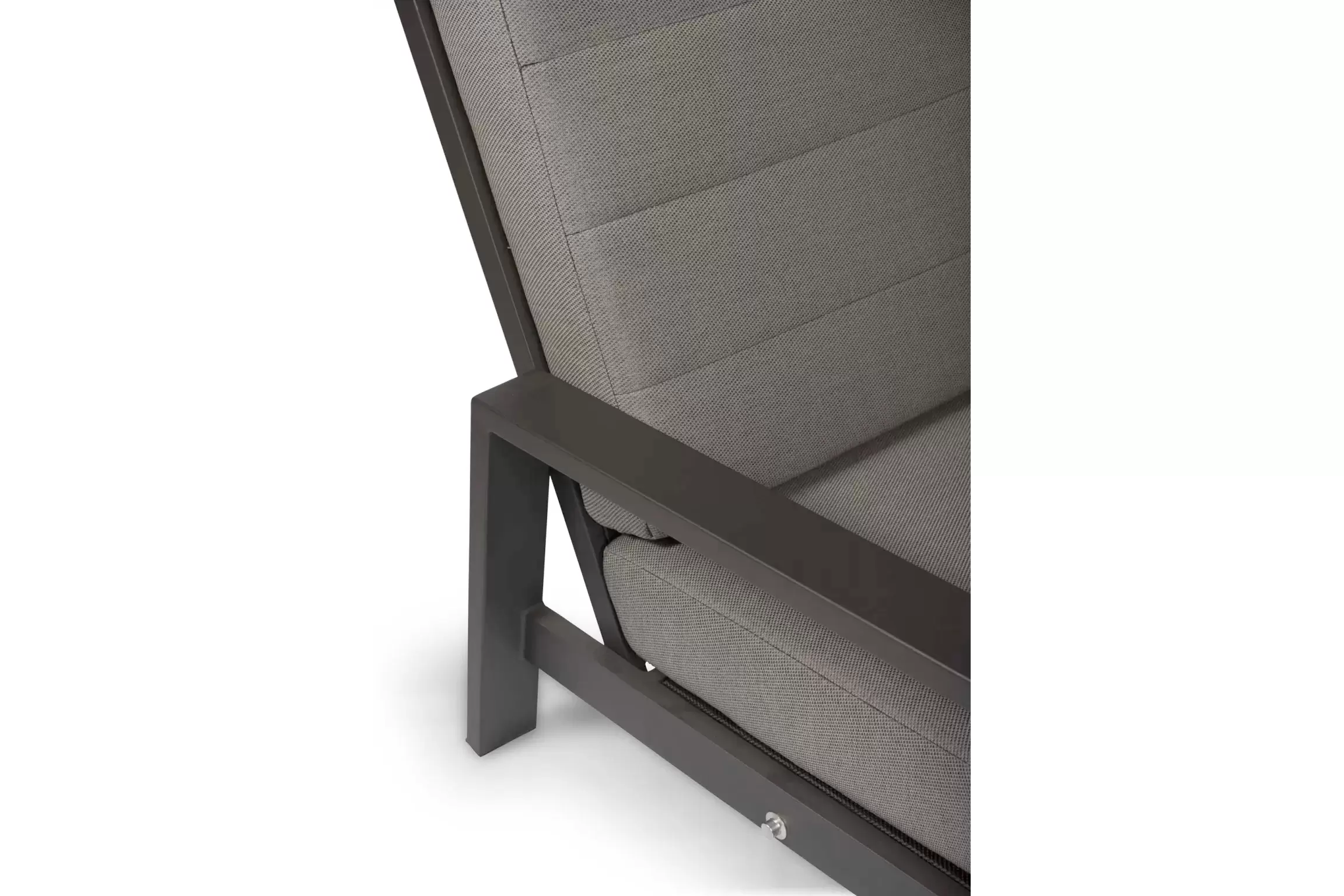 Konstrukcja aluminiowa malowana proszkowo na kolor ciemnoszary. Siedzisko pod poduszką z grubej tekstyliny. Oparcie z poprzecznych listew aluminiowych.