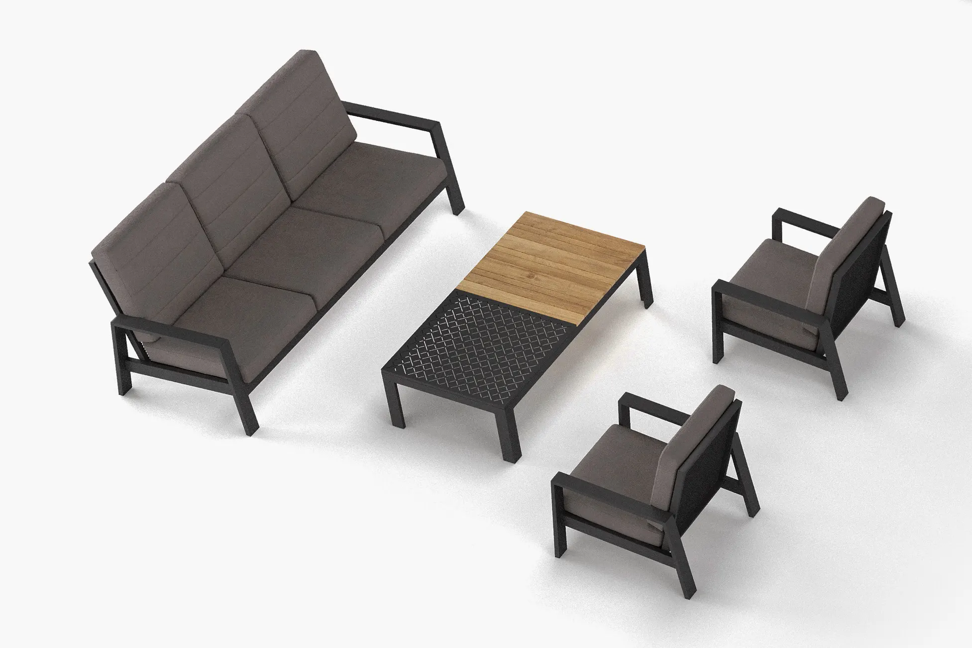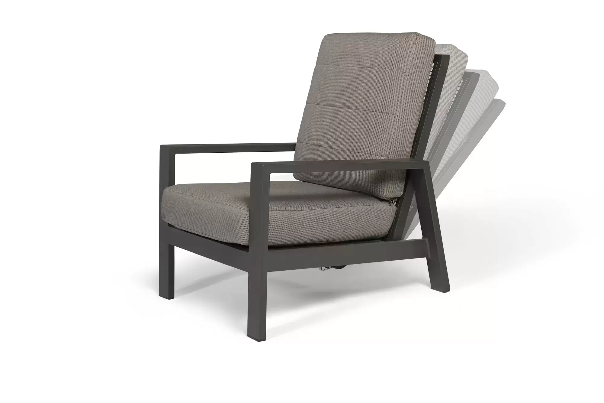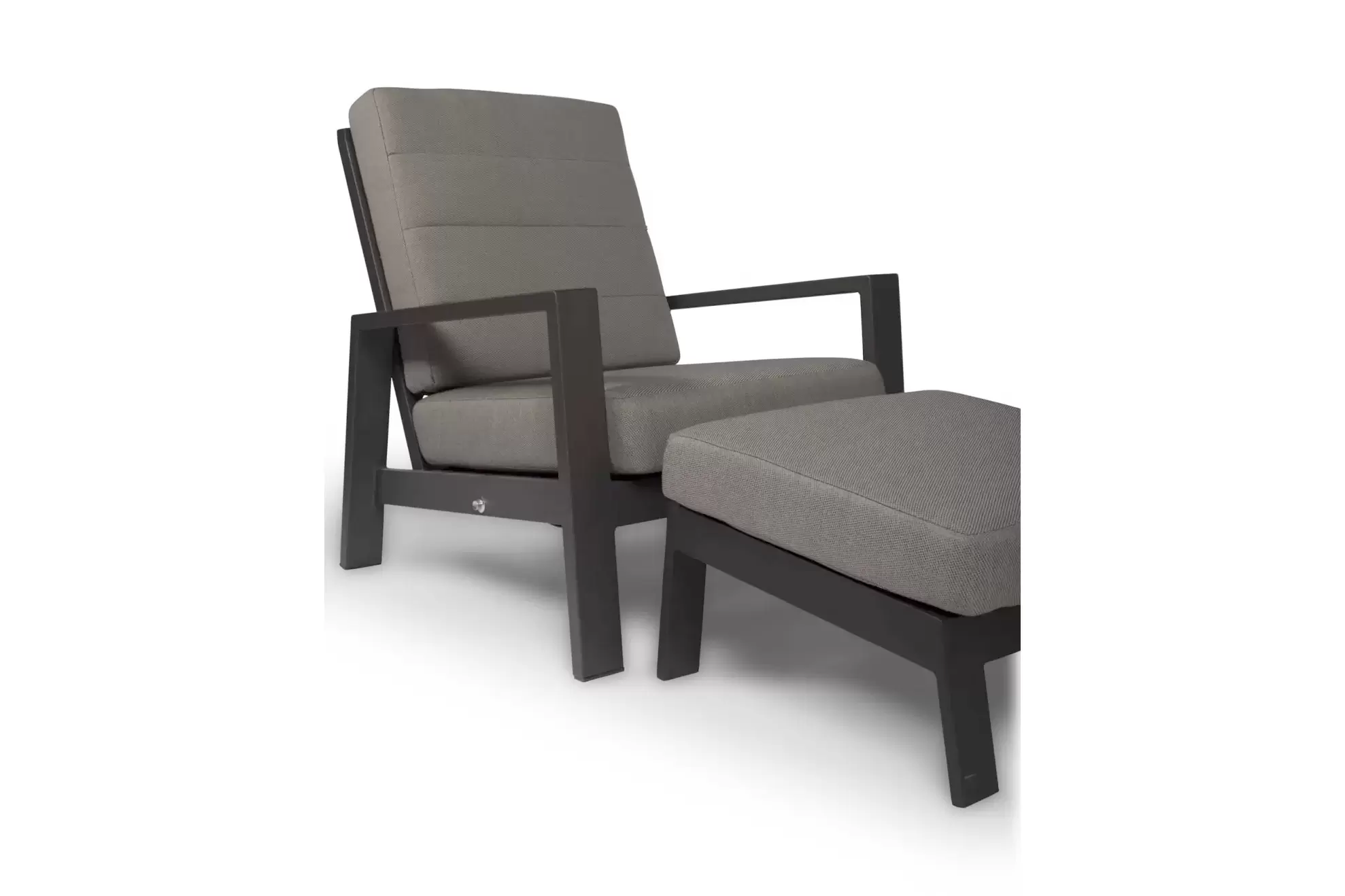 Nowoczesny fotel ogrodowy o aluminiowej konstrukcji z wygodnymi poduszkami wodoodpornymi z poszewkami z materiału Olefin w kolorze SZARYM lub CIEMNOSZARYM (prawie czarnym).