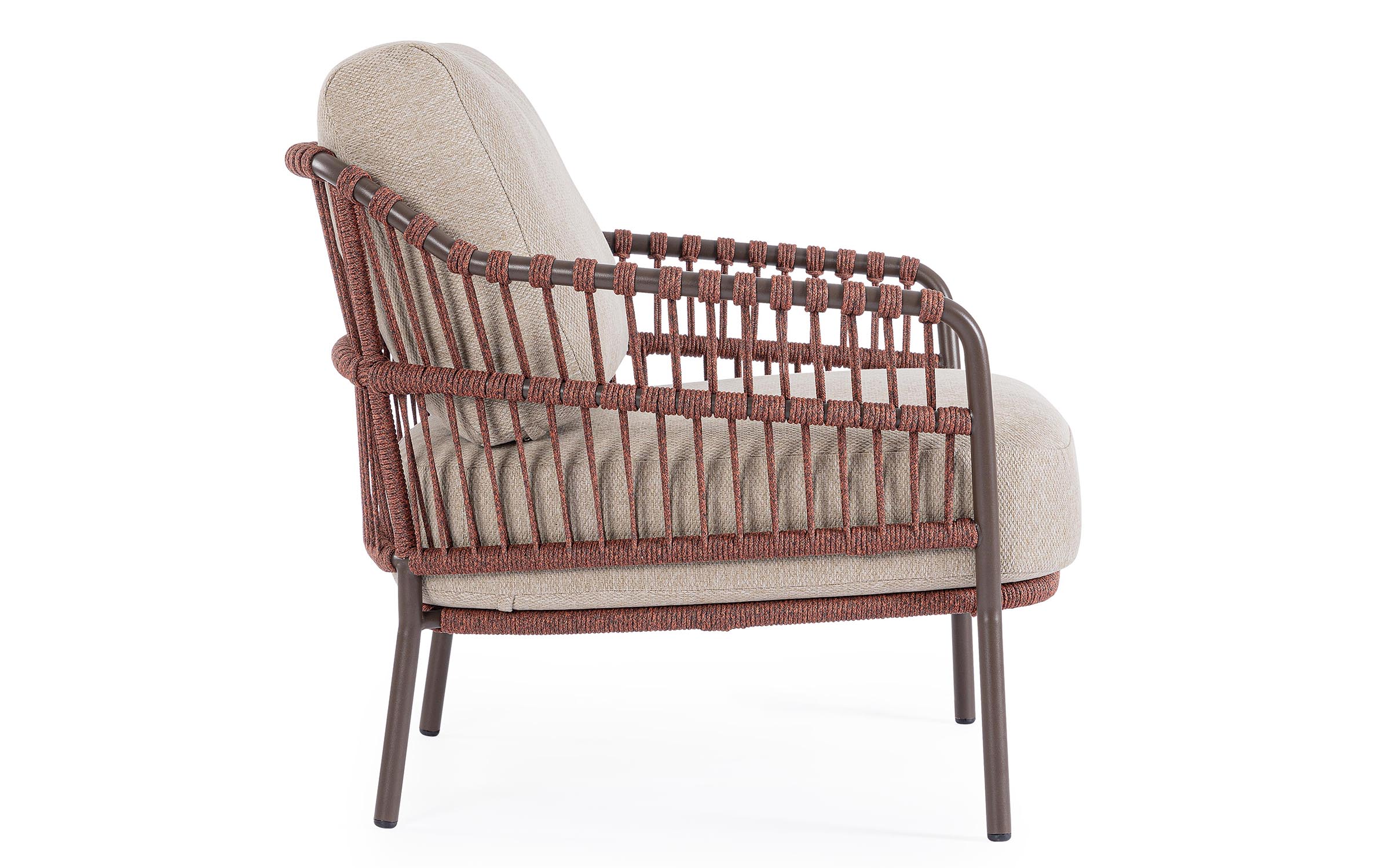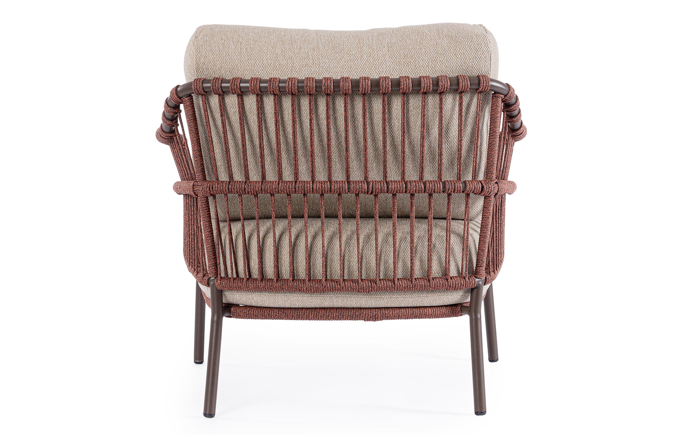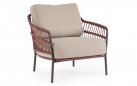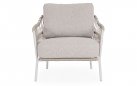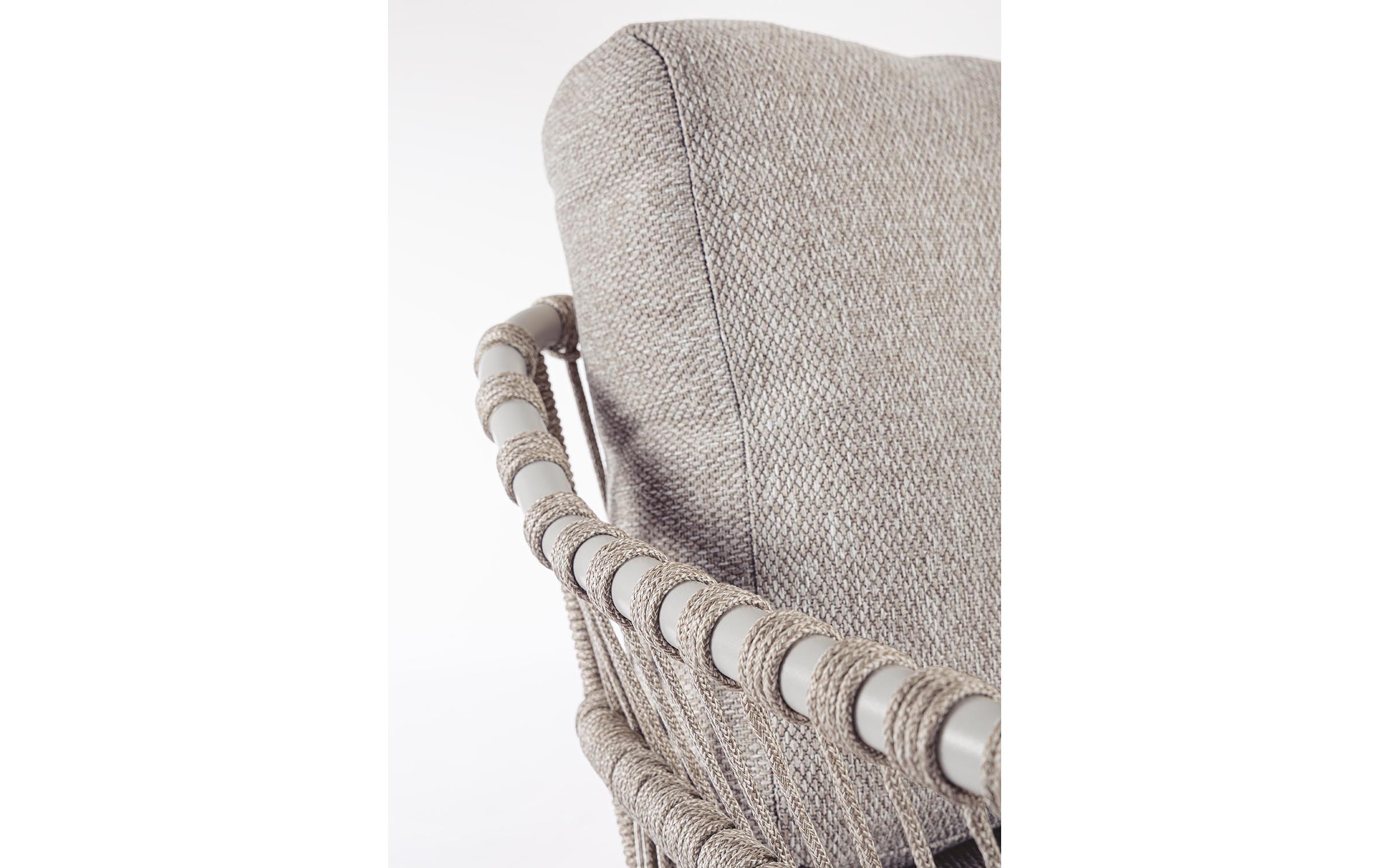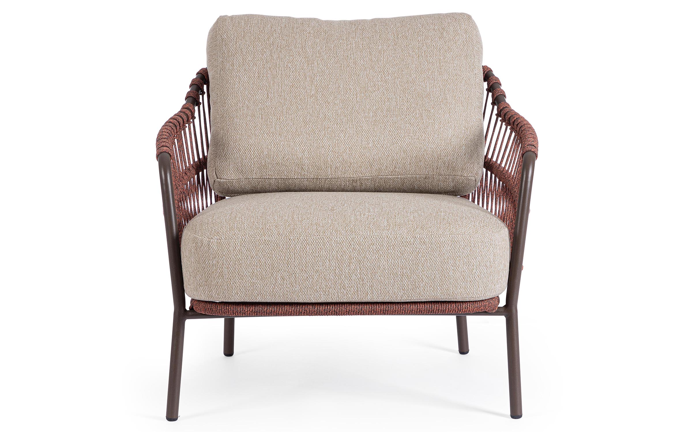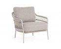 Nowoczesny fotel ogrodowy Talaia na nowoczesny taras. Konstrukcja ze stali nierdzewnej w malowaniu proszkowym opleciona lekkim oplotem z liny polipropylenowej.