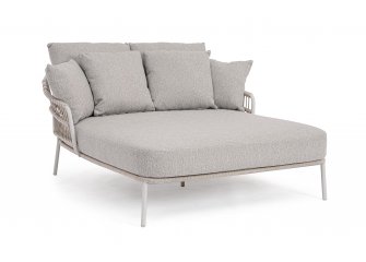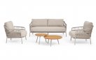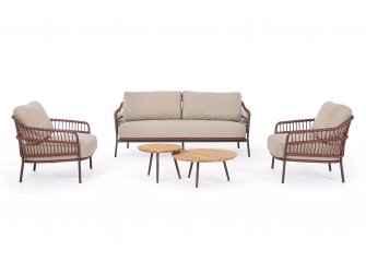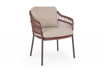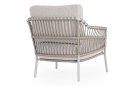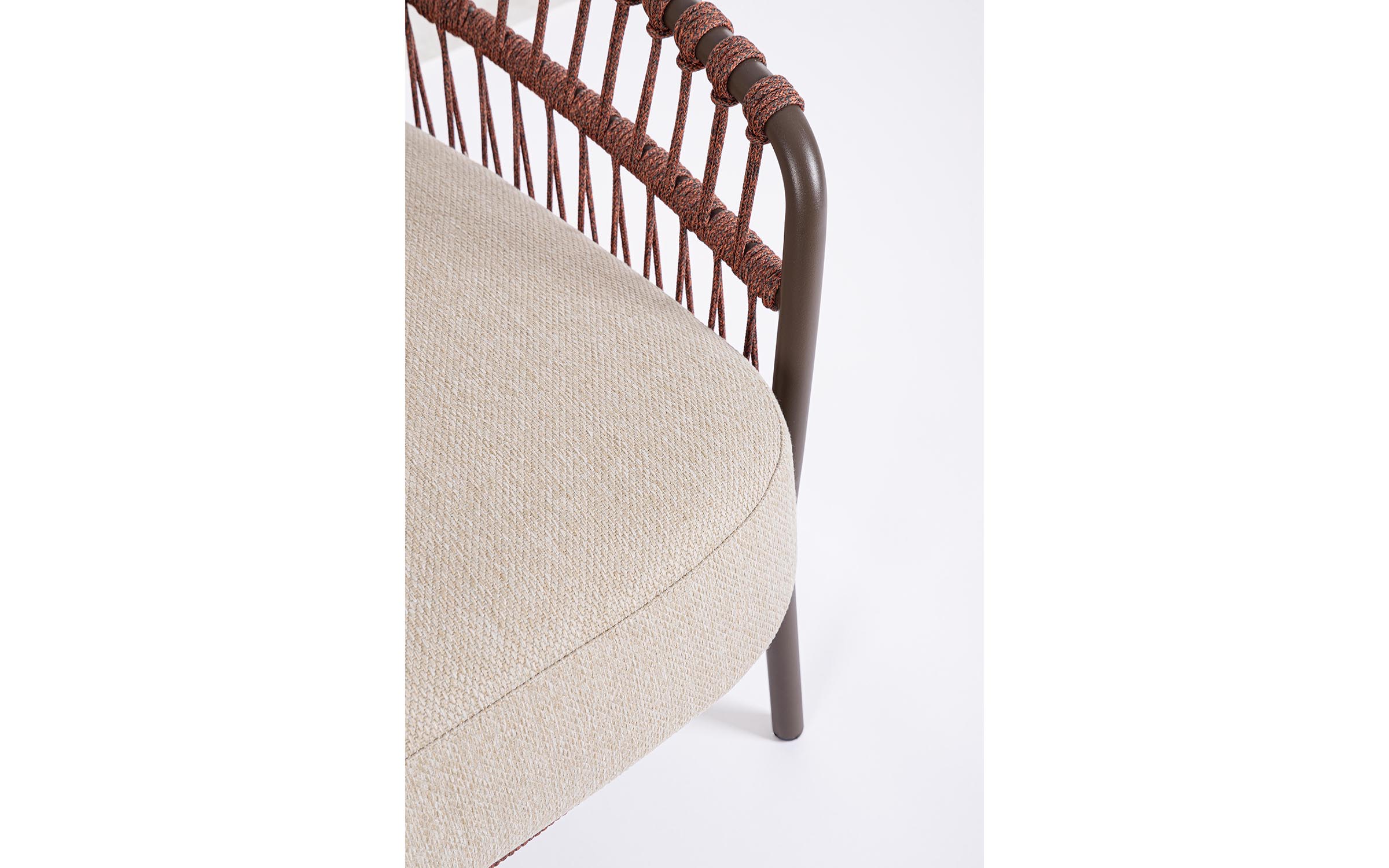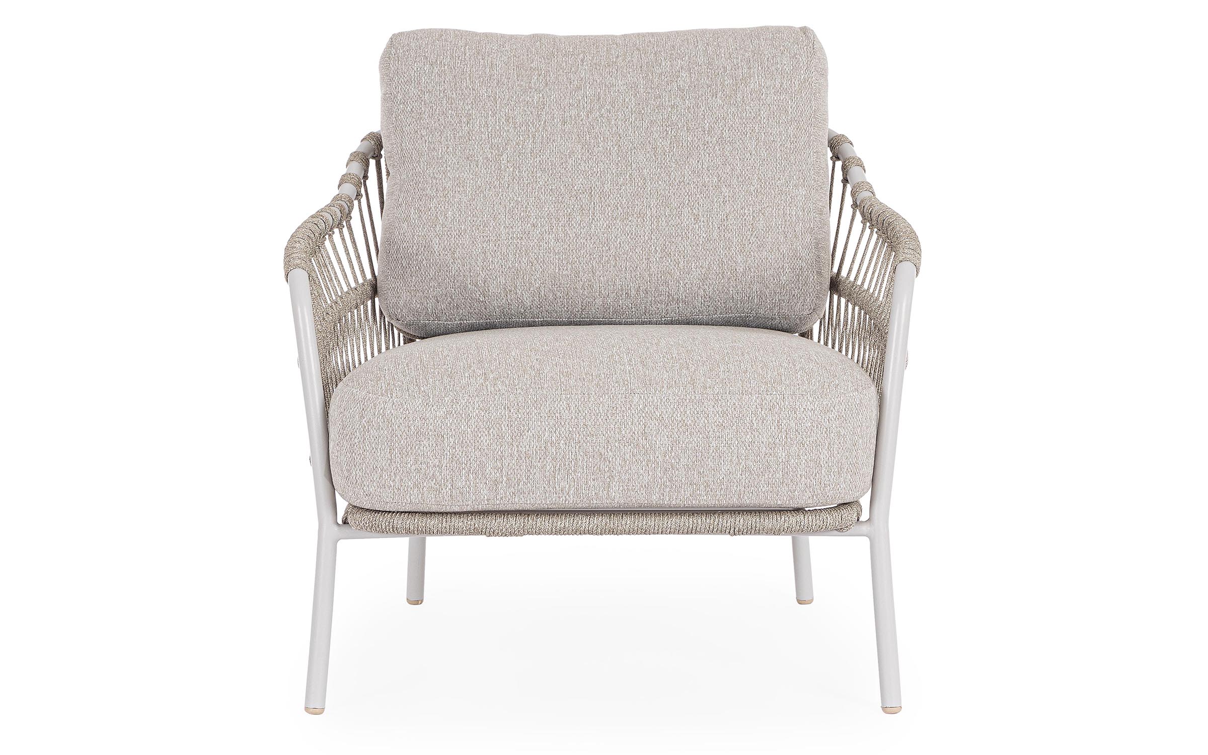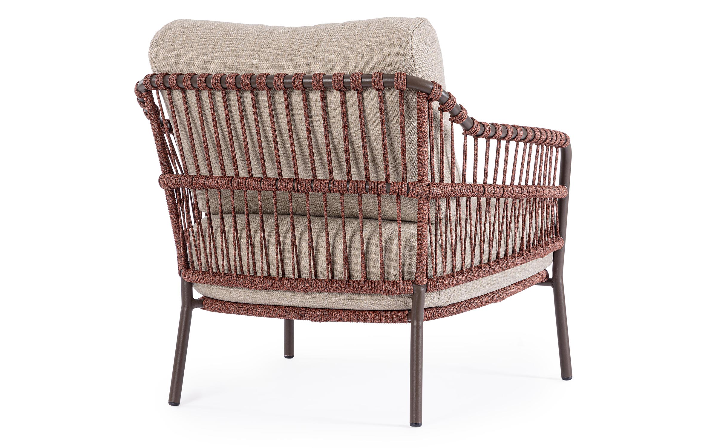 Nowoczesny fotel ogrodowy Talaia na nowoczesny taras. Konstrukcja ze stali nierdzewnej w malowaniu proszkowym opleciona lekkim oplotem z liny polipropylenowej.