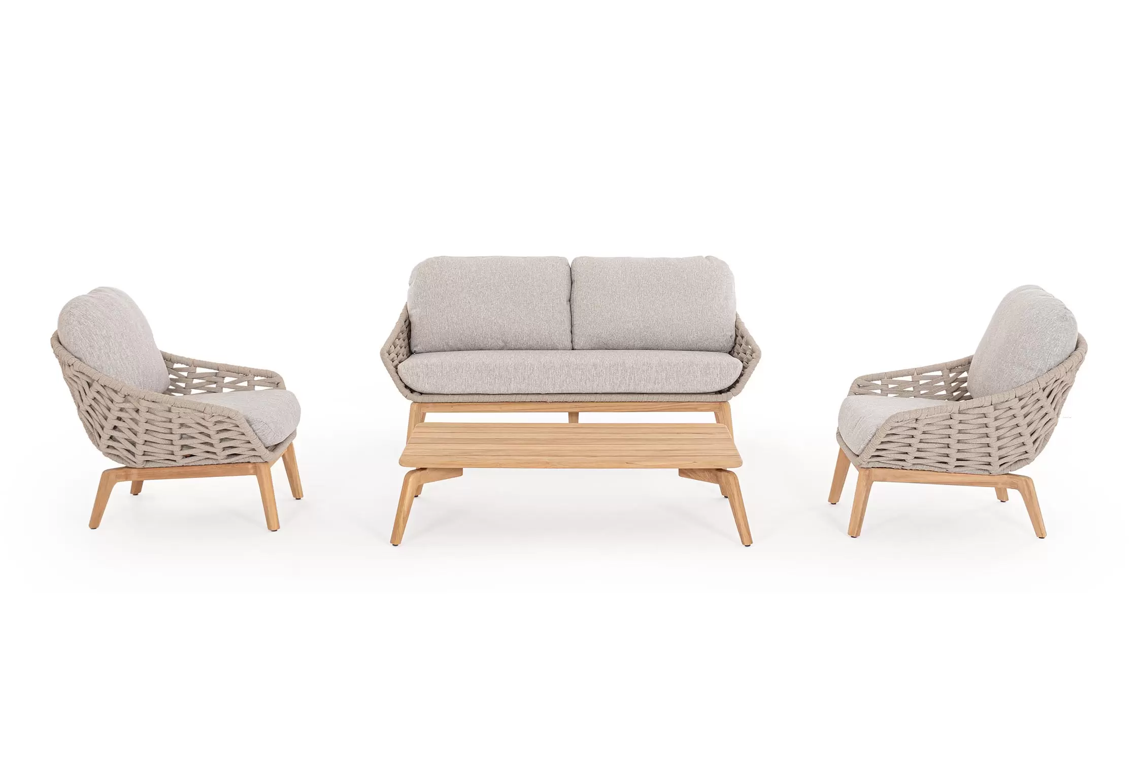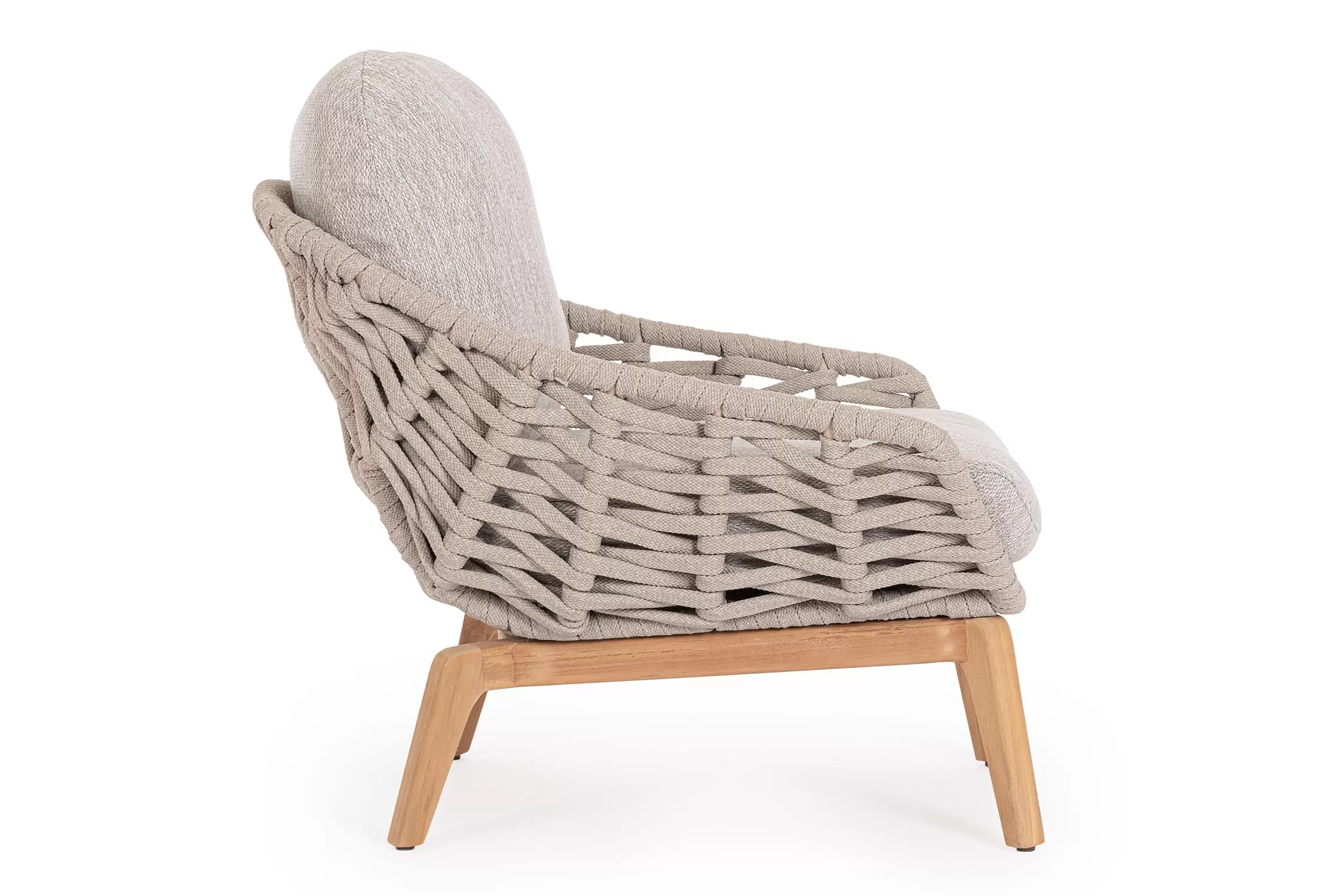 Luksusowy fotel wypoczynkowy na taras. Podstawa z drewna teak. Oparcie o konstrukcji aluminiowej z plecionką z liny polipropylenowej. Poduszki szybkoschnące z poszewkami z materiału Olefin.