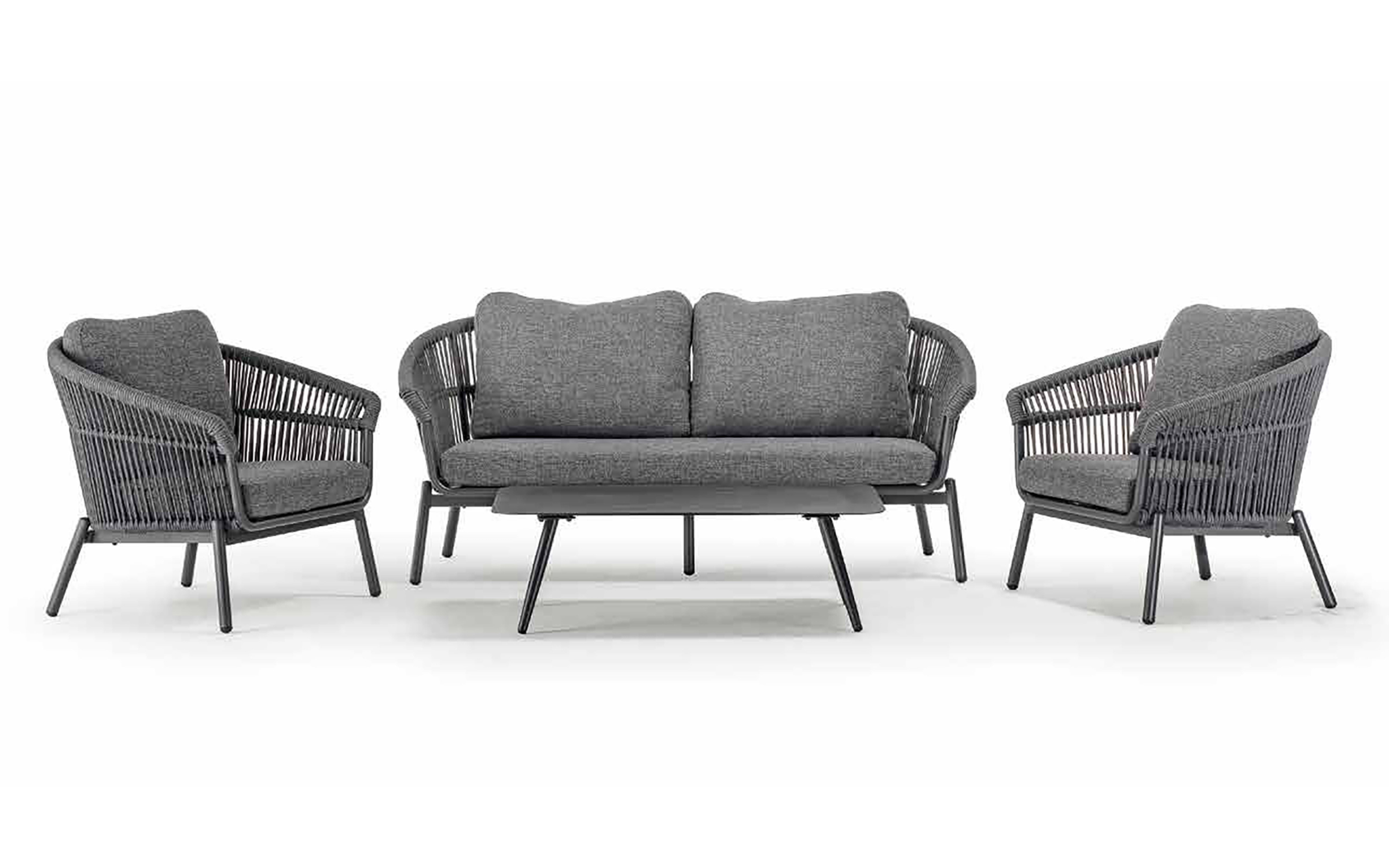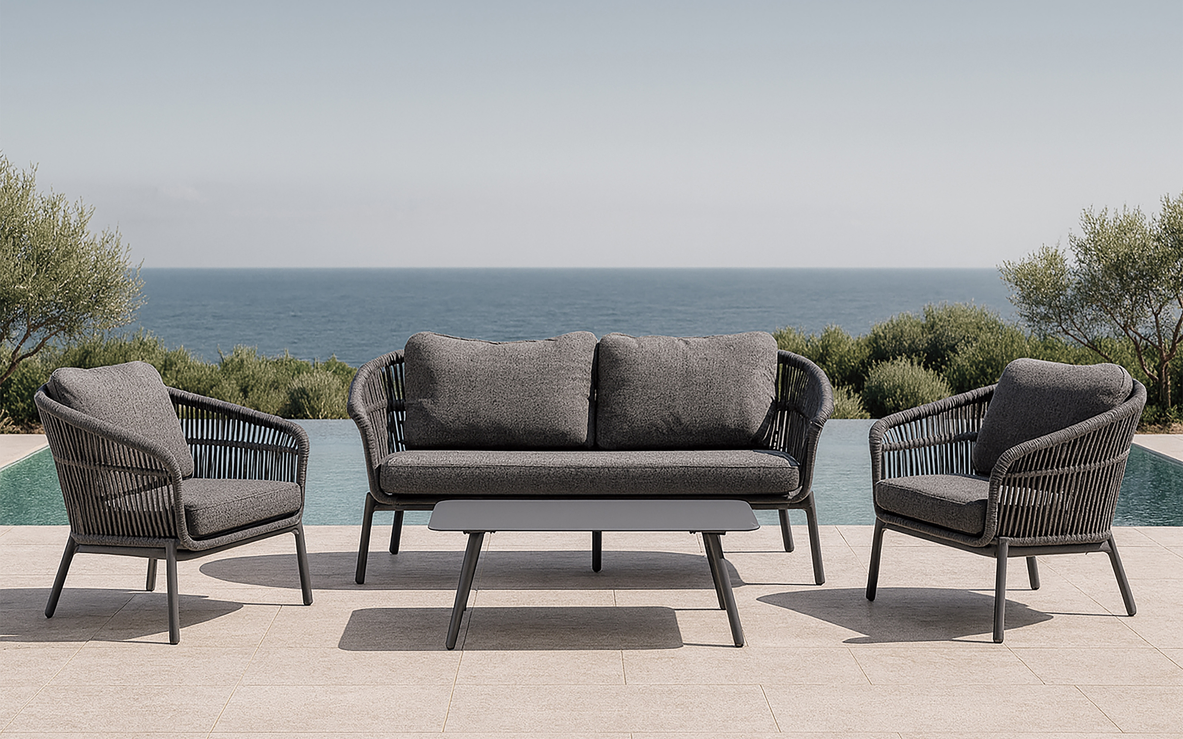 Komplet wypoczynkowy Tropea by Grattoni to idealna propozycja dla osób poszukujących harmonii między luksusowym designem a codzienną funkcjonalnością. W skład tego stylowego zestawu wchodzi komfortowa sofa dwuosobowa, dwa głębokie fotele oraz lekki, aluminiowy stolik kawowy, tworząc idealne miejsce do celebrowania chwil przy kawie czy chłodnych napojach.
