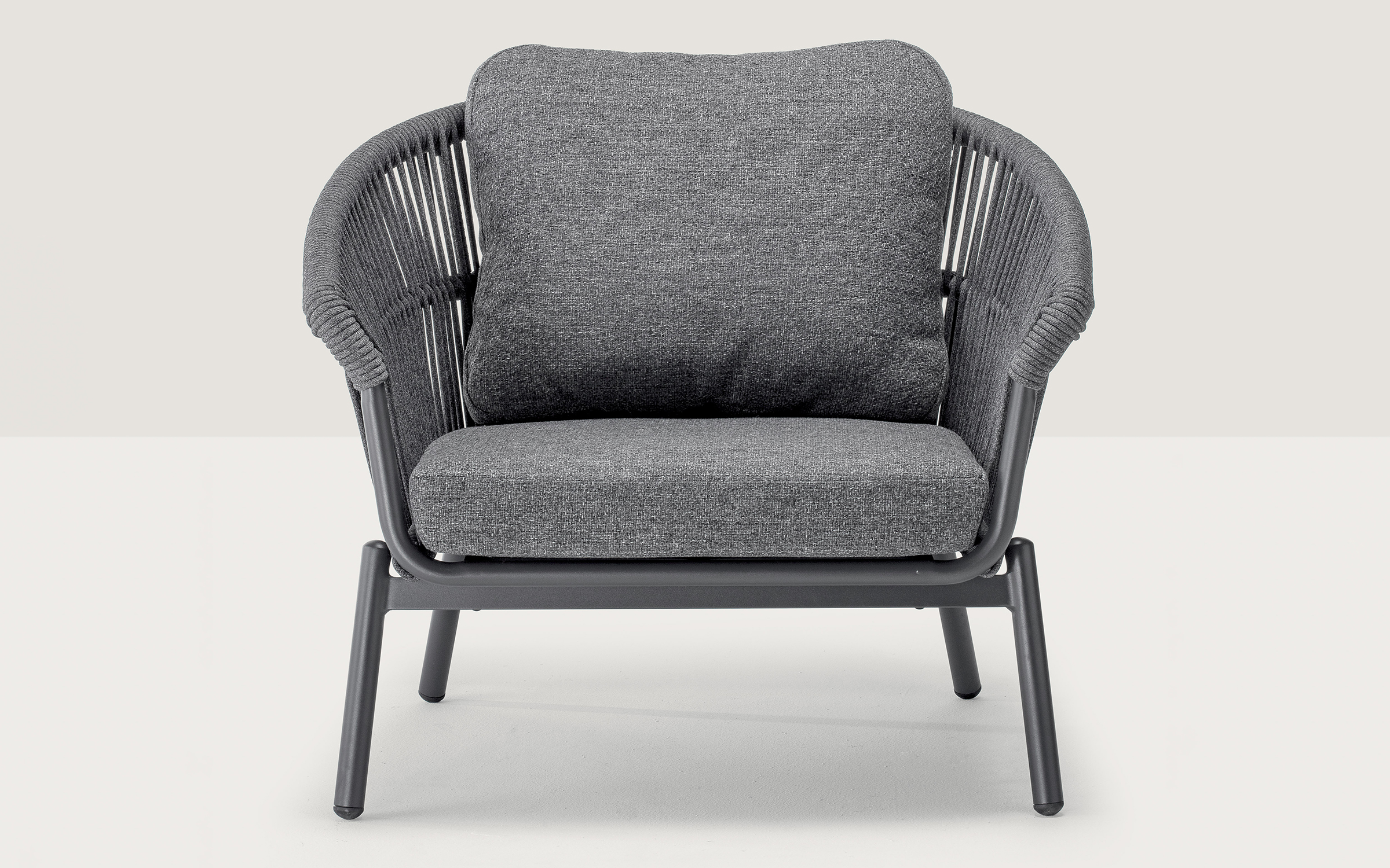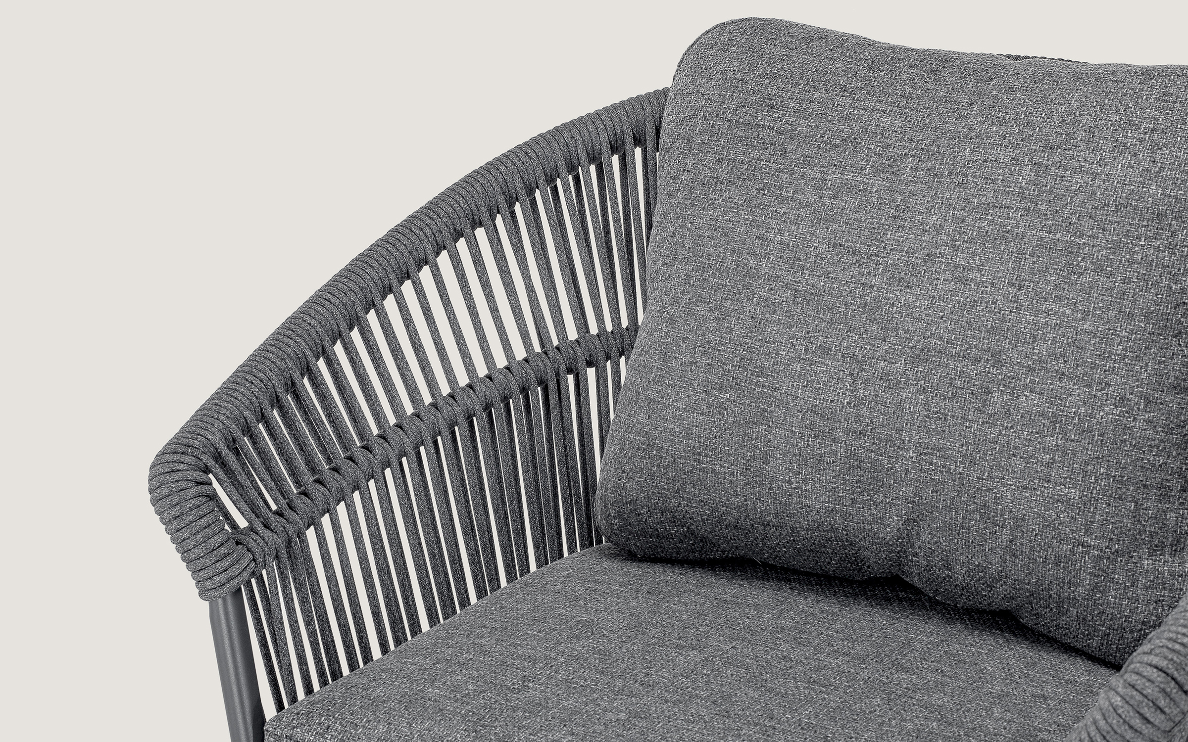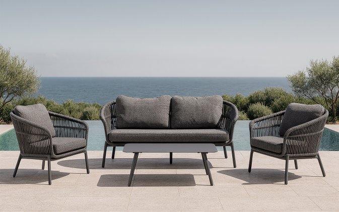 Siedziska zostały wykończone precyzyjnym plecionym sznurem (rope), który jest w pełni odporny na zmienne warunki pogodowe oraz szkodliwe działanie promieni UV, co zapobiega płowieniu materiału. Stabilność i nowoczesny charakter zapewnia solidna rama z malowanego proszkowo aluminium, która gwarantuje wieloletnią trwałość bez ryzyka korozji. Mimo swojej lekkości, konstrukcja zestawu Tropea jest niezwykle wytrzymała i zaprojektowana tak, by cieszyć oko nieskazitelną estetyką przez wiele sezonów intensywnego użytkowania.