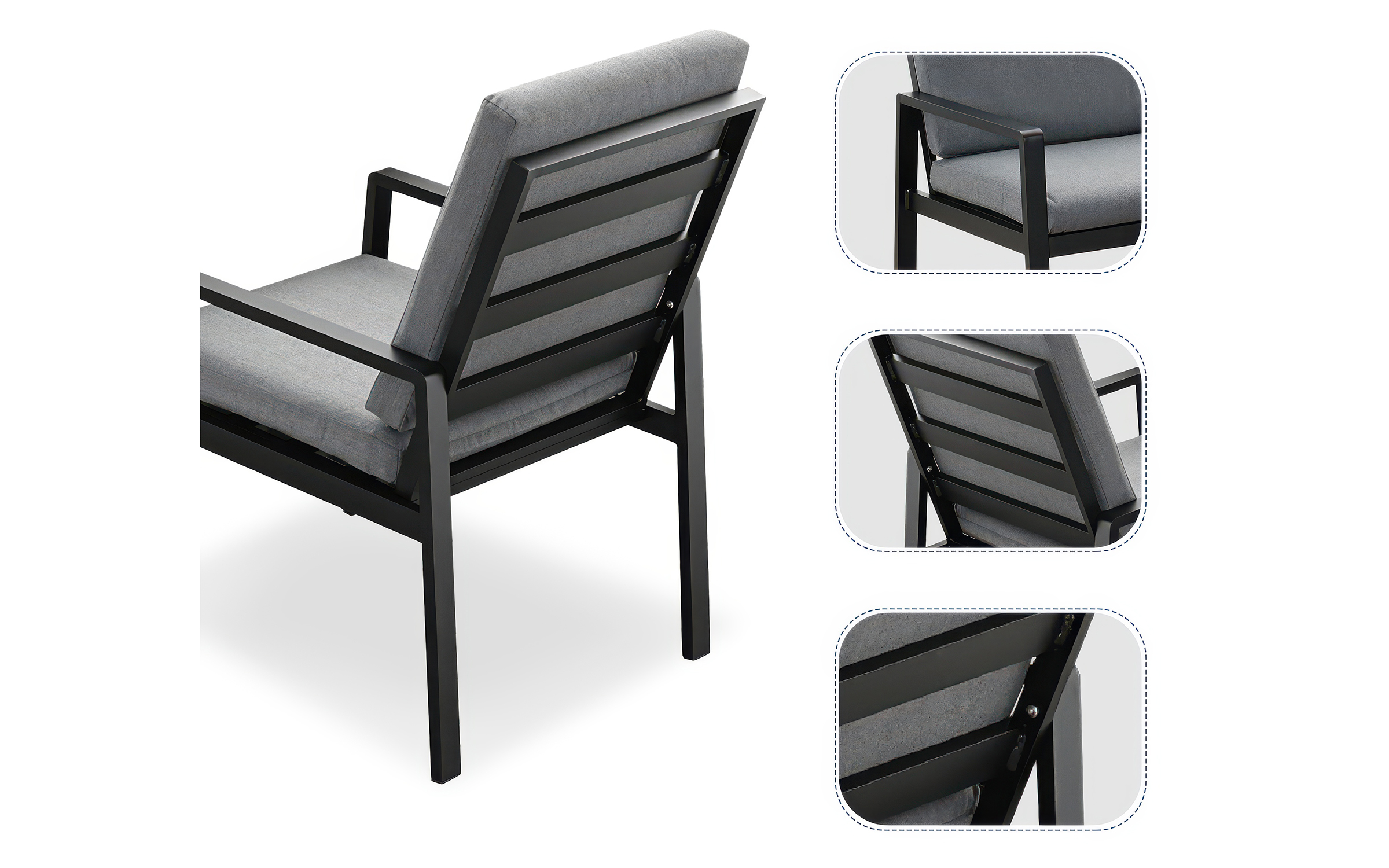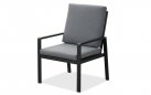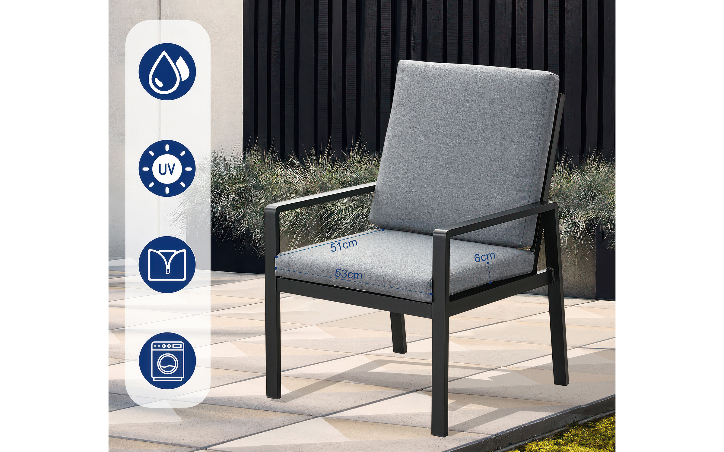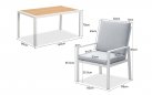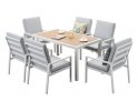 Meble stołowe na taras dla 6 osób wykonany z aluminium. Stół z blatem z deseczek kompozytowych. Na fotelach wodoodporne poduszki ze zdejmowanymi poszewkami.