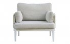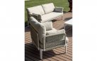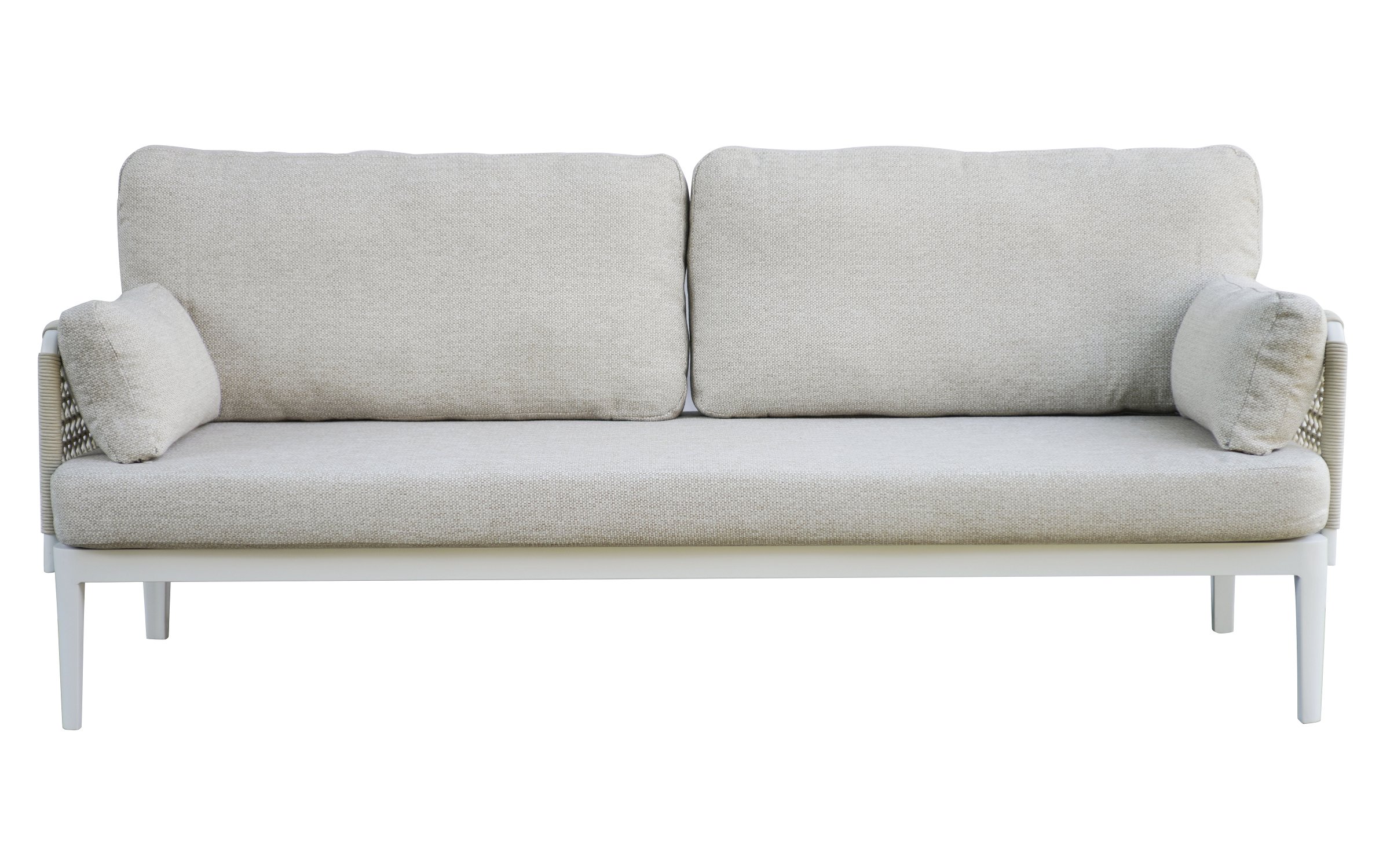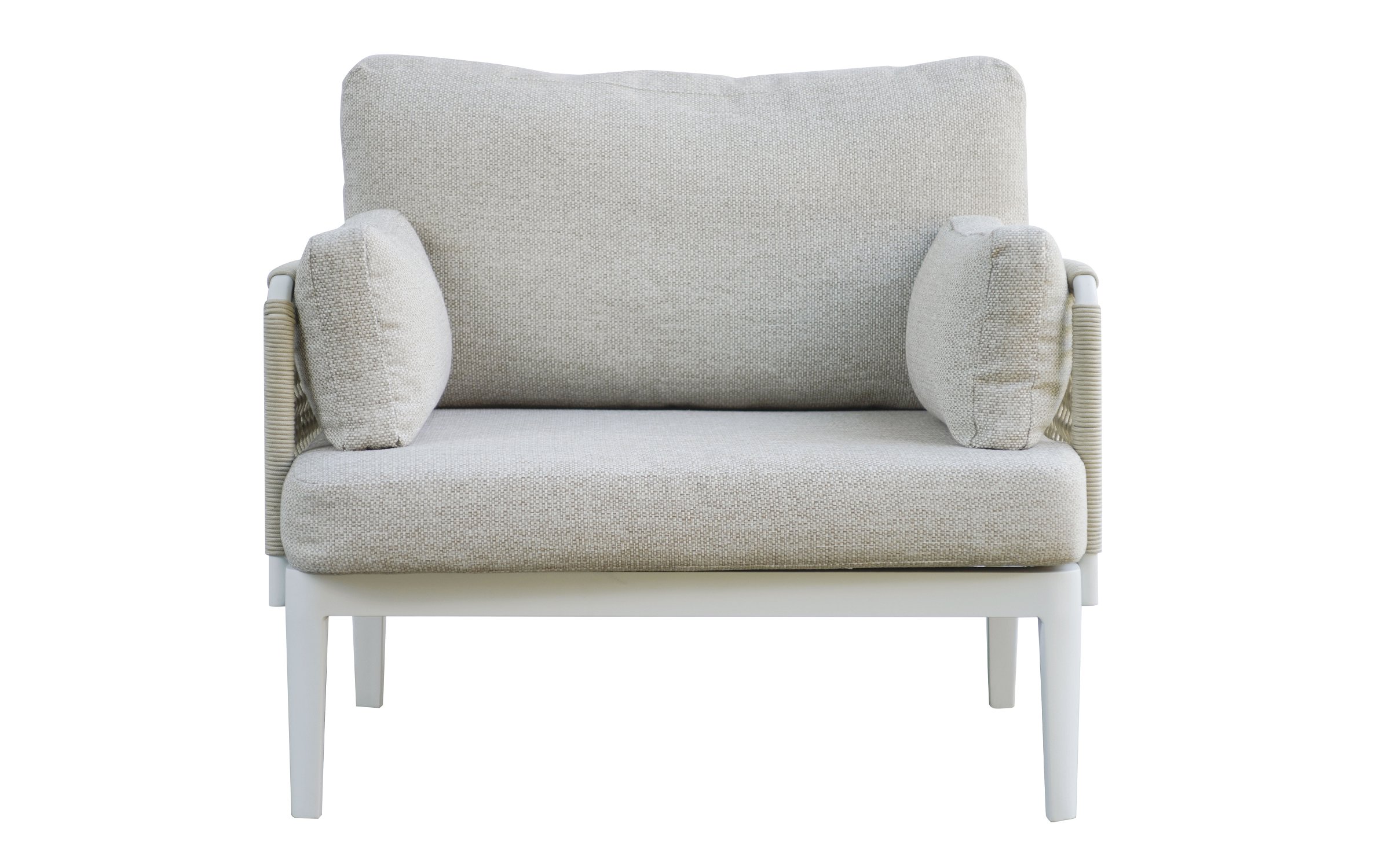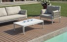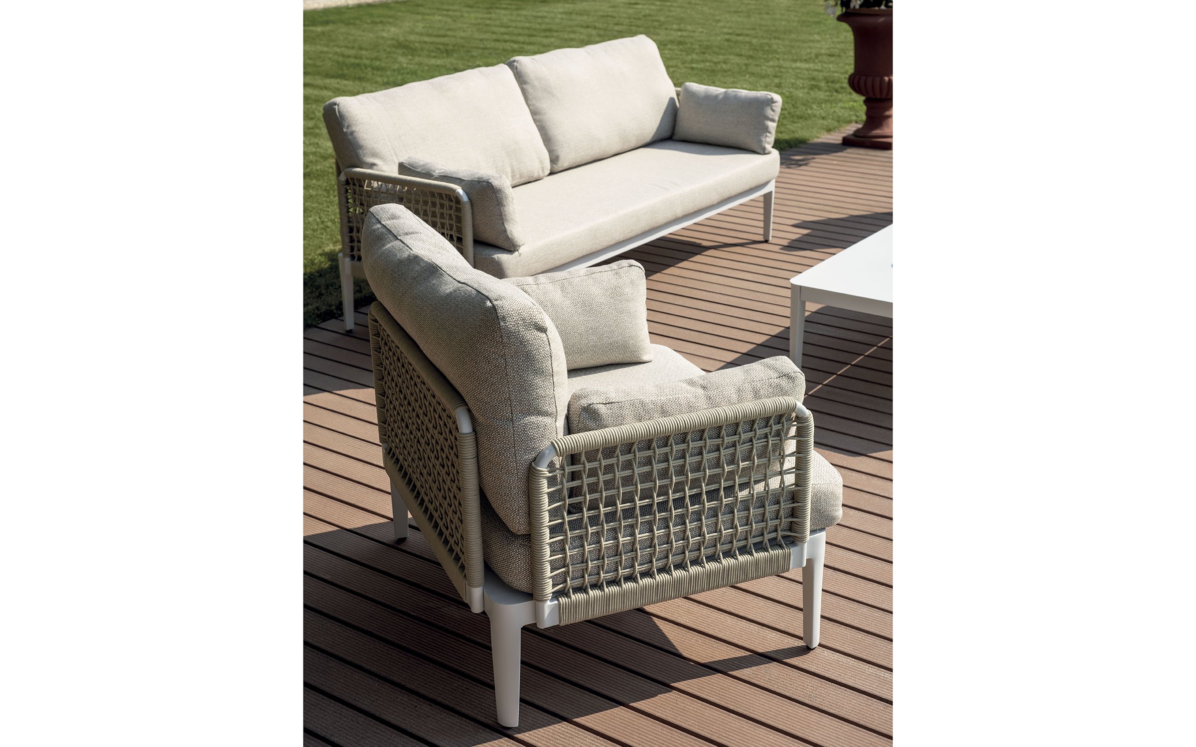 Konstrukcja z aluminium malowanego proszkowo. Oparcia z plecionej liny beżowej. Blat stolika z aluminium. Poduszki zdejmowane w kolorze beżowym, wykonane z tkaniny Olefin.