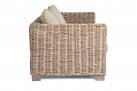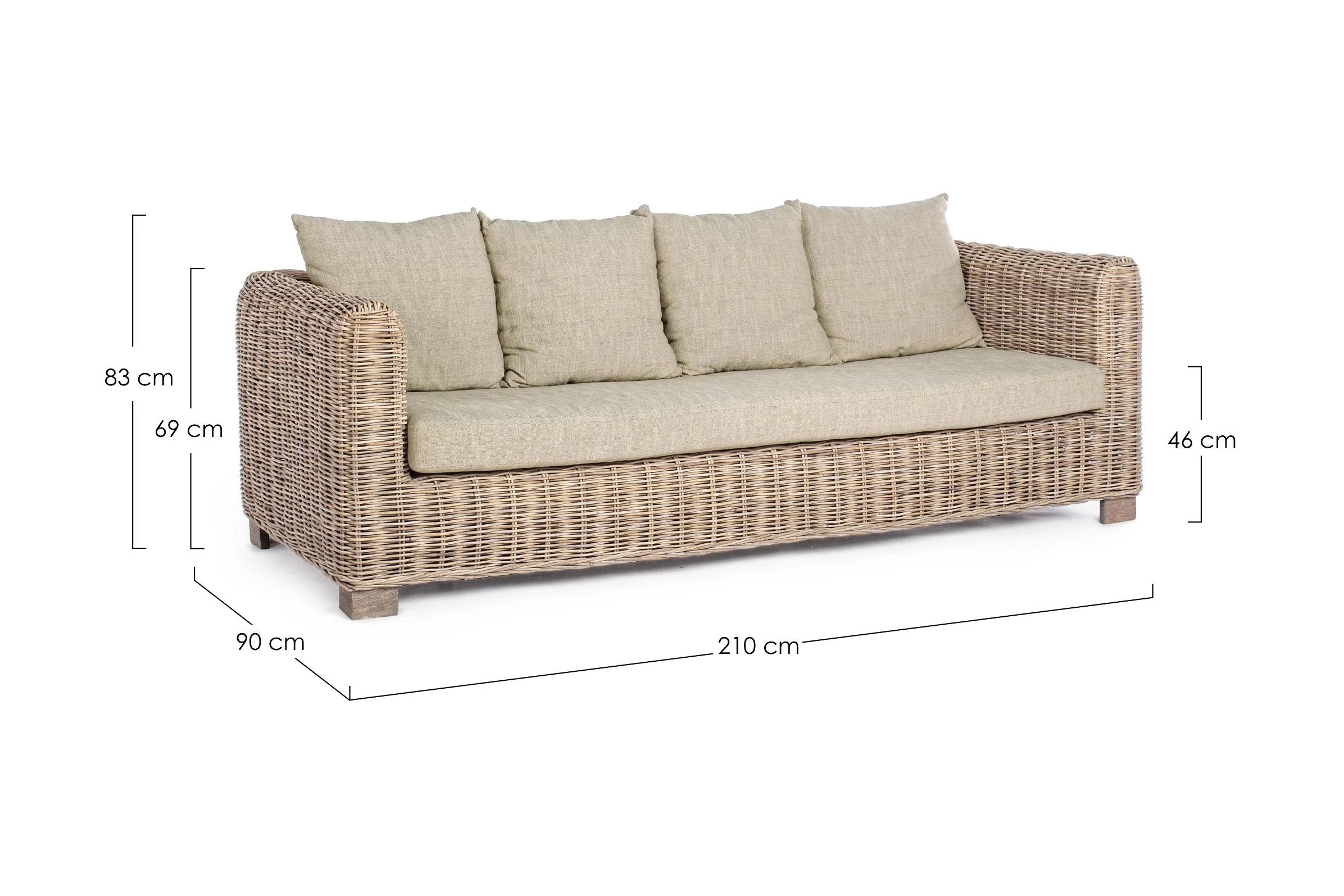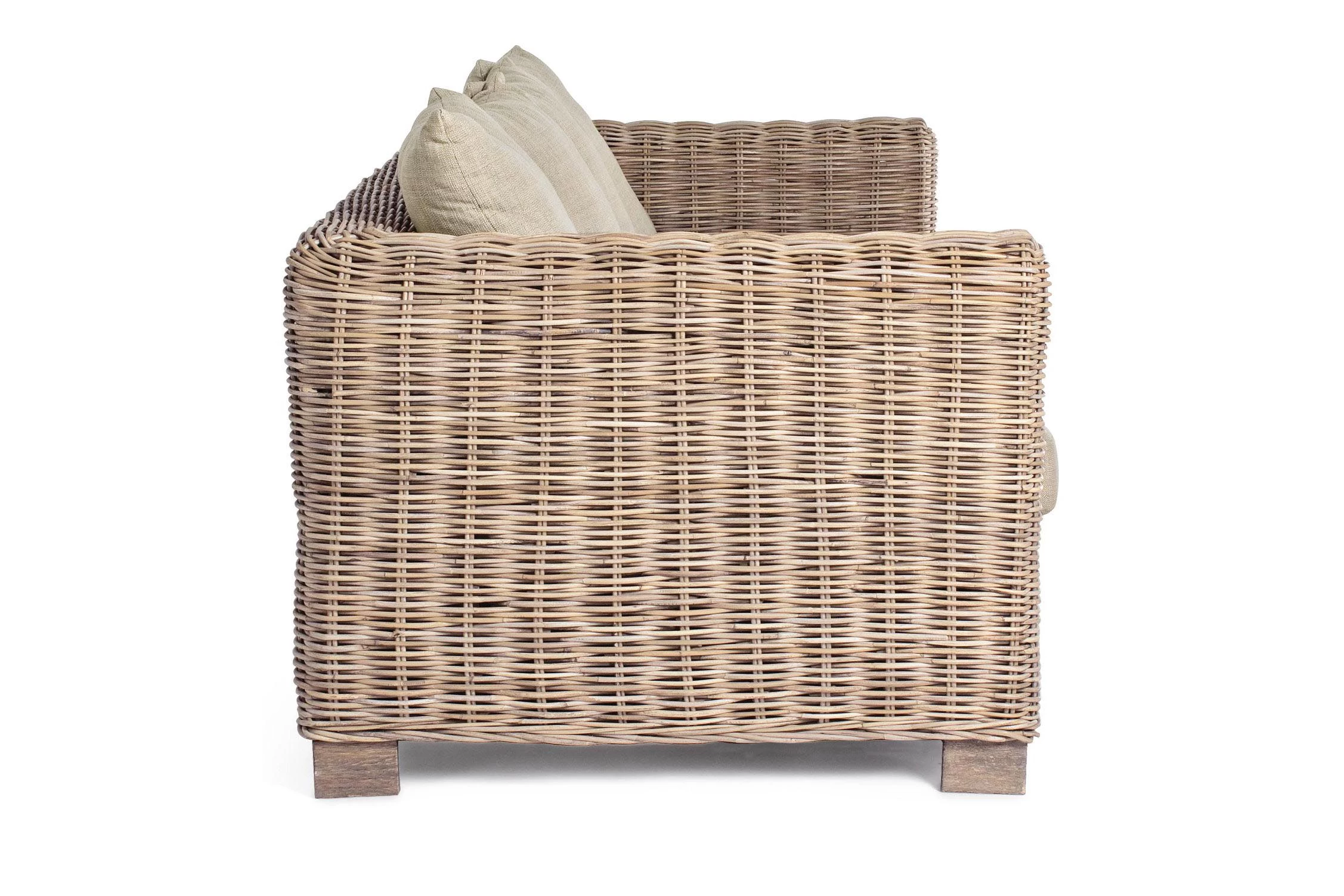 Klasyczna sofa wypoczynkowa z naturalnego rattanu z beżowymi poduszkami.