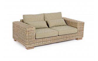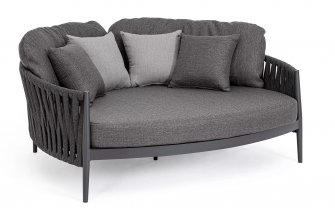 Ekskluzywna sofa wypoczynkowa na taras w oryginalnym i co najważniejsze odpornym na warunki atmosferyczne wykonaniu. Wygodna sofa dla trzech osób. Delikatnie wygięte podłokietniki i wygodne oparcie oraz siedzisko w formie miękkich poduszek, zostało wykonane z wodoodpornej tkaniny Olefin. Materiał, która jest barwioną na wskroś tkaniną akrylową odporną na zabrudzenia, jest również odporna na działanie wody i pleśni. Ciekawą formą urozmaicenia budowy sofy jest zastosowanie warkoczowego splotu po bokach i z tyłu stelaża. Stelaż sofy, a także nogi wykonano z aluminium w malowaniu proszkowym. Wykorzystano tu system QDF, który jest bardzo odpornym na warunki atmosferyczne wypełnieniem poduch lub siedzisk, z wysokiej jakości szybkoschnącej pianki tapicerskiej Quick Dry Foam o właściwościach antybakteryjnych. Wytrzymałość materiałów, a także odporność na korozję, umożliwiają zastosowanie zarówno w domu jak i na zewnątrz - w ogrodzie lub na tarasie. Meble należy czyścić nie wykorzystując silnych środków chemicznych.