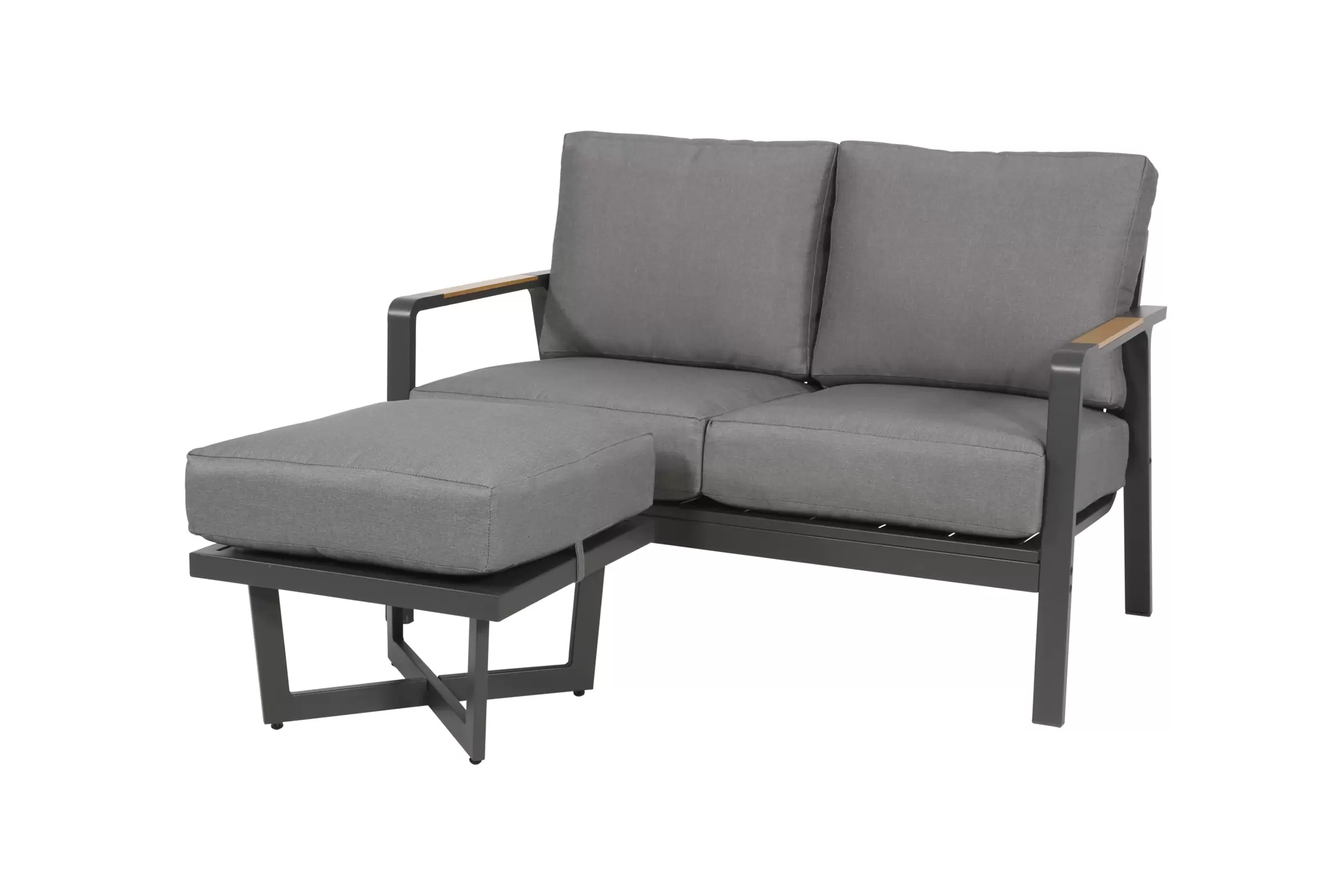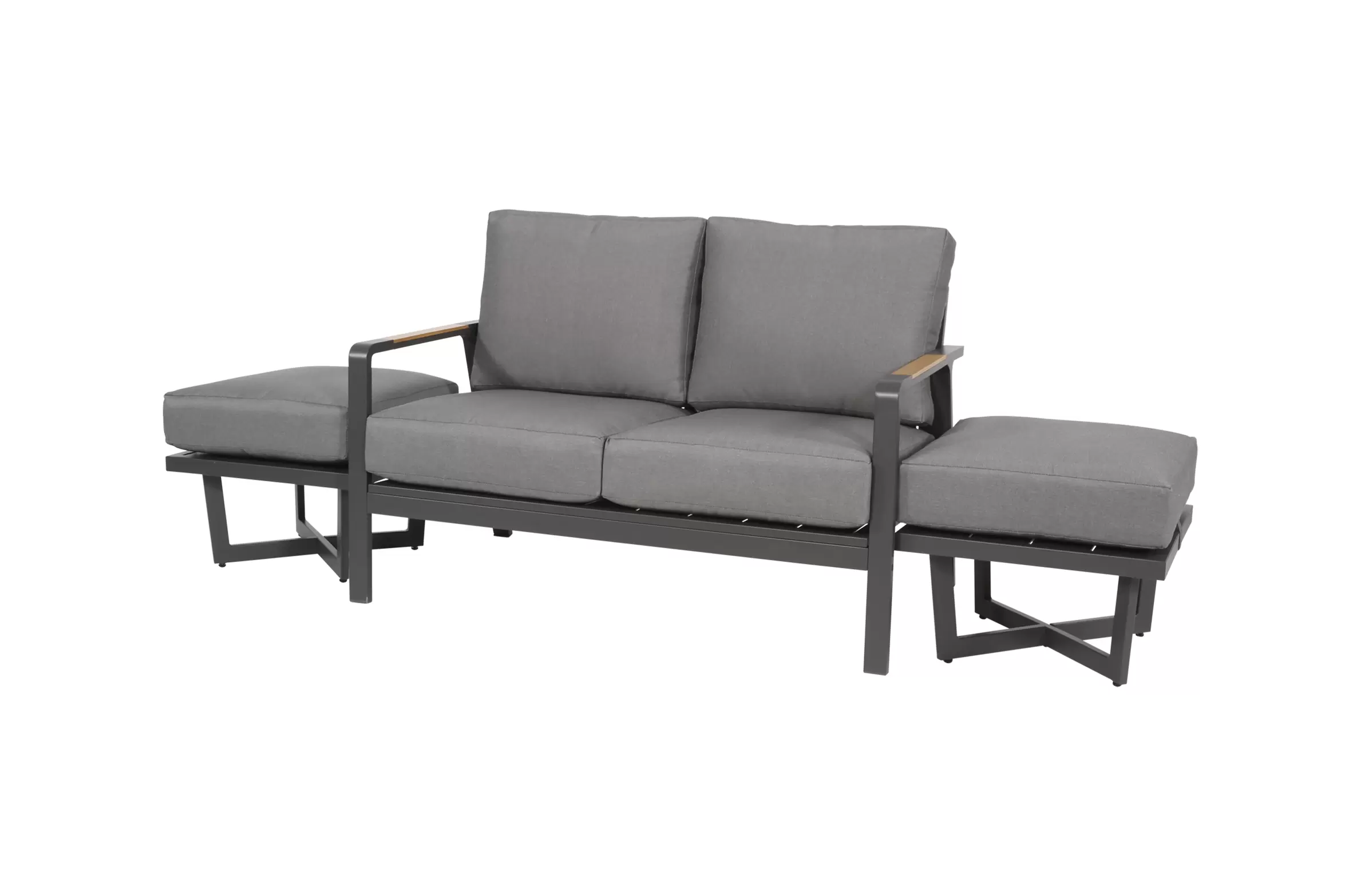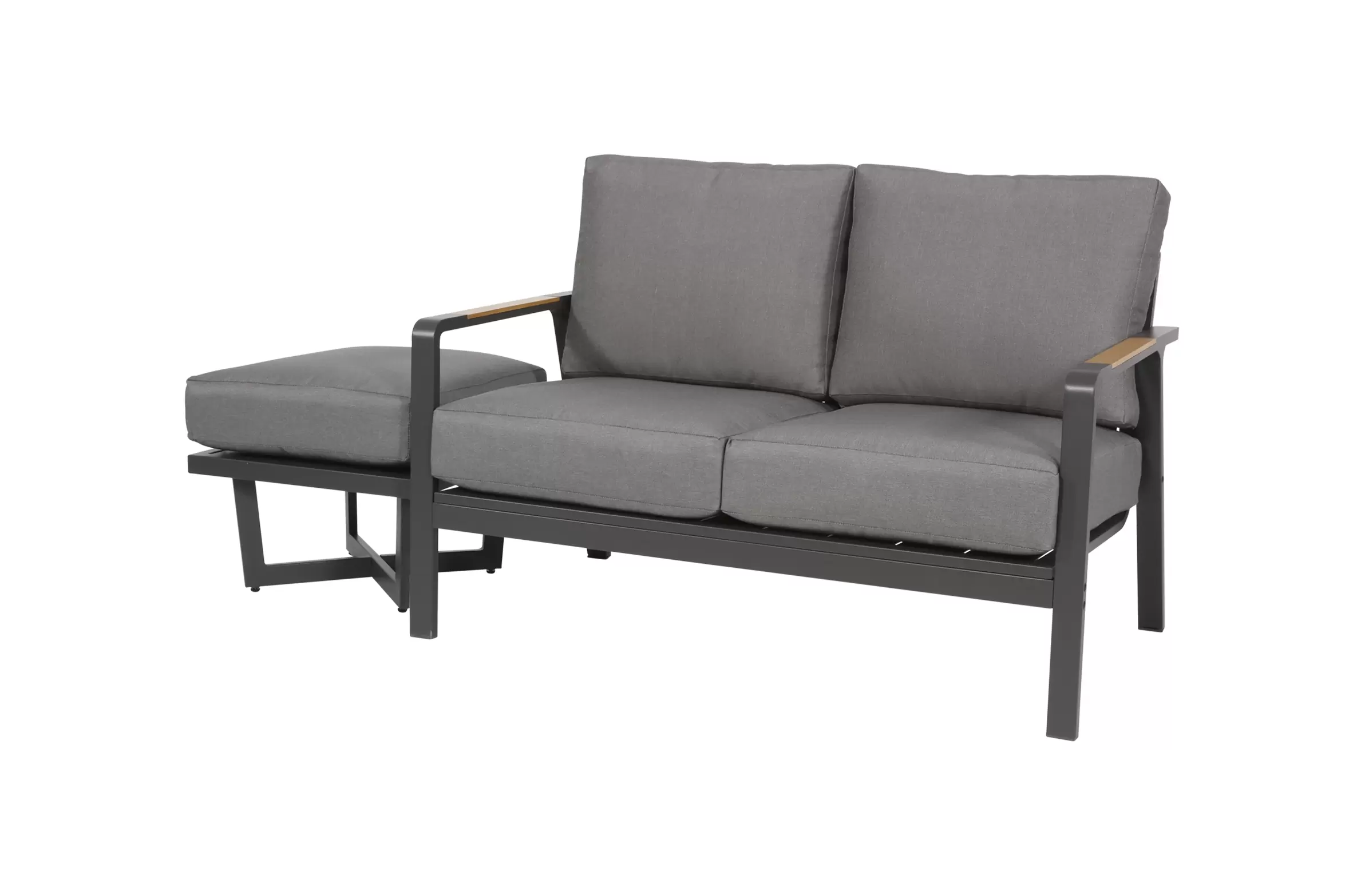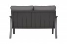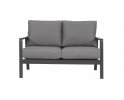 Nowoczesna sofa wypoczynkowa o aluminiowej konstrukcji z grubymi wygodnymi poduszkami wodoodpornymi z poszewkami z materiału Olefin.