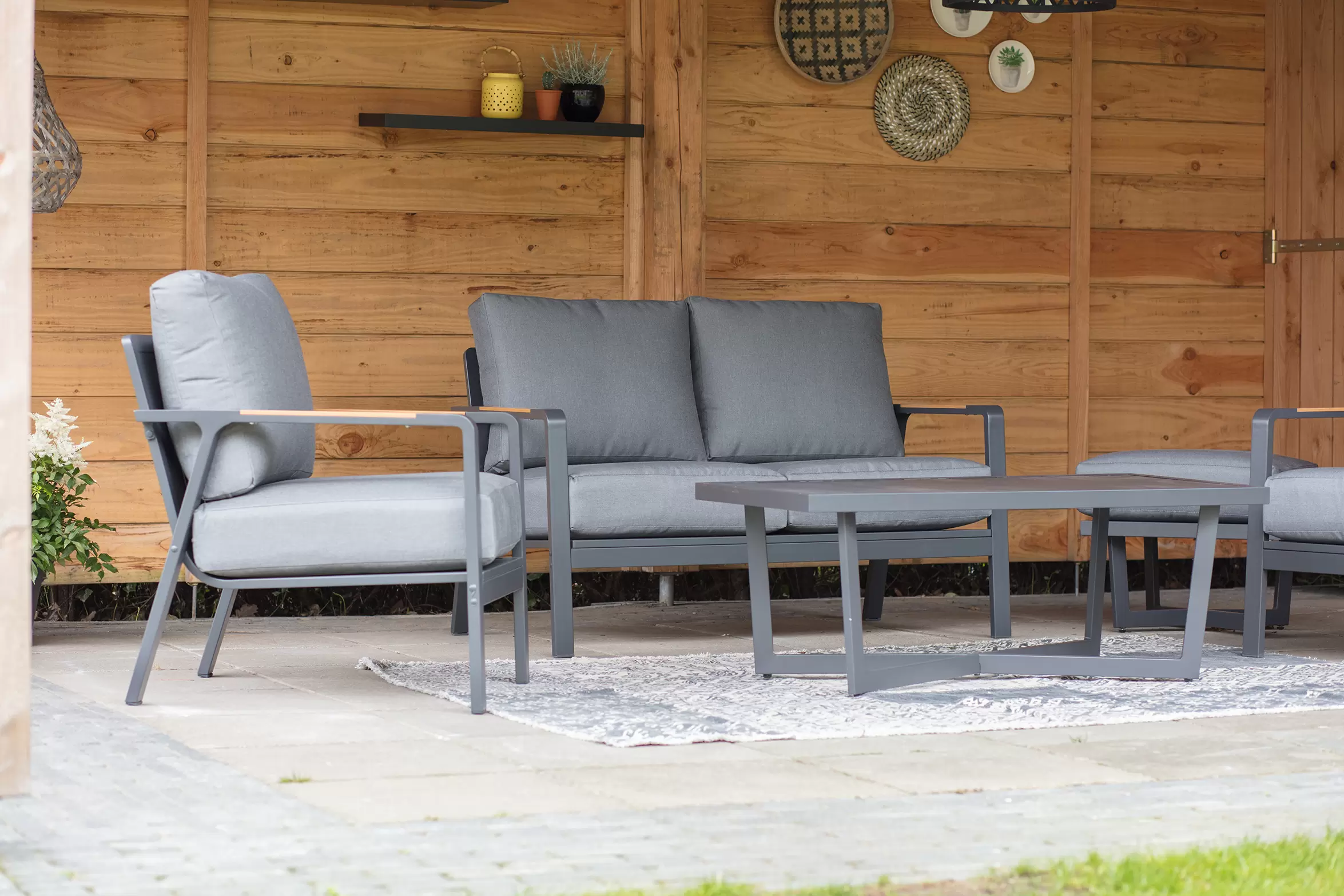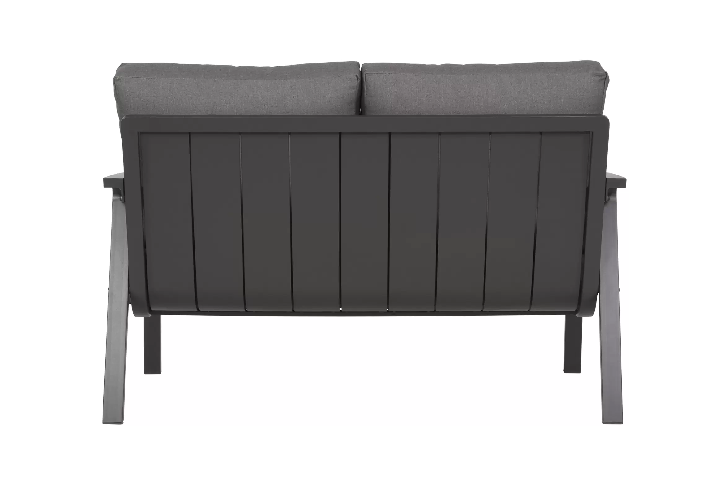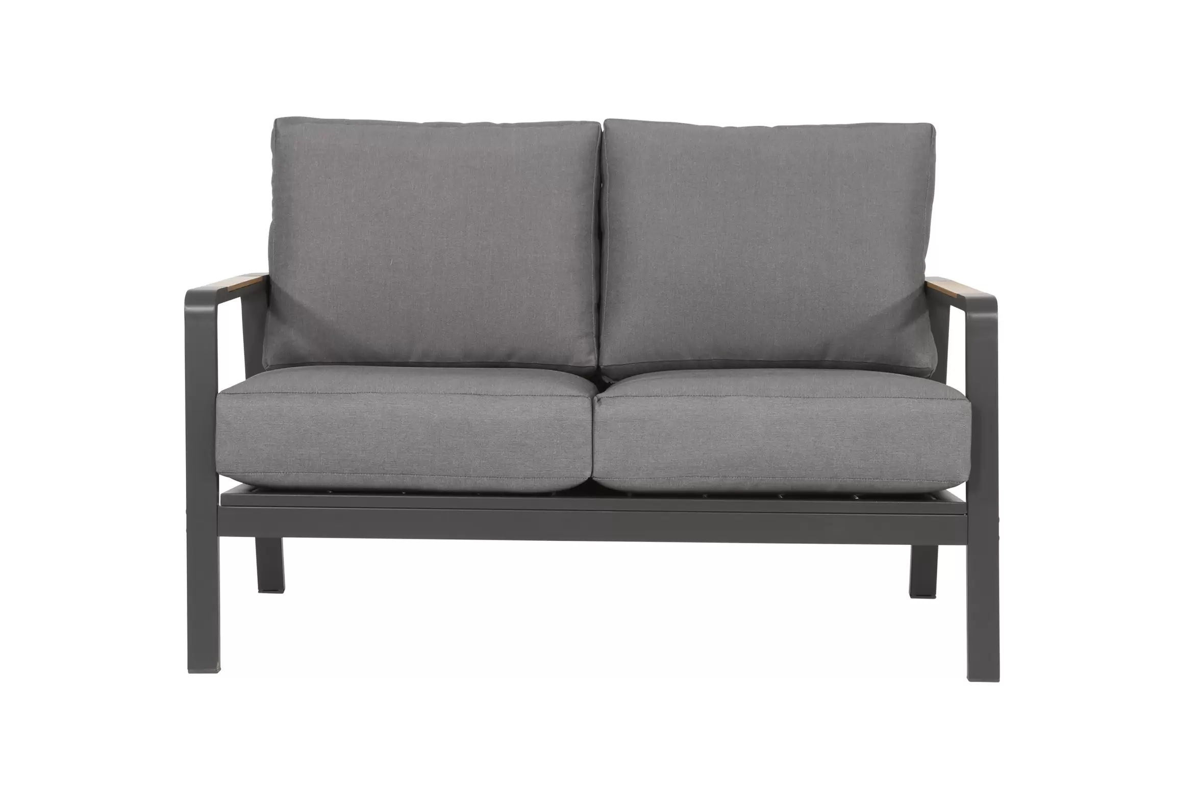 Nowoczesna sofa wypoczynkowa o aluminiowej konstrukcji z grubymi wygodnymi poduszkami wodoodpornymi z poszewkami z materiału Olefin.