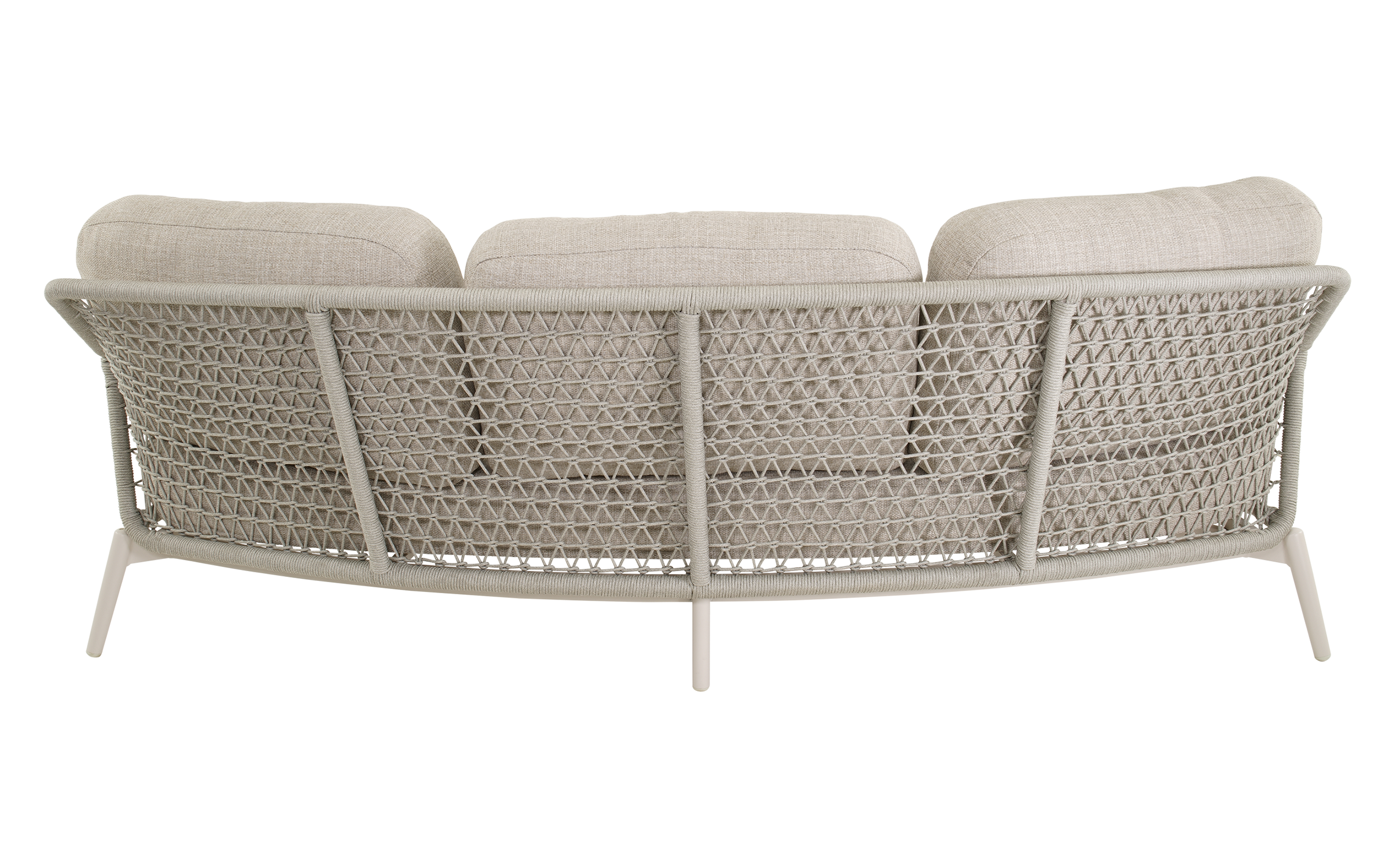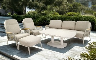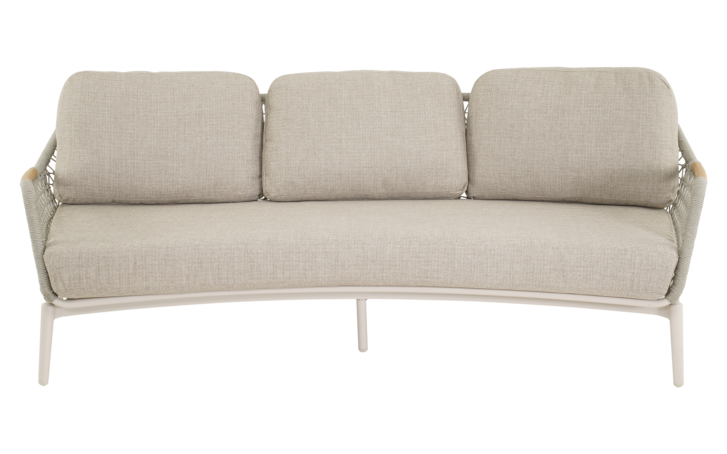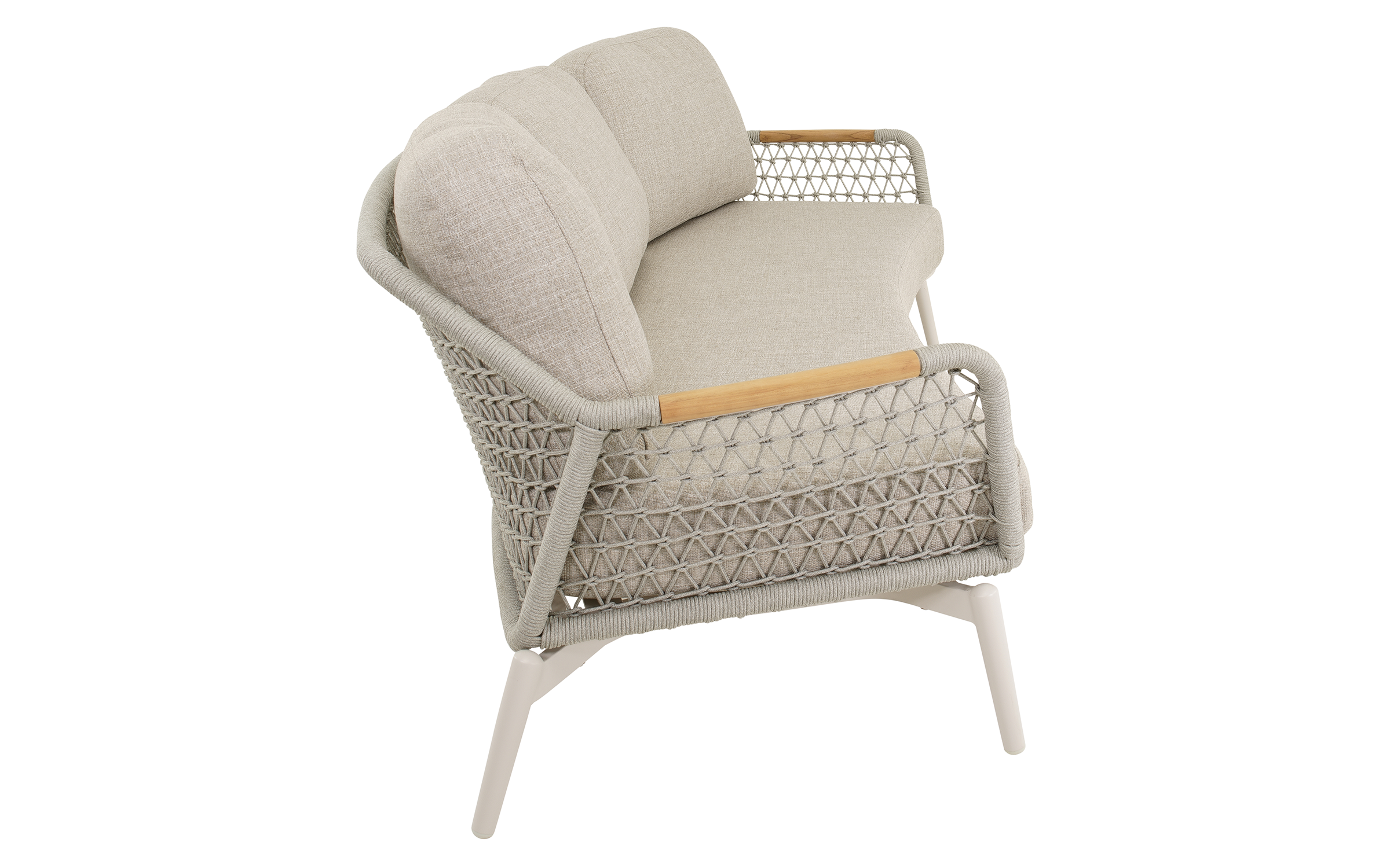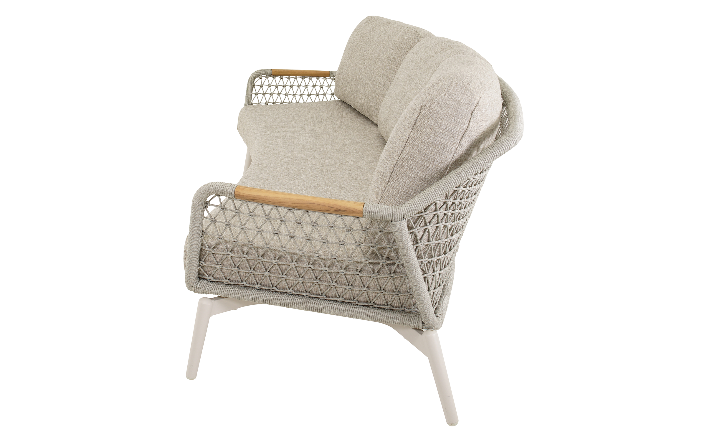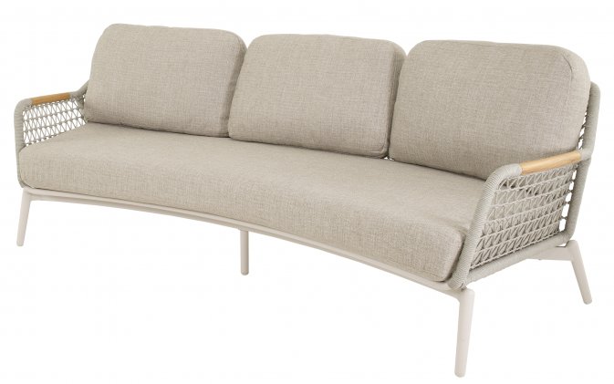 Sofa Marseille wyróżnia się połączeniem aluminium, drewna teakowego i plecionego sznurka, co nadaje jej wyjątkowy wygląd. Poduszki w kolorze jasnego beżu są szybkoschnące, łatwe w pielęgnacji i odporne na blaknięcie. Dzięki szerokiemu siedzisku i wygodnym oparciom sofa zapewnia komfortowy wypoczynek dla trzech osób.