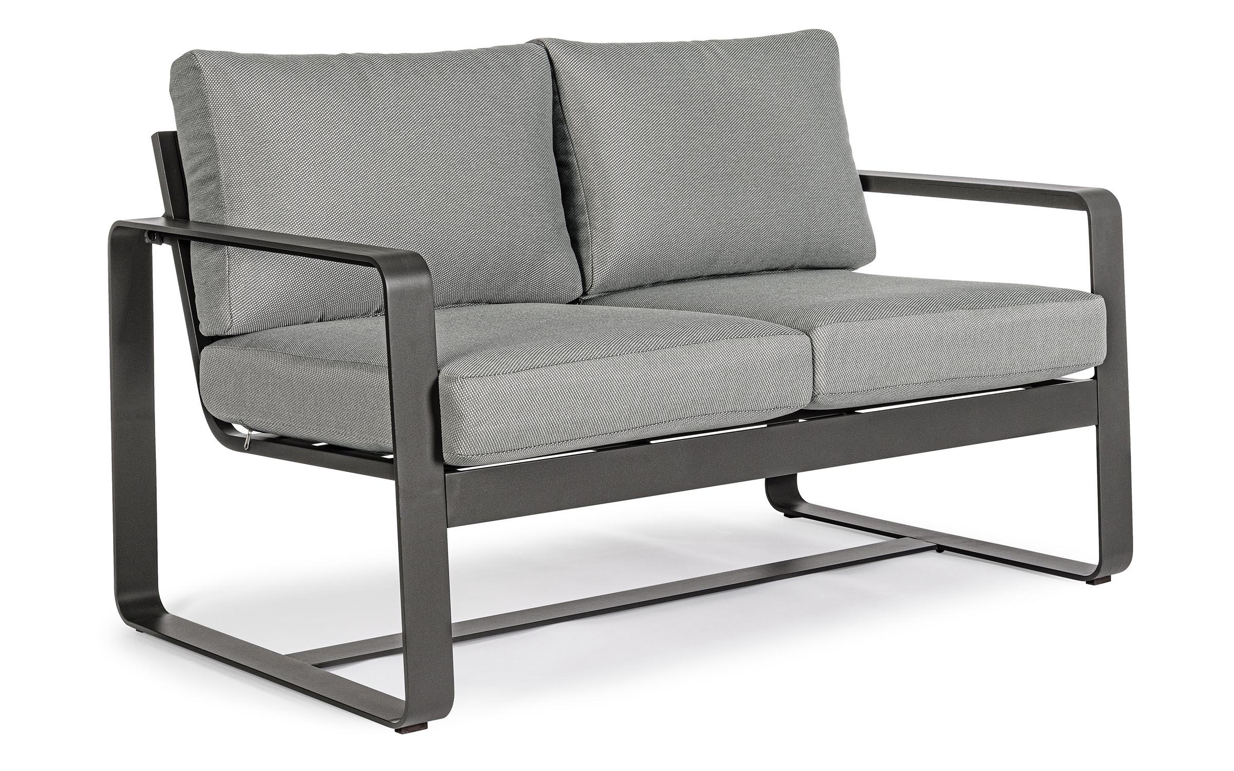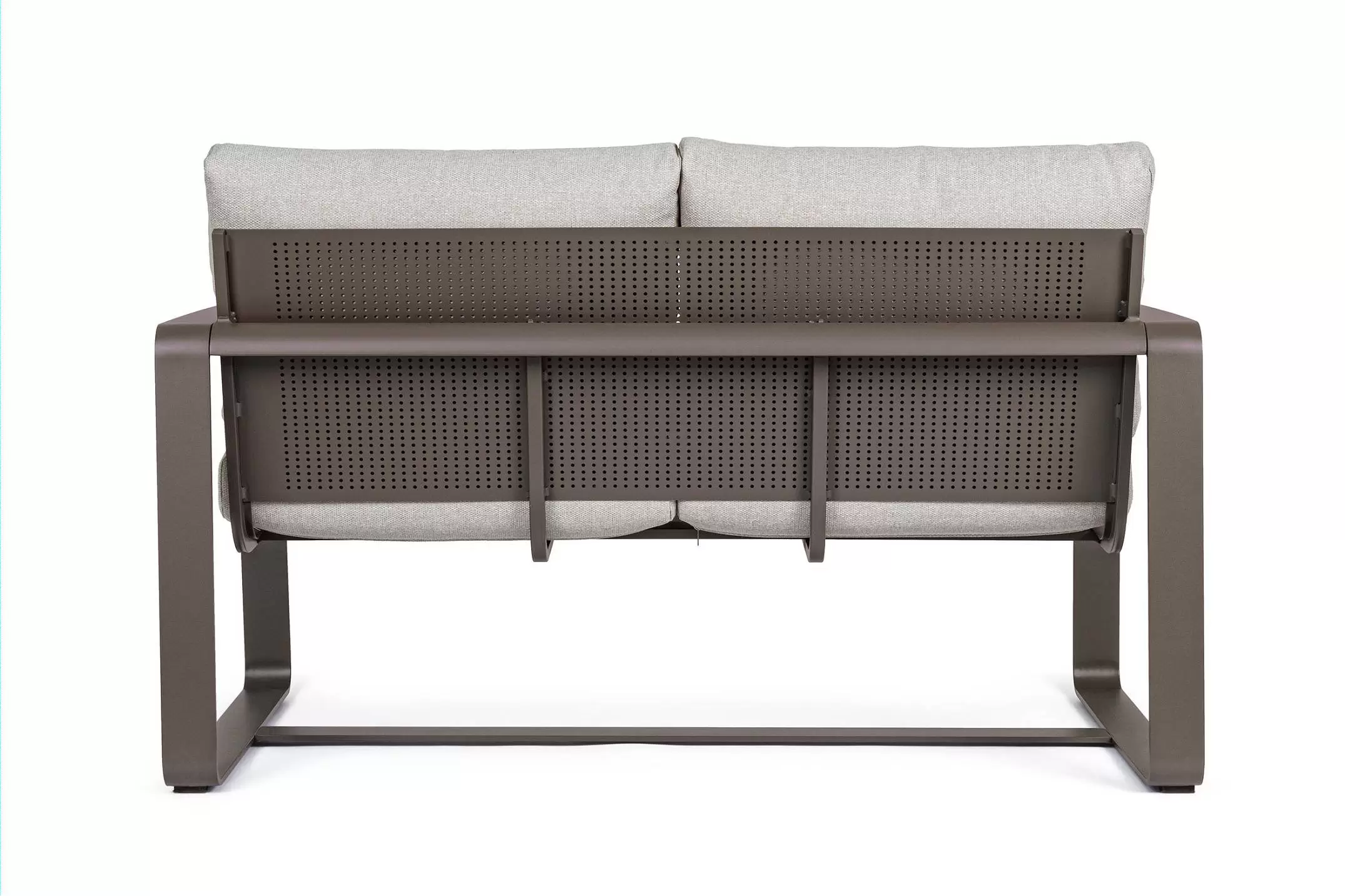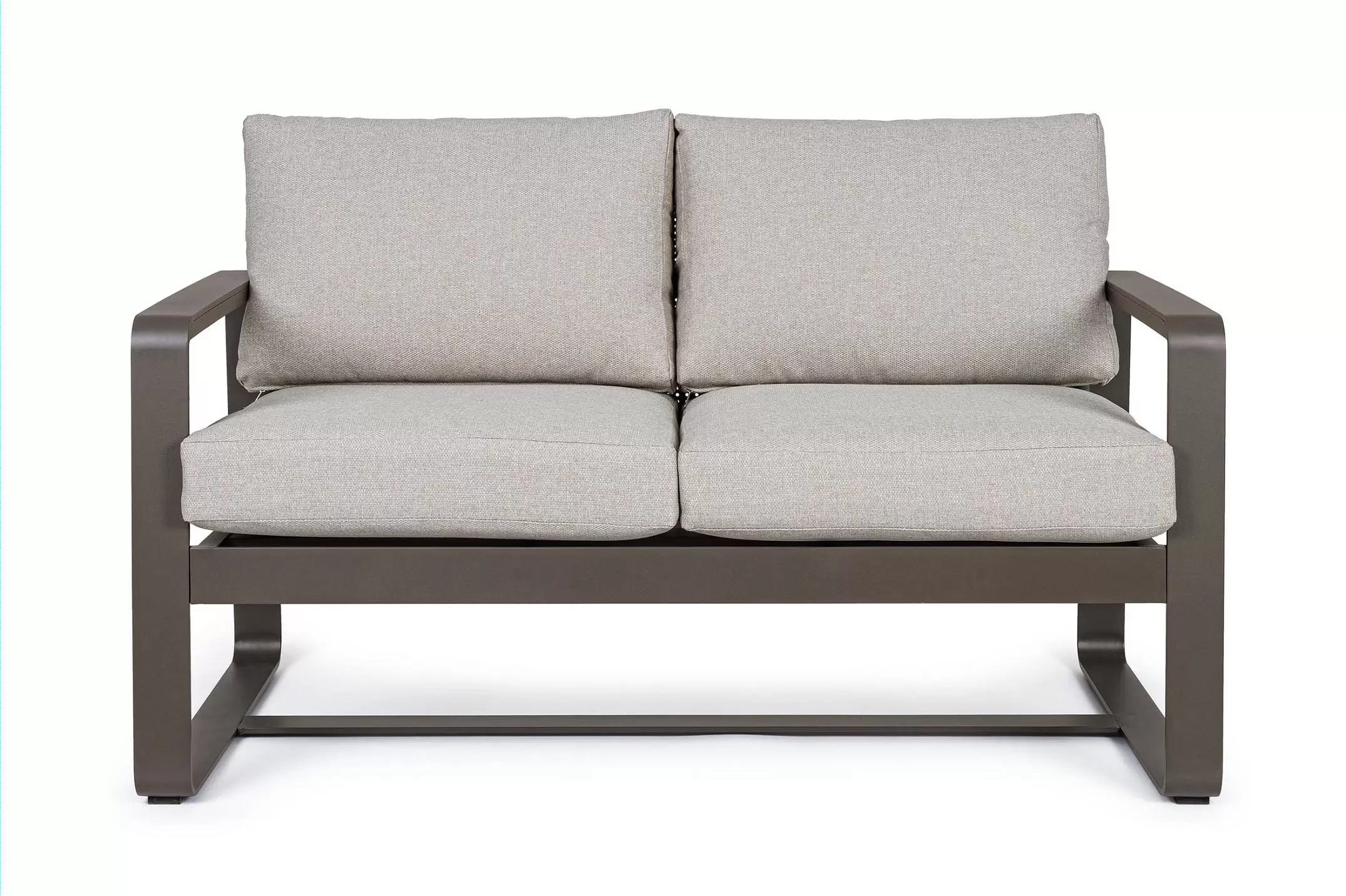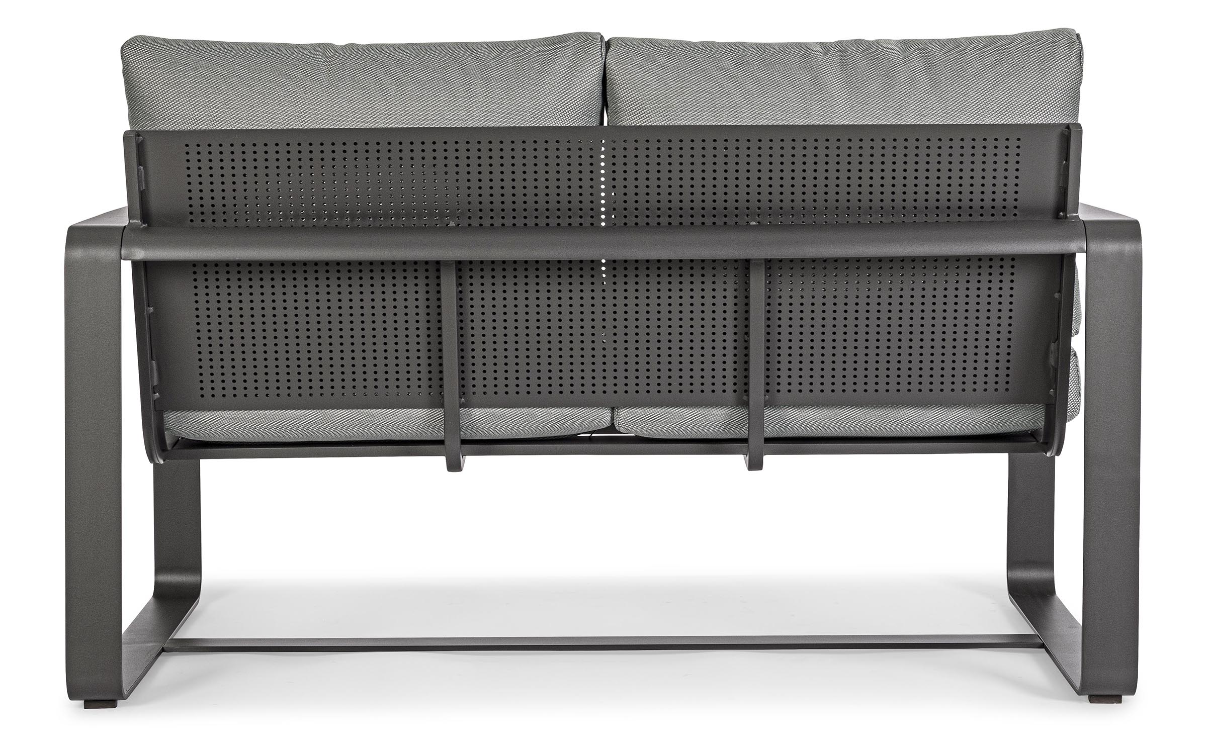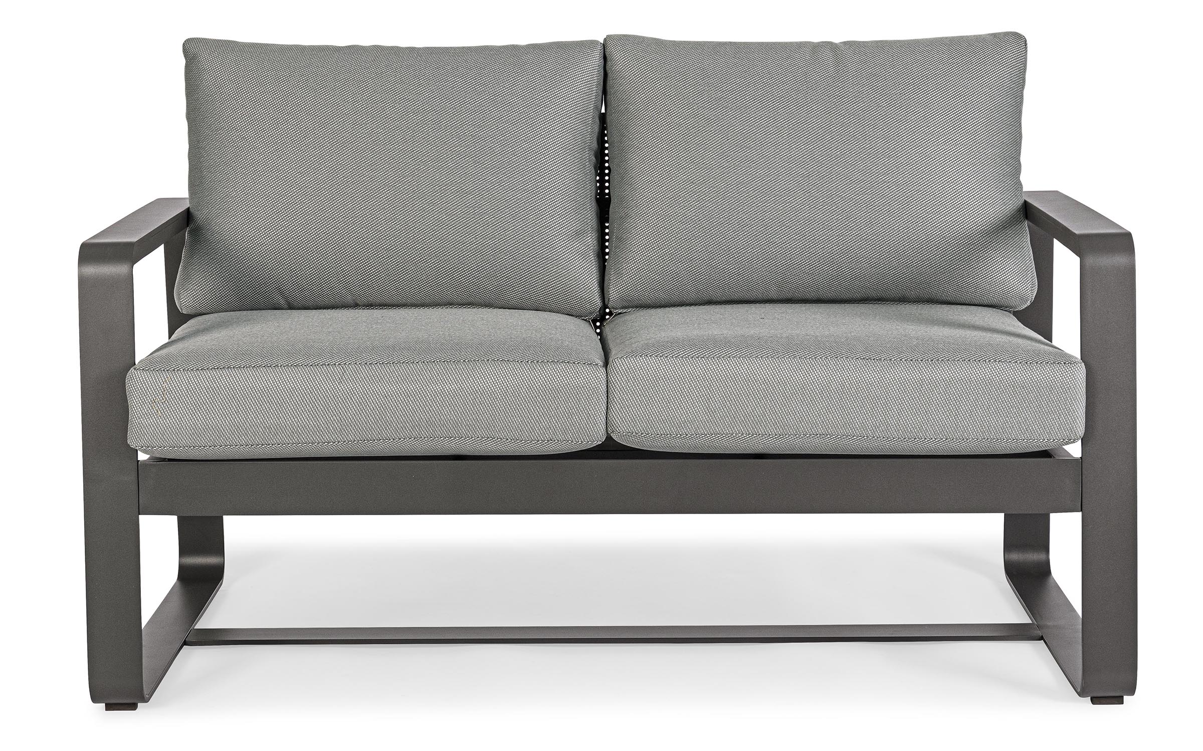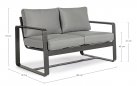 Aluminiowy dwuosobowa sofa wypoczynkowa. Wygodne siedzenie na tarasie zapewniają wysokiej jakości poduszki o gęstej sprężystej piance z poszewkami Olefin.