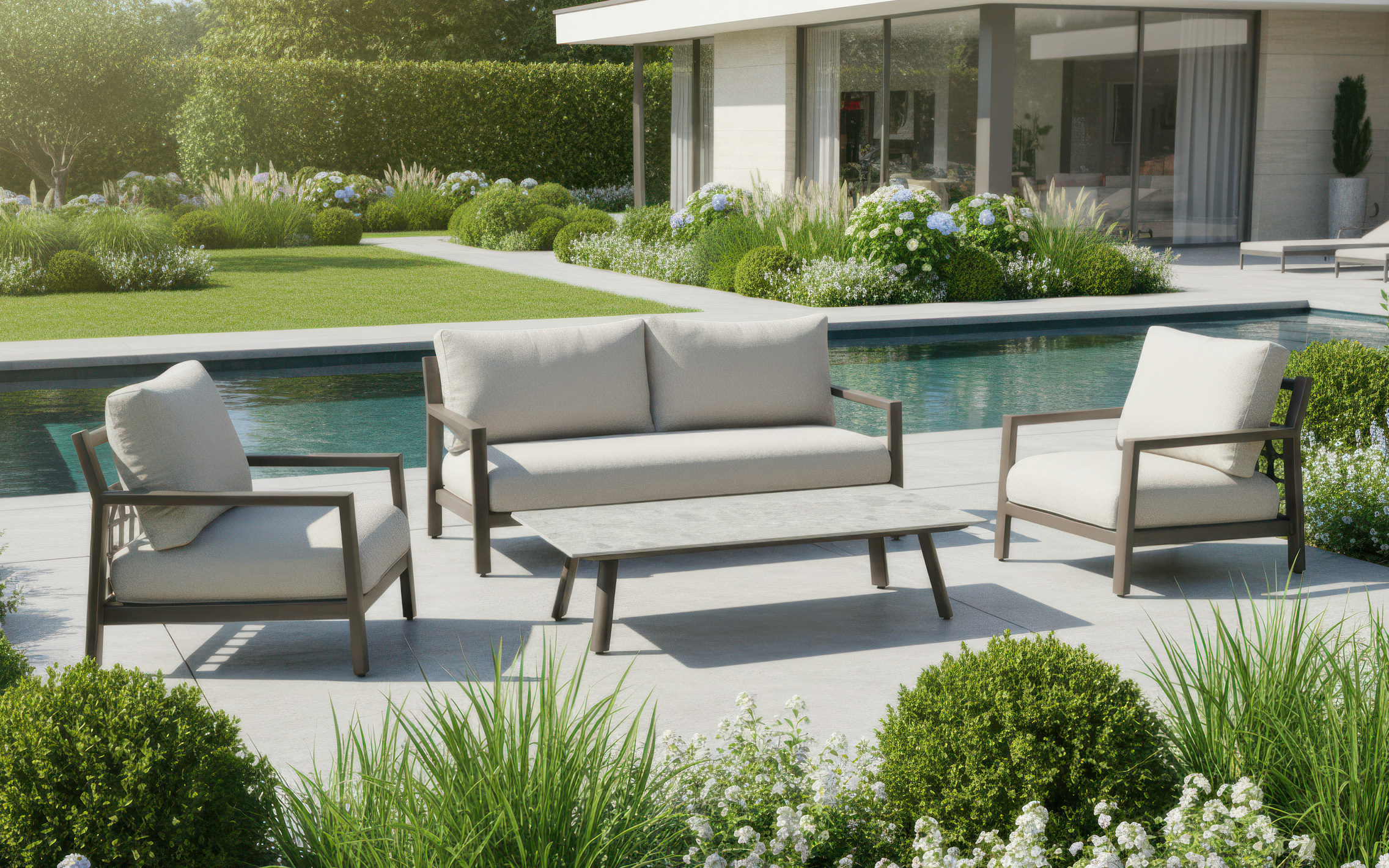 Tkanina Olefin z wykończeniem Bouclé W poduszkach zastosowano wysokogatunkowe włókno Olefin, które jest standardem w segmencie mebli outdoorowych premium. Należy podkreślić, że Olefin to nazwa wytrzymałego włókna o doskonałych parametrach technicznych, natomiast Bouclé to specyficzny sposób tkania i wykończenia powierzchni. Ten pętelkowy splot nadaje tkaninie unikalną, miękką teksturę i trójwymiarowy wygląd, przypominający luksusowe meble salonowe. Tkanina ta jest szybkoschnąca, oddychająca i posiada ekstremalnie wysoką odporność na blaknięcie wywołane słońcem.
