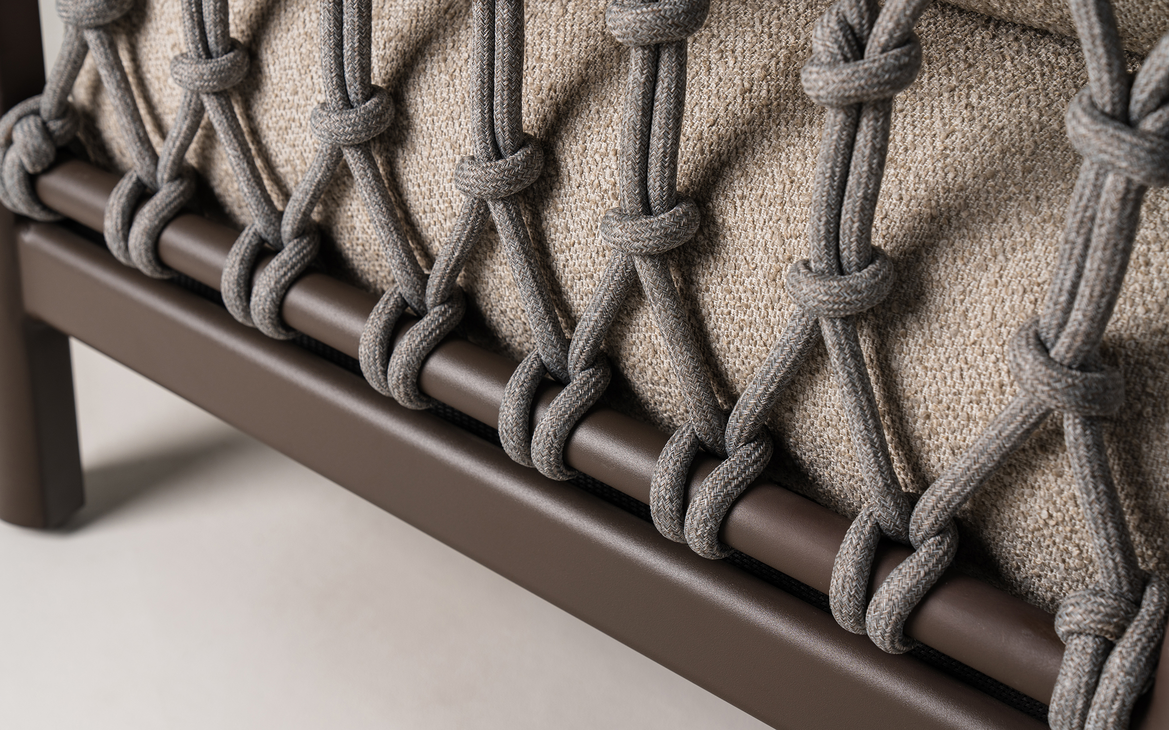 Lina polipropylenowa (Rope) Oparcia mebli zostały wykończone dekoracyjnym splotem z liny polipropylenowej. Jest to materiał syntetyczny nowej generacji, który charakteryzuje się wysoką gęstością i odpornością na uszkodzenia mechaniczne. Lina jest hydrofobowa (nie chłonie wody) oraz odporna na pleśń i grzyby. Specjalna stabilizacja UV sprawia, że plecionka nie kruszeje na słońcu i nie traci elastyczności, zapewniając stały komfort podparcia.