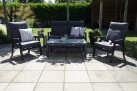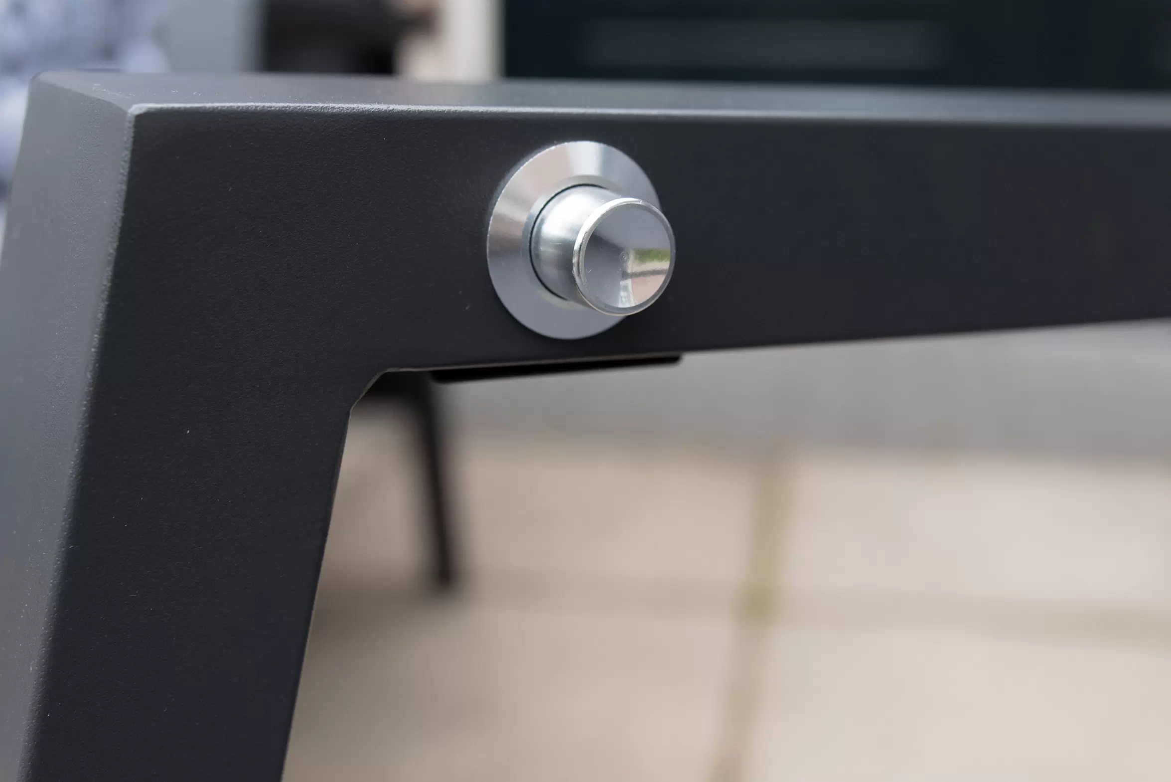 Aluminiowa konstrukcja malowana proszkowo w kolorze ciemnoszarym. Na siedzisku i oparciu pod poduszkami gęsta tekstylina.