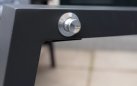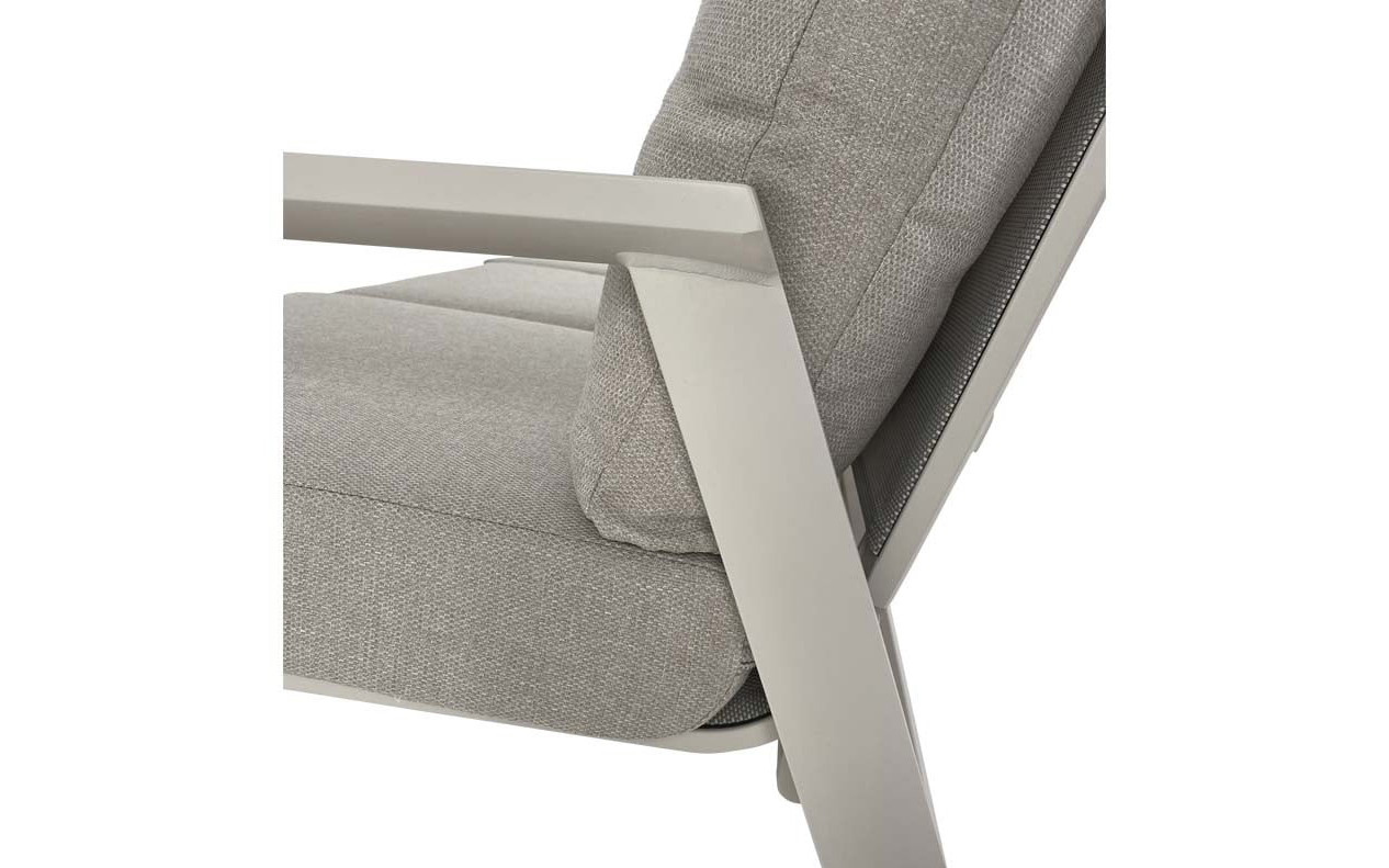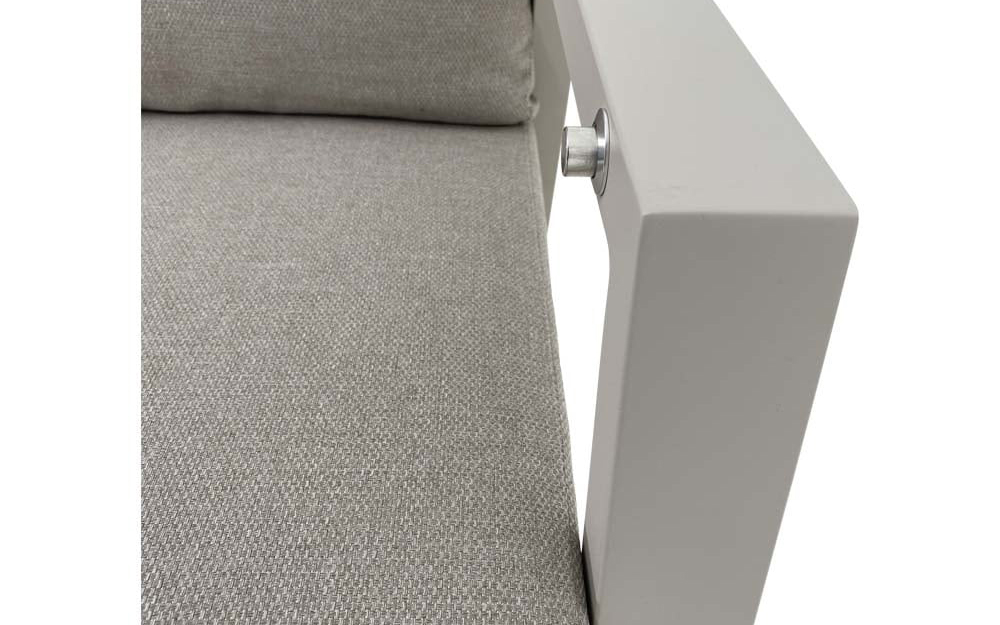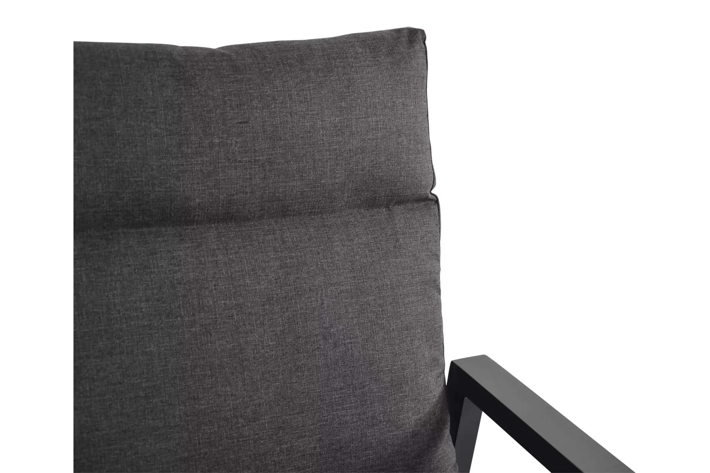 Aluminiowa konstrukcja malowana proszkowo w kolorze ciemnoszarym. Na siedzisku i oparciu pod poduszkami gęsta tekstylina.