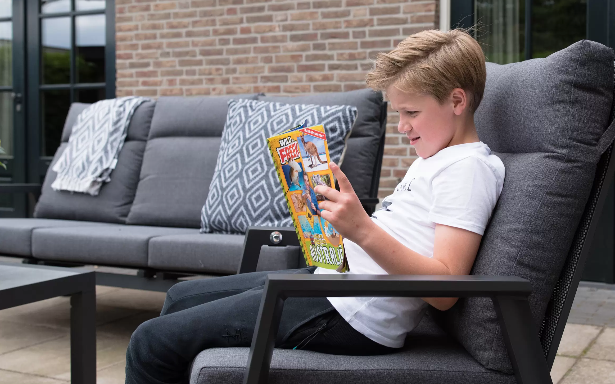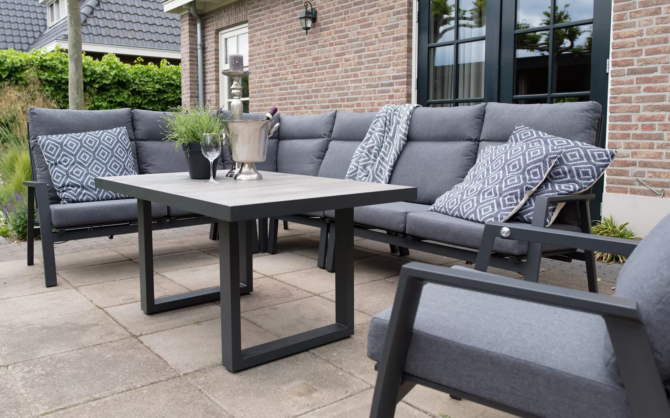 Kolekcja modułowych mebli ogrodowych aluminiowych w kolorze ciemnoszarym z wysokimi i pochylanymi(!) oparciami. Z elementów kolekcji można ustawiać dowolne kompozycje. Do mebli wypoczynkowych dostępny jest także pasujący leżak.