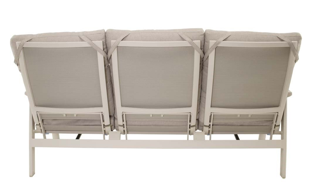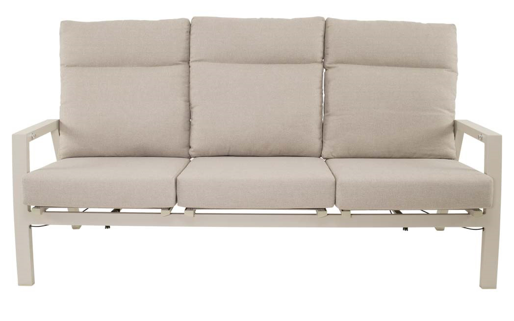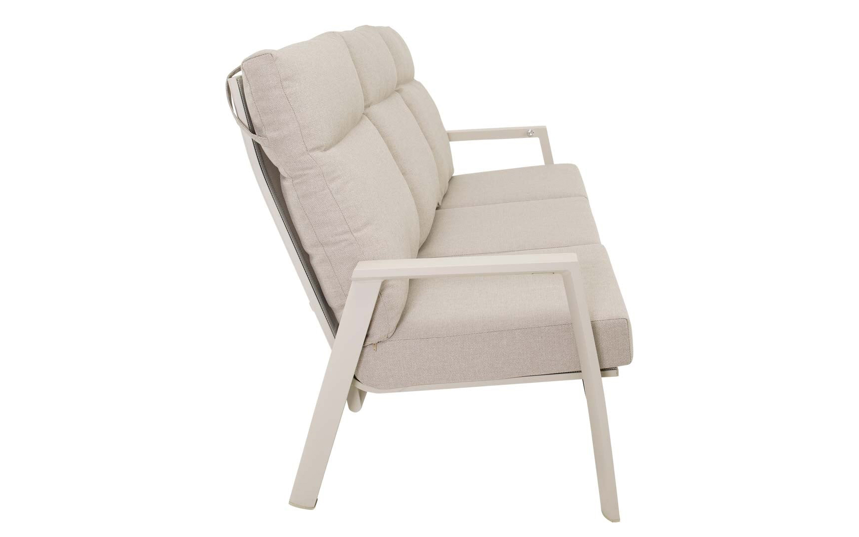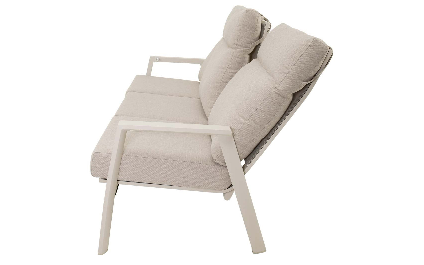 Sofa ogrodowa aluminiowa z wysokimi i pochylanymi bocznymi oparciami.