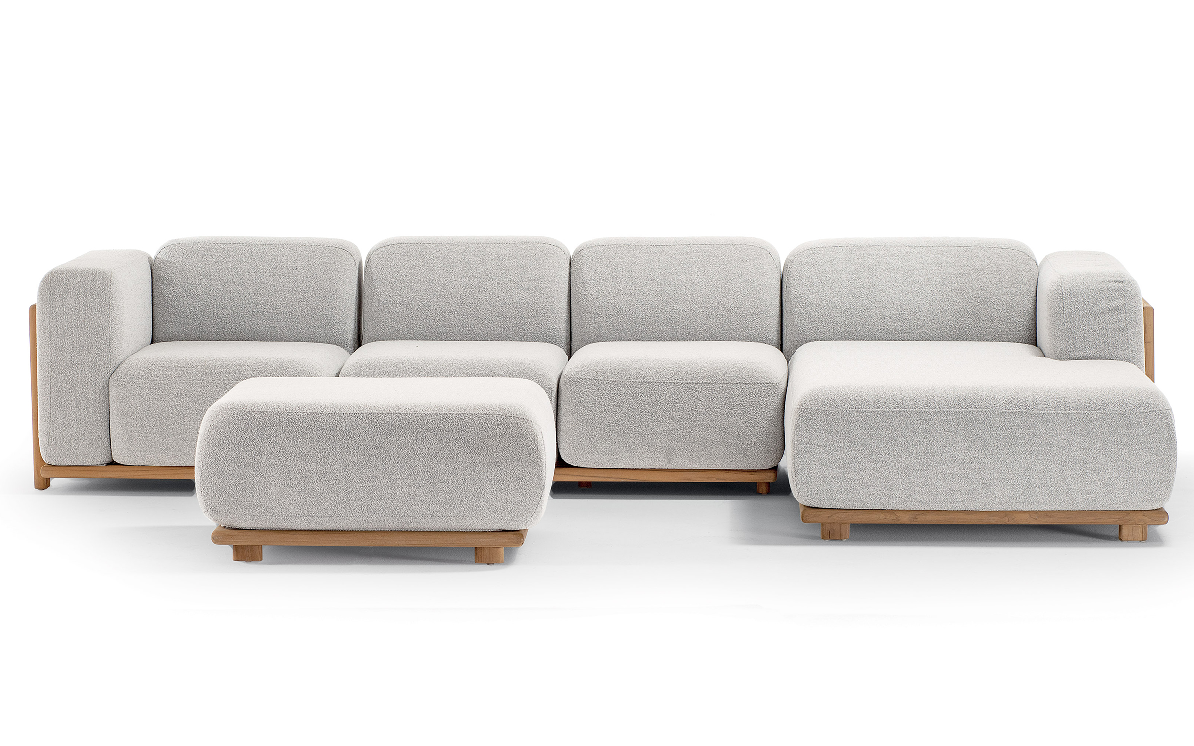 Szeroka sofa z szezlongiem RULE Teak to propozycja dla najbardziej wymagających użytkowników, którzy pragną połączyć szlachetny wygląd naturalnego drewna z niezniszczalnością nowoczesnych materiałów. Ten system meblowy redefiniuje pojęcie elastyczności, pozwalając na dowolną aranżację przestrzeni wypoczynkowej na tarasie.