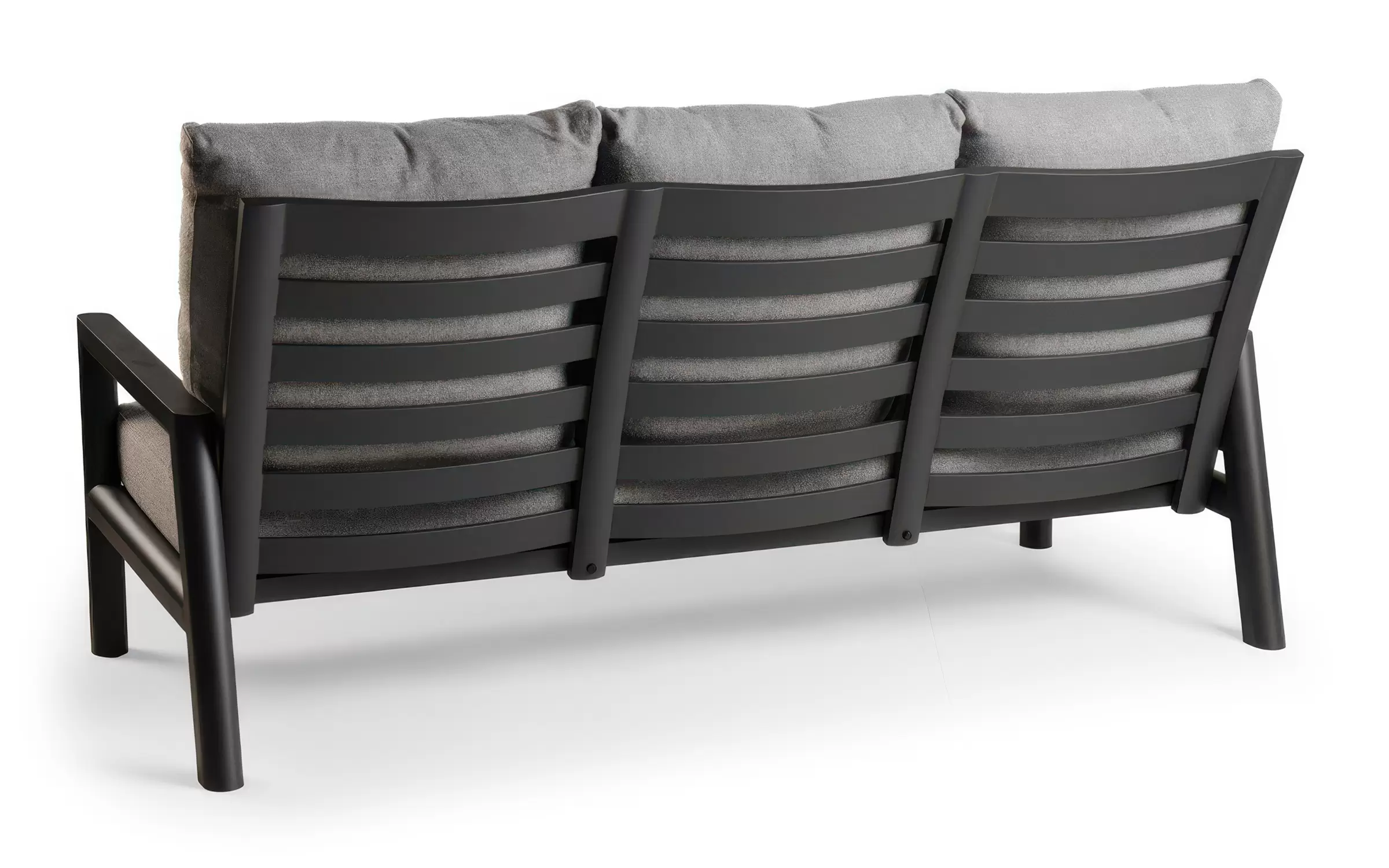 Konstrukcja sofy wykonana jest z aluminium malowanego proszkowo, co zapewnia pełną odporność na korozję, stabilność oraz wieloletnią trwałość. Model dostępny jest w dwóch wariantach kolorystycznych: Champagne / Navajo White oraz Anthracite / Mountain Grey, dzięki czemu można dopasować go do każdej aranżacji.