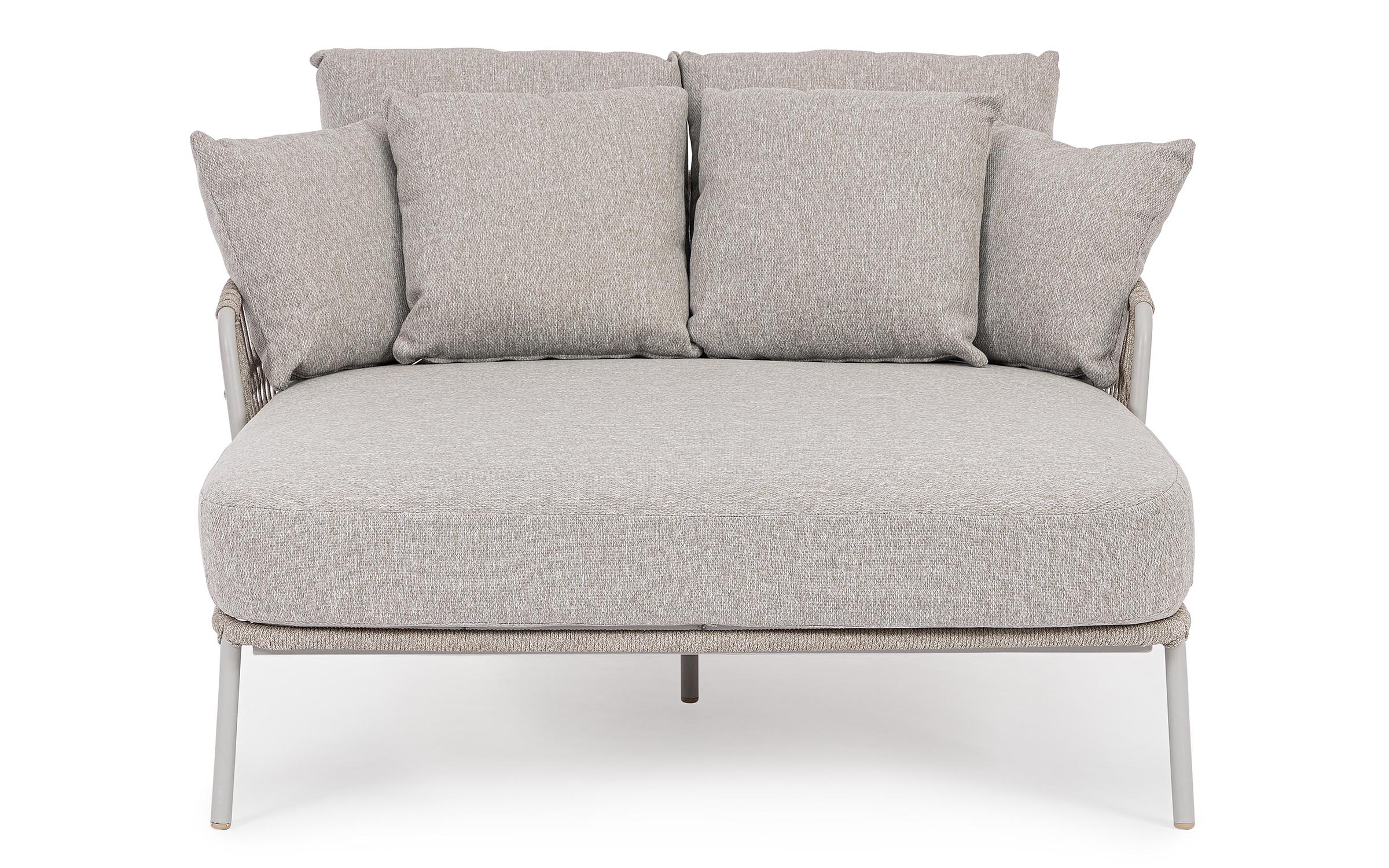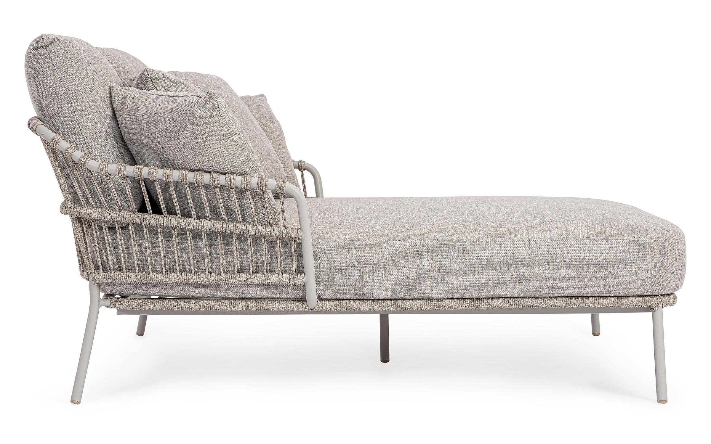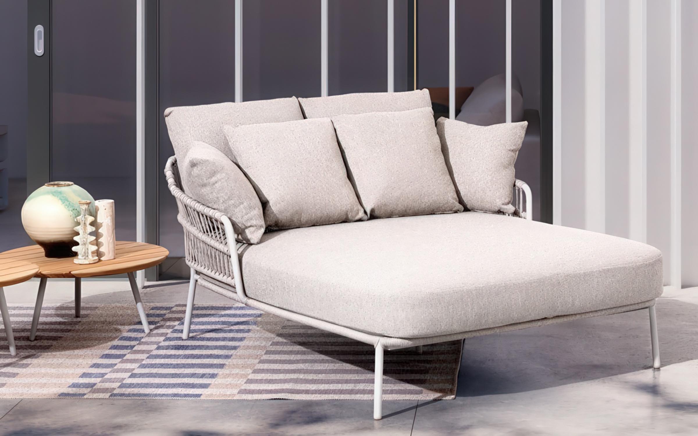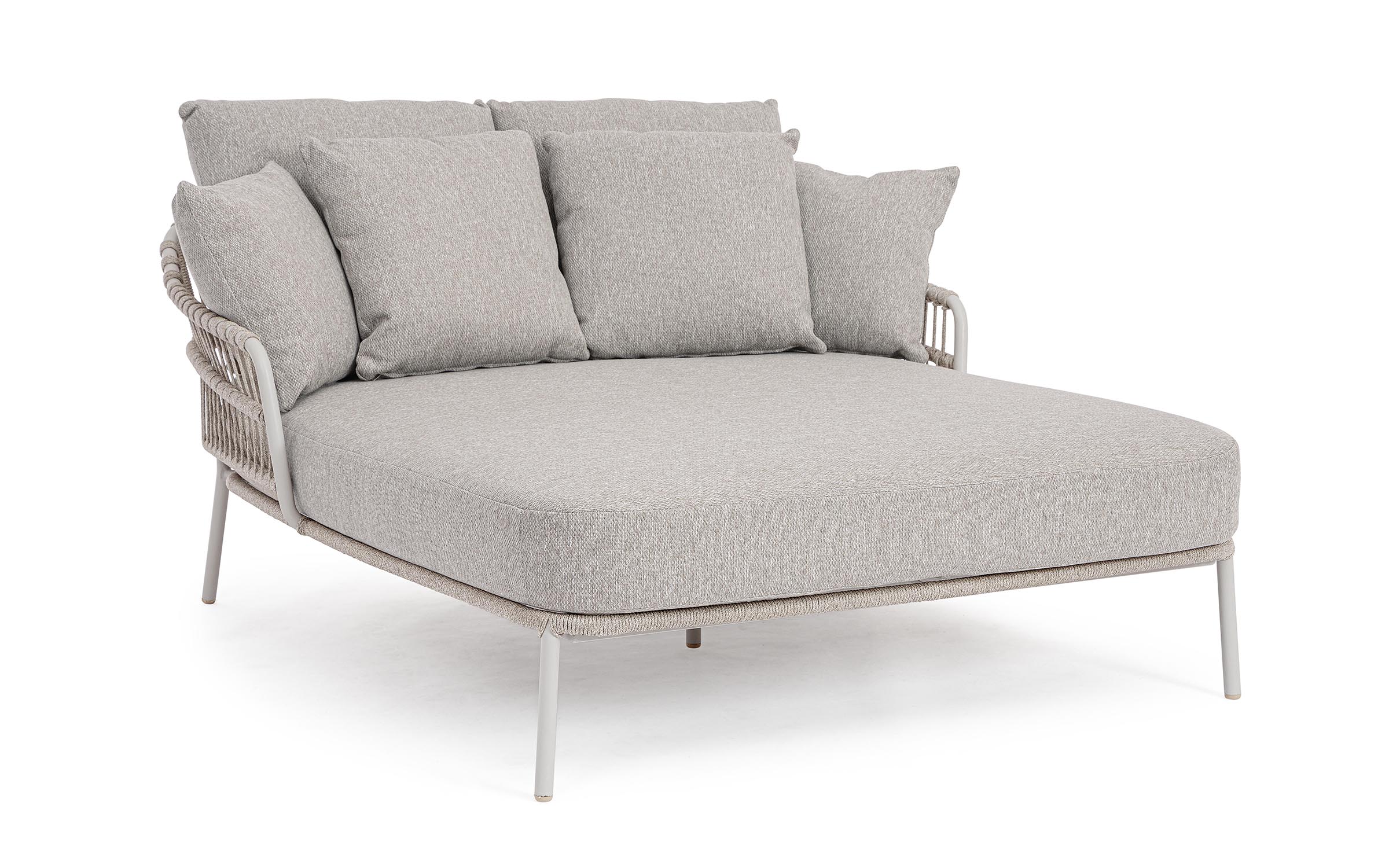 Nowoczesna leżanka dla 2 osób ogrodowa Talaia na nowoczesny taras. Konstrukcja ze stali nierdzewnej w malowaniu proszkowym opleciona lekkim oplotem z liny polipropylenowej.