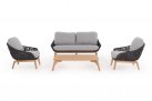 Luksusowa sofa wypoczynkowa na taras. Podstawa z drewna teak. Oparcie o konstrukcji aluminiowej z plecionką z liny polipropylenowej. Poduszki szybkoschnące z poszewkami z materiału Olefin.