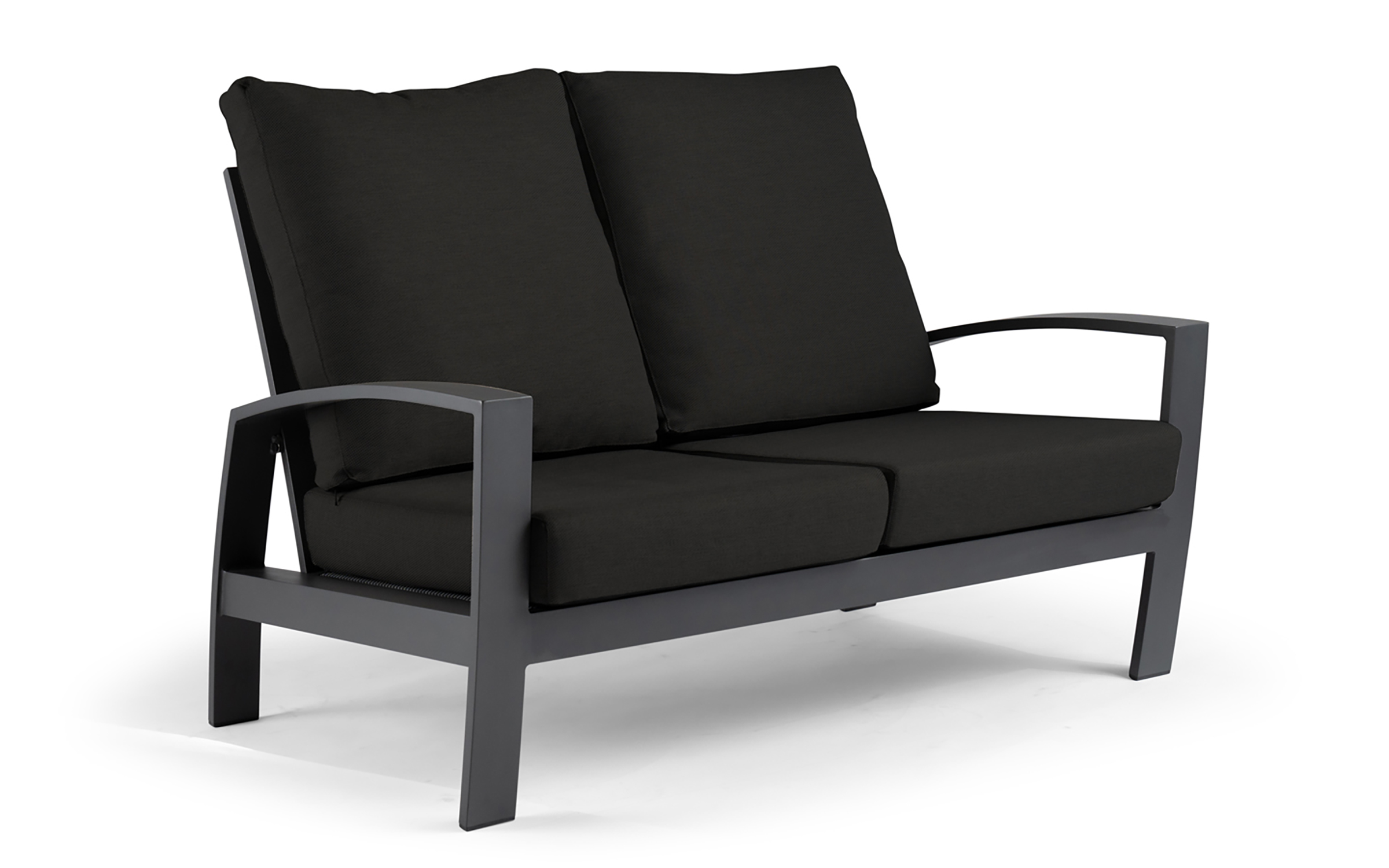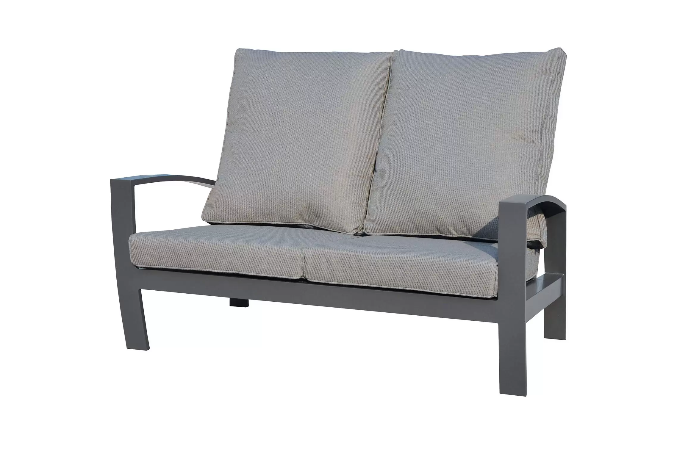 Nowoczesna sofa wypoczynkowa o aluminiowej konstrukcji z wygodnymi poduszkami wodoodpornymi z poszewkami z materiału Olefin.