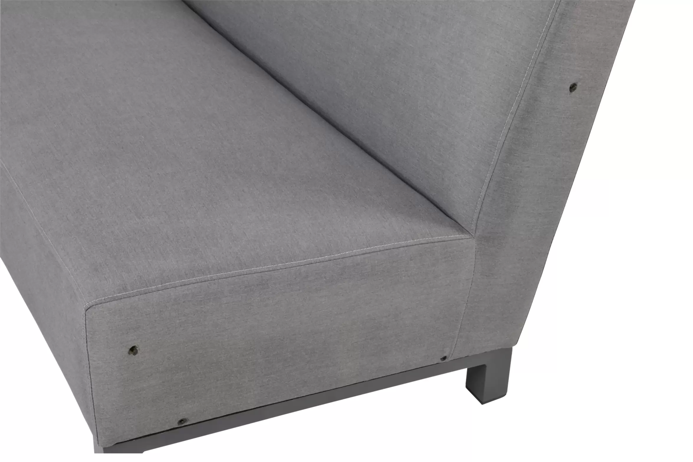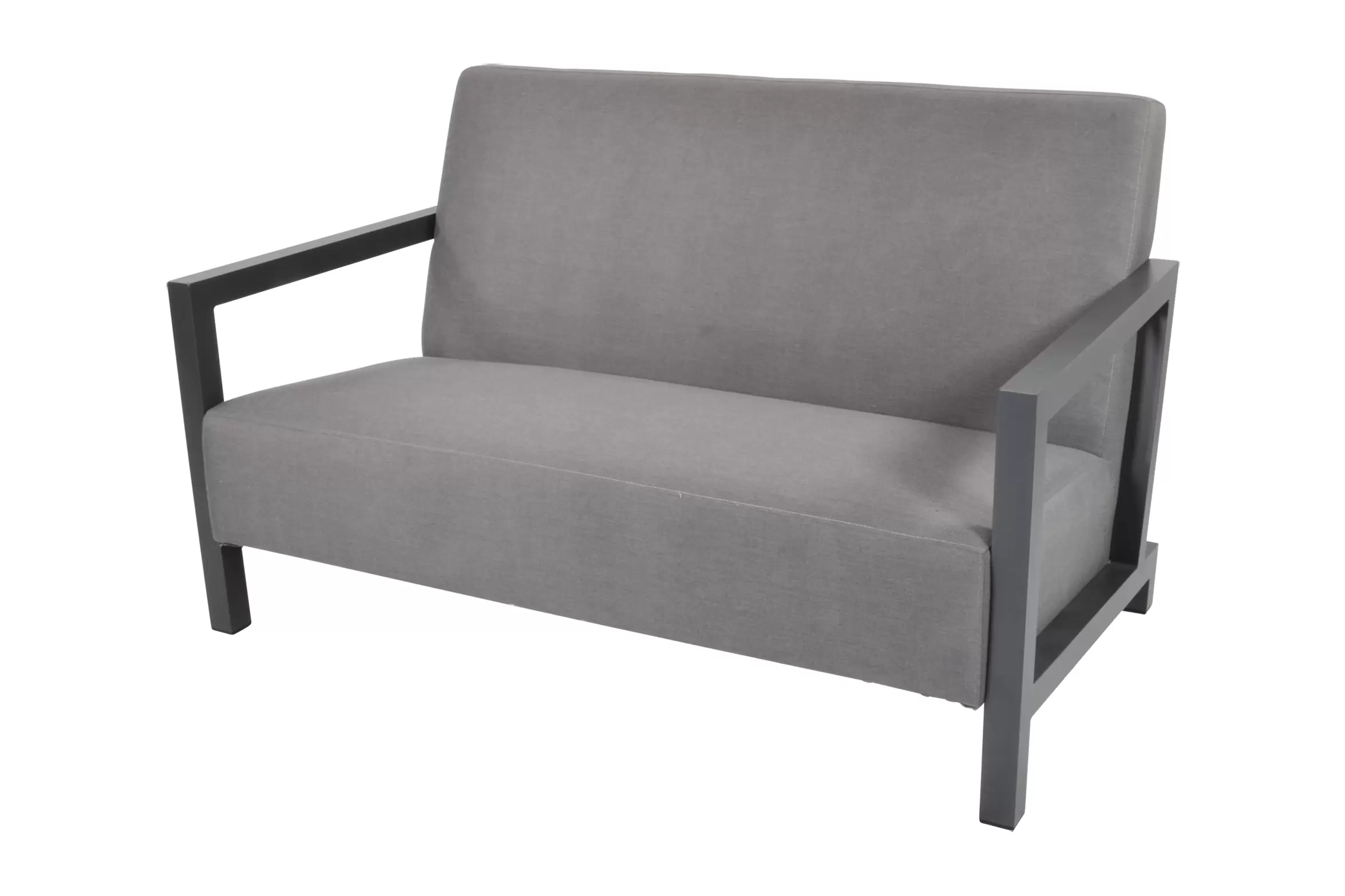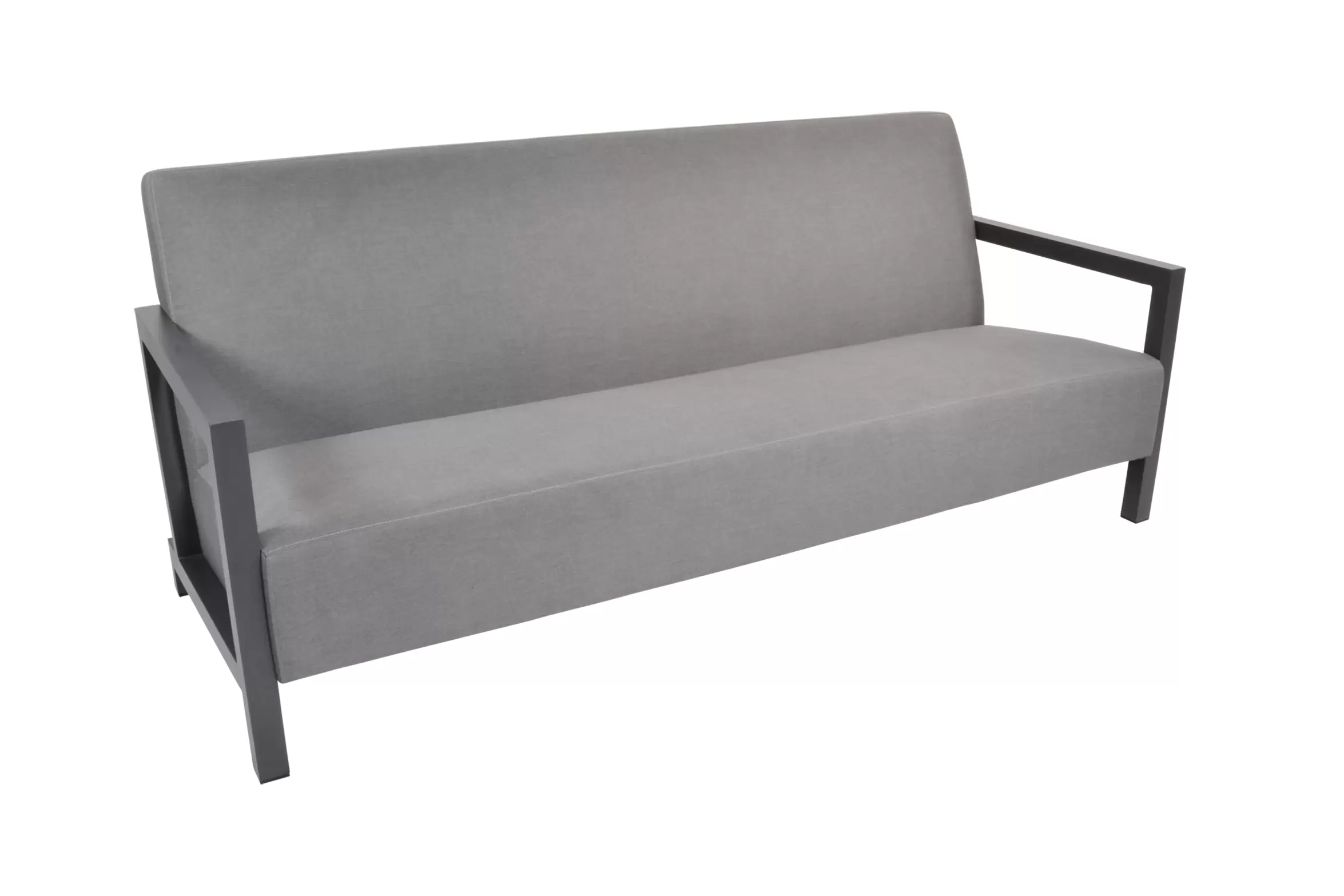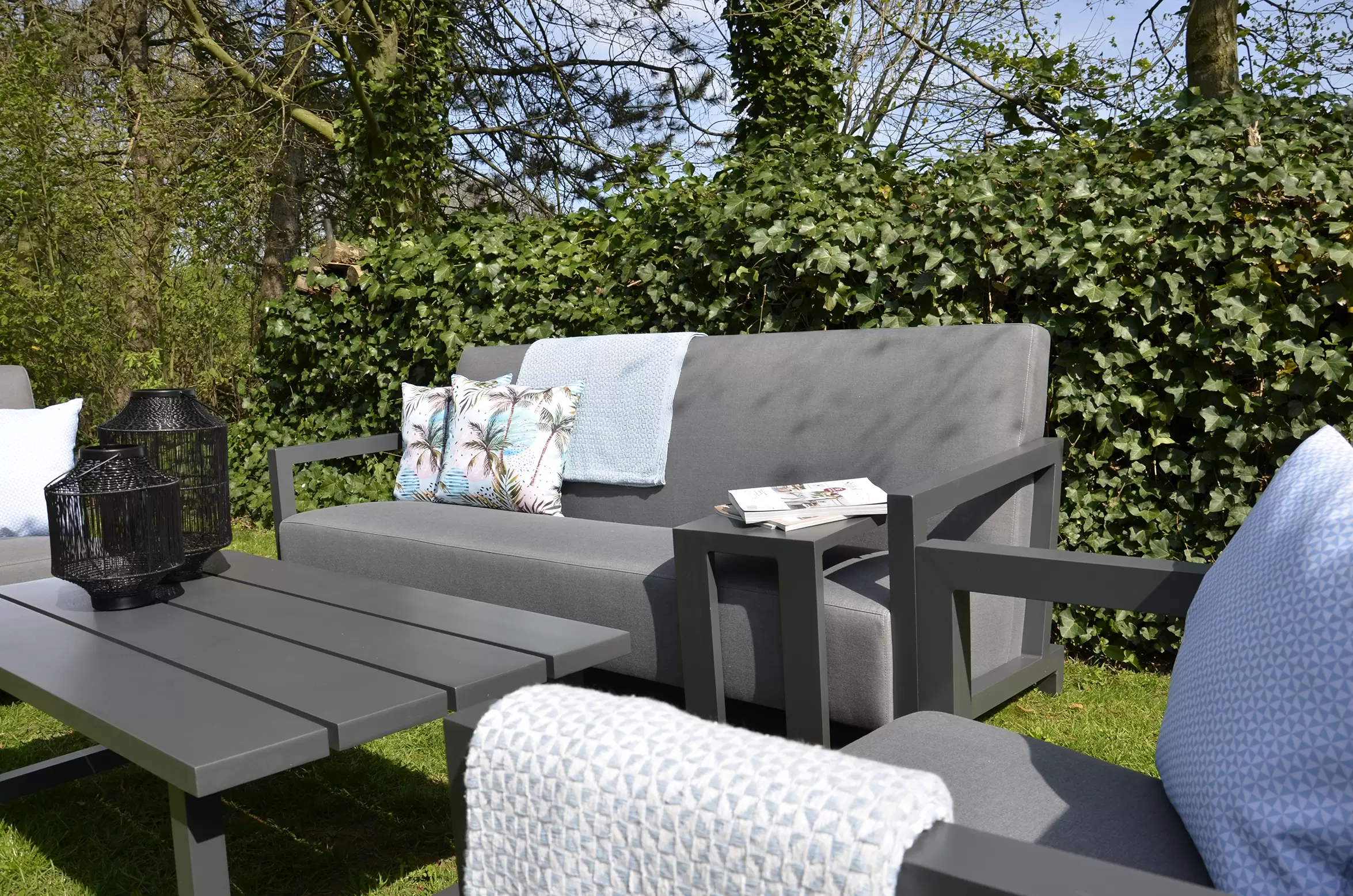 Nowoczesne sofy wypoczynkowe o aluminiowej konstrukcji z grubymi wygodnymi poduszkami wodoodpornymi z poszewkami z materiału Olefin.