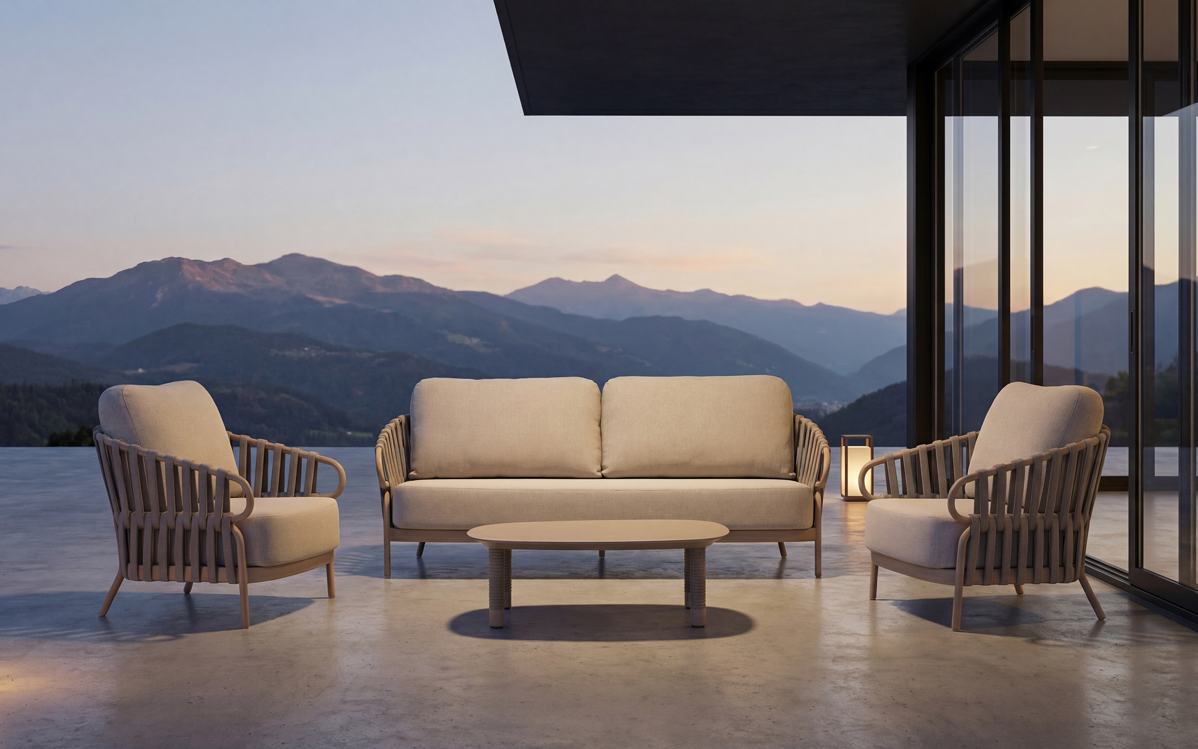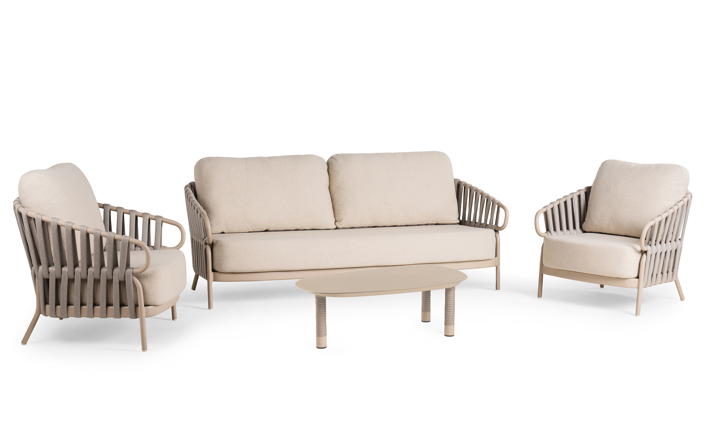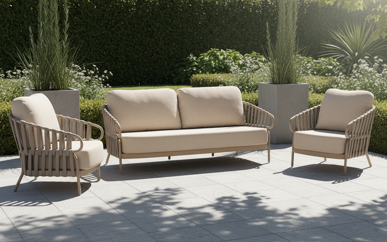 Komplet mebli ogrodowych NURI od TierraOutdoor to kwintesencja nowoczesnego designu, stworzona z myślą o aranżacji luksusowych tarasów i ogrodowych stref wypoczynku. W skład zestawu wchodzi przestronna, trzyosobowa sofa oraz dwa komfortowe fotele, które wspólnie tworzą estetyczną i zapraszającą do relaksu przestrzeń. Cała kolekcja bazuje na lekkich, aluminiowych stelażach w subtelnym odcieniu Champagne, które dzięki światowej klasy powłoce AkzoNobel zyskują najwyższą ochronę przed korozją. Charakterystycznym detalem są boki i oparcia wykończone dekoracyjną plecionką typu rope, która nadaje bryłom wizualnej lekkości i dba o swobodną cyrkulację powietrza.