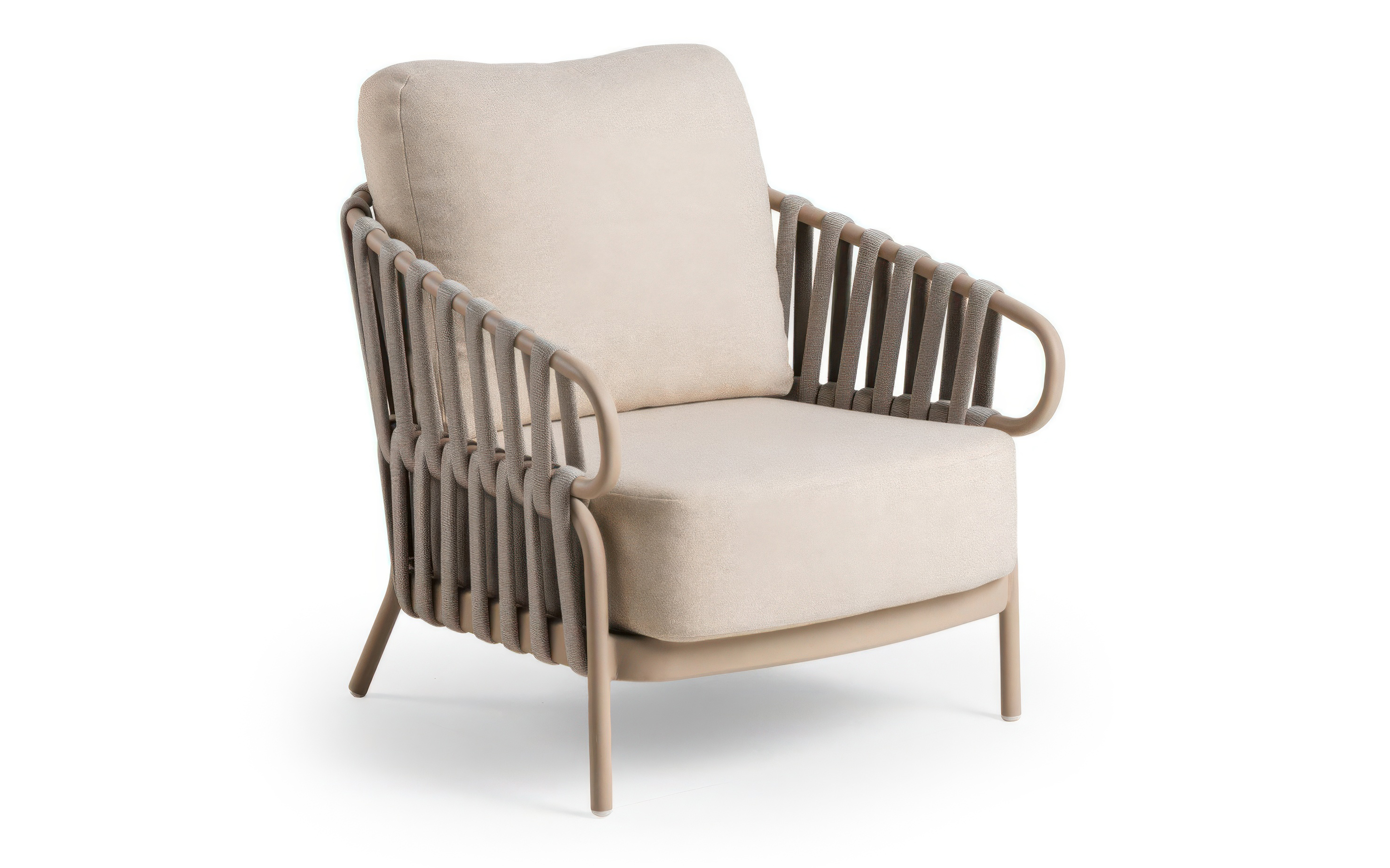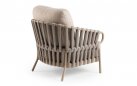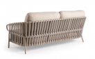 Unikalny design boków i oparcia tworzy dekoracyjna lina outdoorowa typu Rope, wykonana w formie nowoczesnych rękawów polipropylenowych z gumowym wkładem. Ta zaawansowana plecionka z efektem 3D jest w pełni przystosowana do użytku zewnętrznego, wykazując wysoką odporność na wilgoć i słońce. Przestrzenna struktura rękawów nie tylko nadaje sofie wizualnej głębi, ale również wspomaga naturalną cyrkulację powietrza, co znacząco podnosi komfort użytkowania w upalne dni.