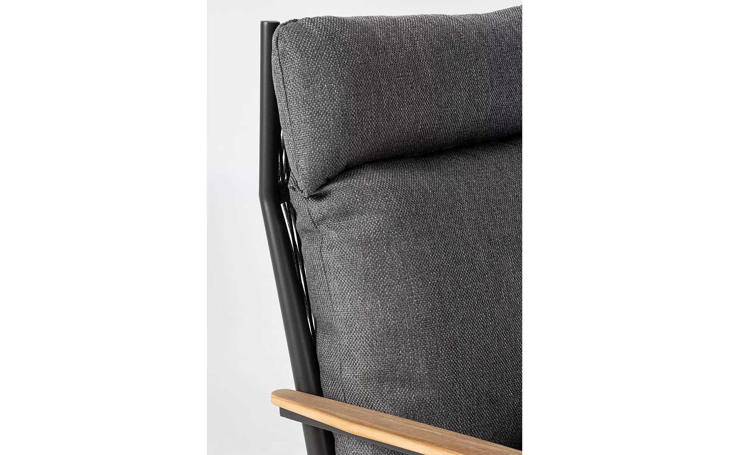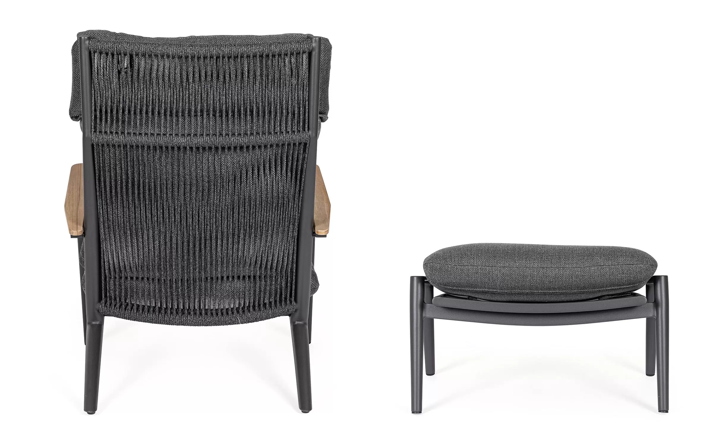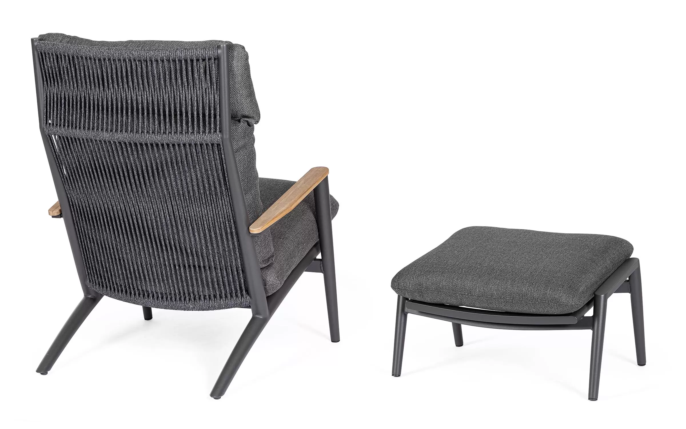 Duży, szeroki i wysoki fotel ogrodowy z podnóżkiem w grafitowym kolorze. Ozdobnie wyplatane oparcie z liny polipropylenowej oraz teakowe wstawki na podłokietnikach uzupełniają niecodzienny design tego wygodnego modelu.