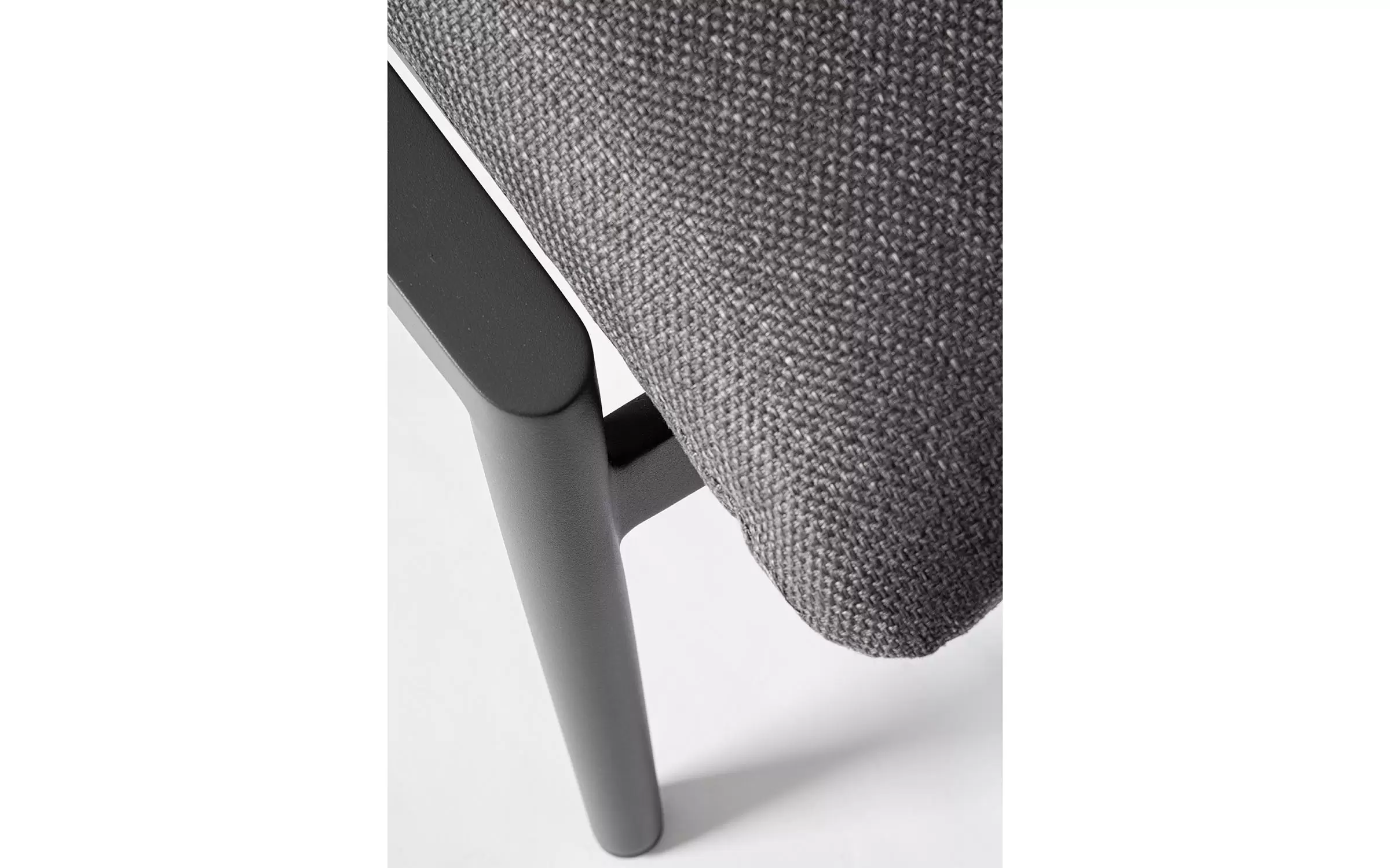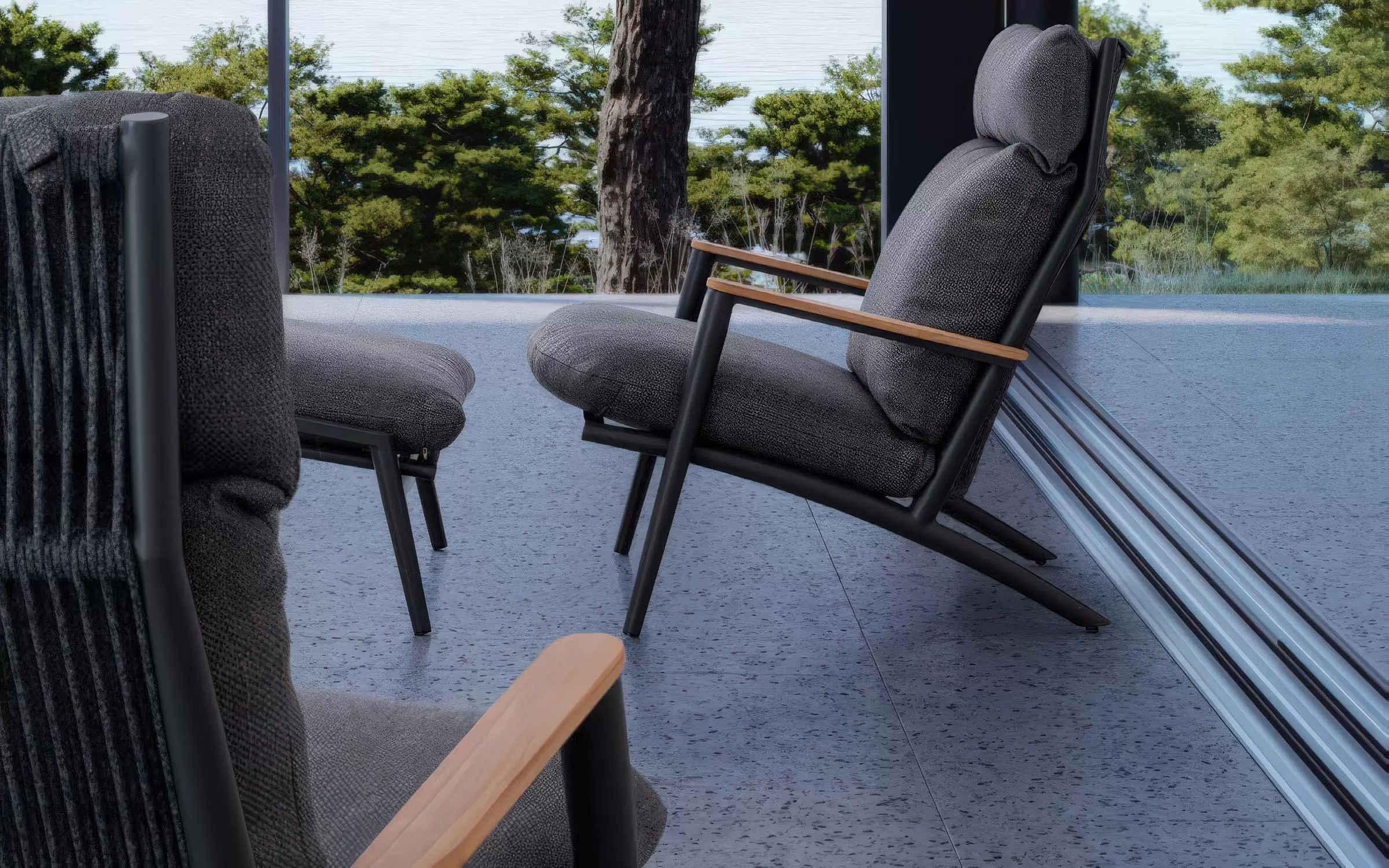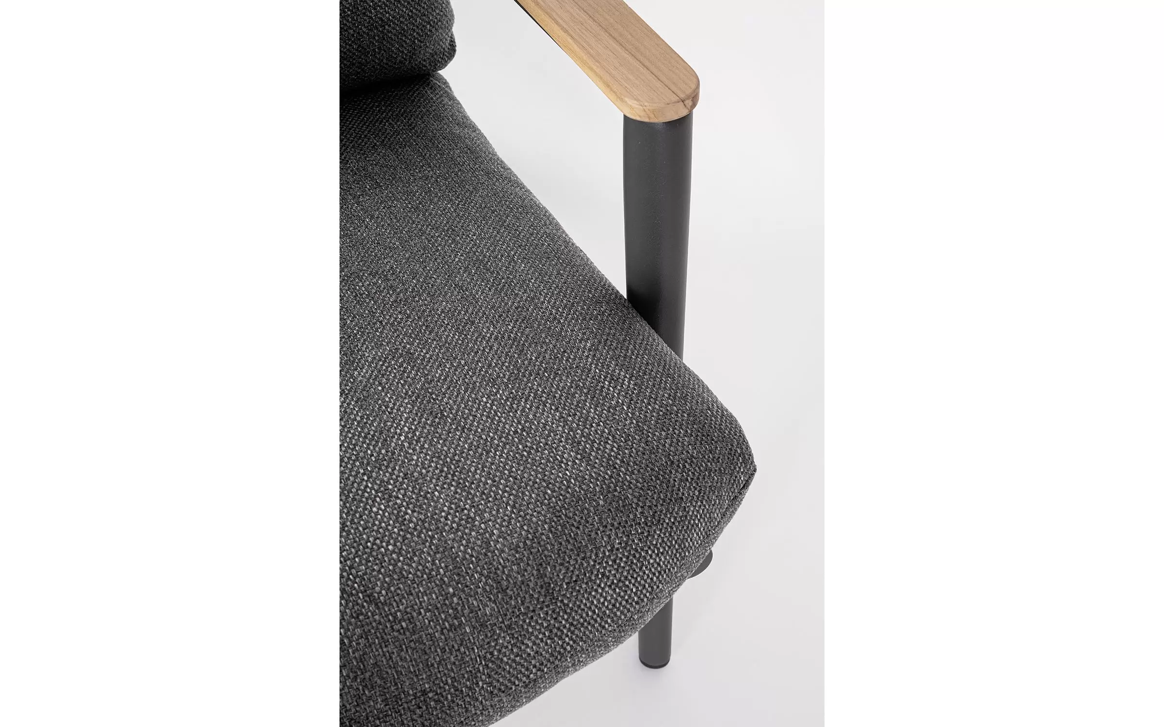 Duży, szeroki i wysoki fotel ogrodowy z podnóżkiem w grafitowym kolorze. Ozdobnie wyplatane oparcie z liny polipropylenowej oraz teakowe wstawki na podłokietnikach uzupełniają niecodzienny design tego wygodnego modelu.