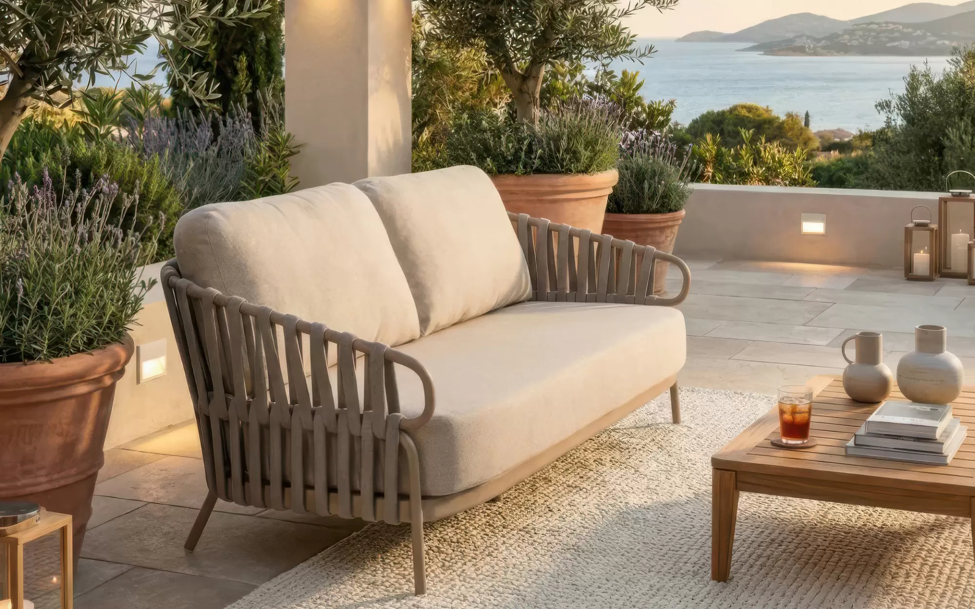 Unikalny design boków i oparcia tworzy dekoracyjna lina outdoorowa typu Rope, wykonana w formie nowoczesnych rękawów polipropylenowych z gumowym wkładem. Ta zaawansowana plecionka z efektem 3D jest w pełni przystosowana do użytku zewnętrznego, wykazując wysoką odporność na wilgoć i słońce. Przestrzenna struktura rękawów nie tylko nadaje sofie wizualnej głębi, ale również wspomaga naturalną cyrkulację powietrza, co znacząco podnosi komfort użytkowania w upalne dni.
