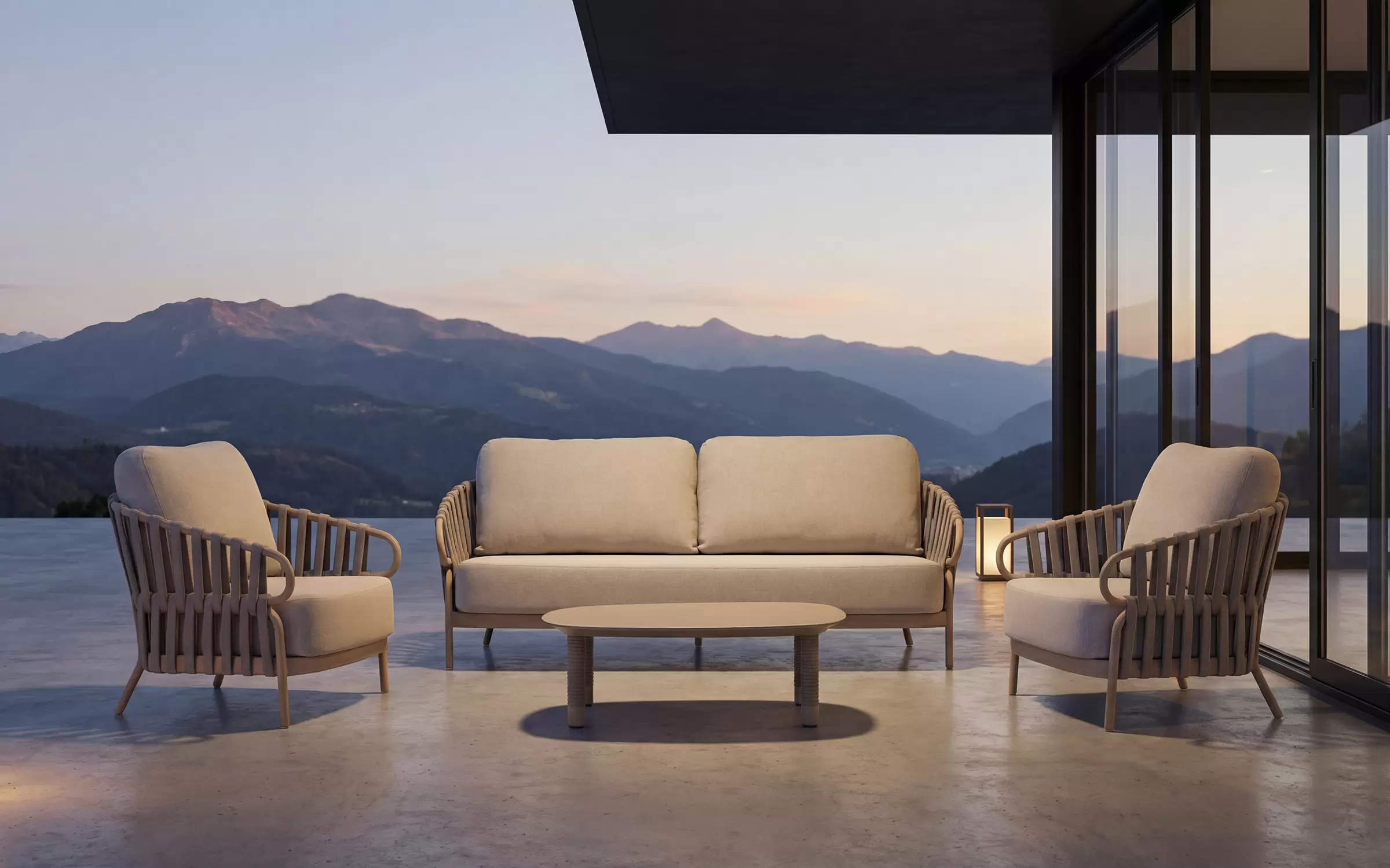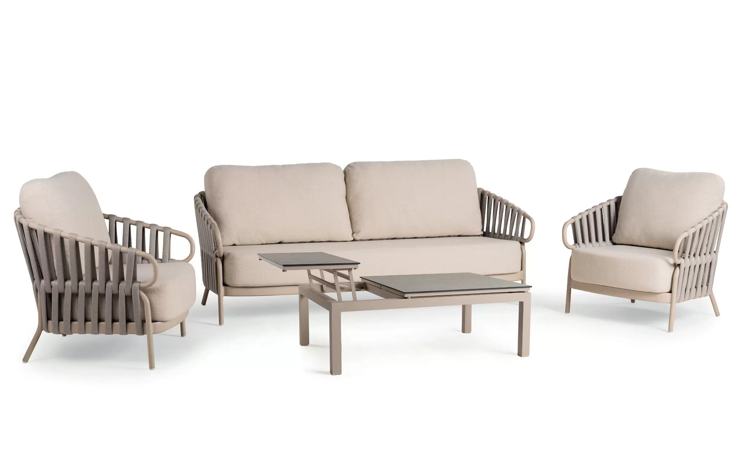 Unikalny charakter modelu NURI definiuje misterny wyplot zdobiący boki oraz oparcie, wykonany z innowacyjnych rękawów polipropylenowych z piankowym wkładem. Ta techniczna plecionka z efektem 3D nie tylko przyciąga wzrok efektownym wzorem, ale zapewnia też doskonałą wentylację i unikalną miękkość. Komfort wypoczynku potęgują beżowe poduszki z odpornej na czynniki zewnętrzne tkaniny Olefin, wypełnione specjalistyczną pianką szybkoschnącą, która błyskawicznie odprowadza wilgoć. Całość dopełniają zdejmowane pokrowce, ułatwiające pielęgnację i sprawiające, że utrzymanie tej eleganckiej sofy w czystości jest niezwykle proste.