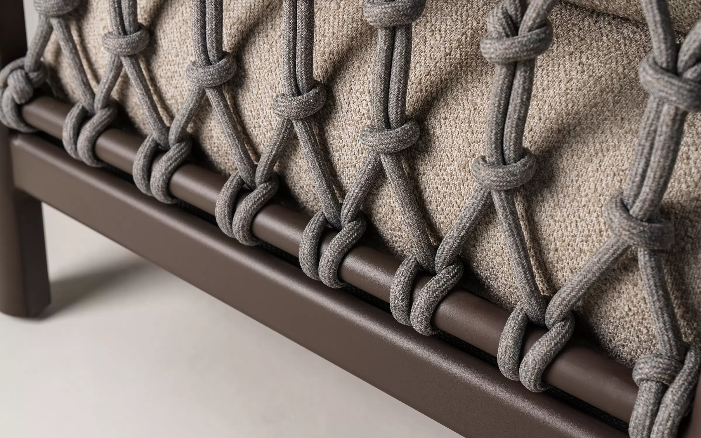 Lina polipropylenowa (Rope) Oparcia mebli zostały wykończone dekoracyjnym splotem z liny polipropylenowej. Jest to materiał syntetyczny nowej generacji, który charakteryzuje się wysoką gęstością i odpornością na uszkodzenia mechaniczne. Lina jest hydrofobowa (nie chłonie wody) oraz odporna na pleśń i grzyby. Specjalna stabilizacja UV sprawia, że plecionka nie kruszeje na słońcu i nie traci elastyczności, zapewniając stały komfort podparcia.