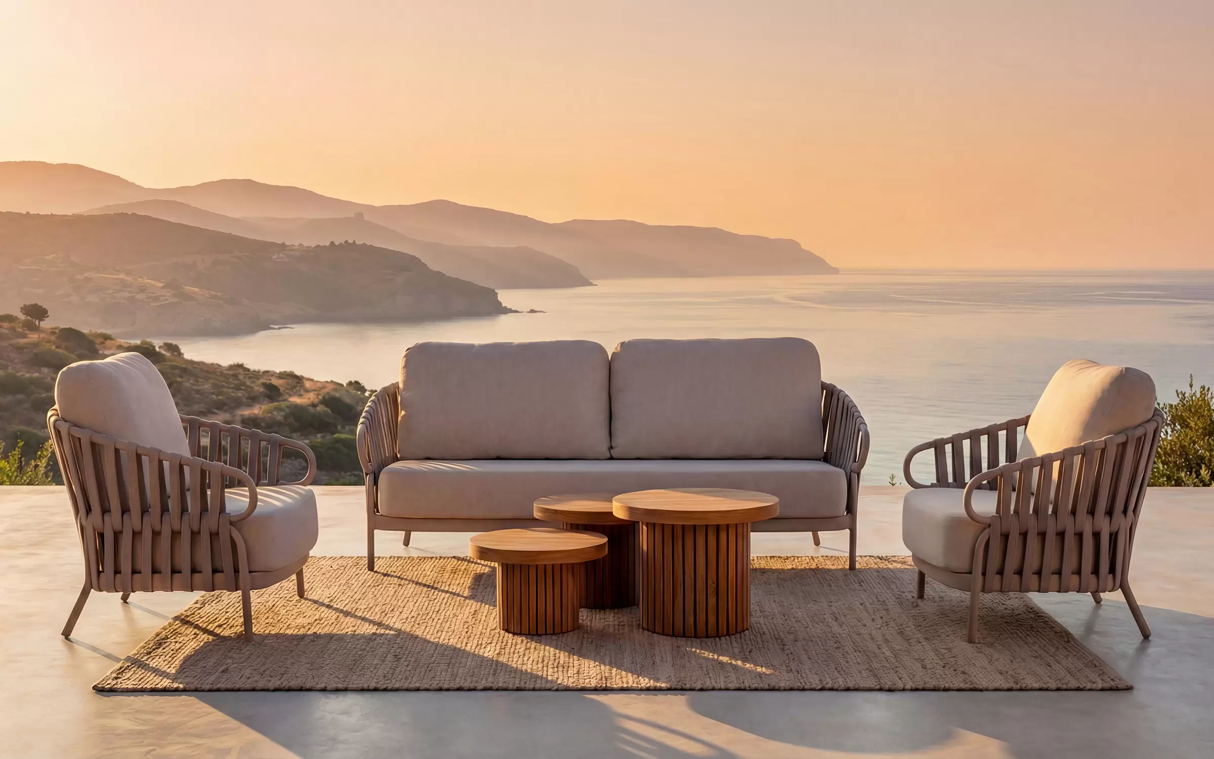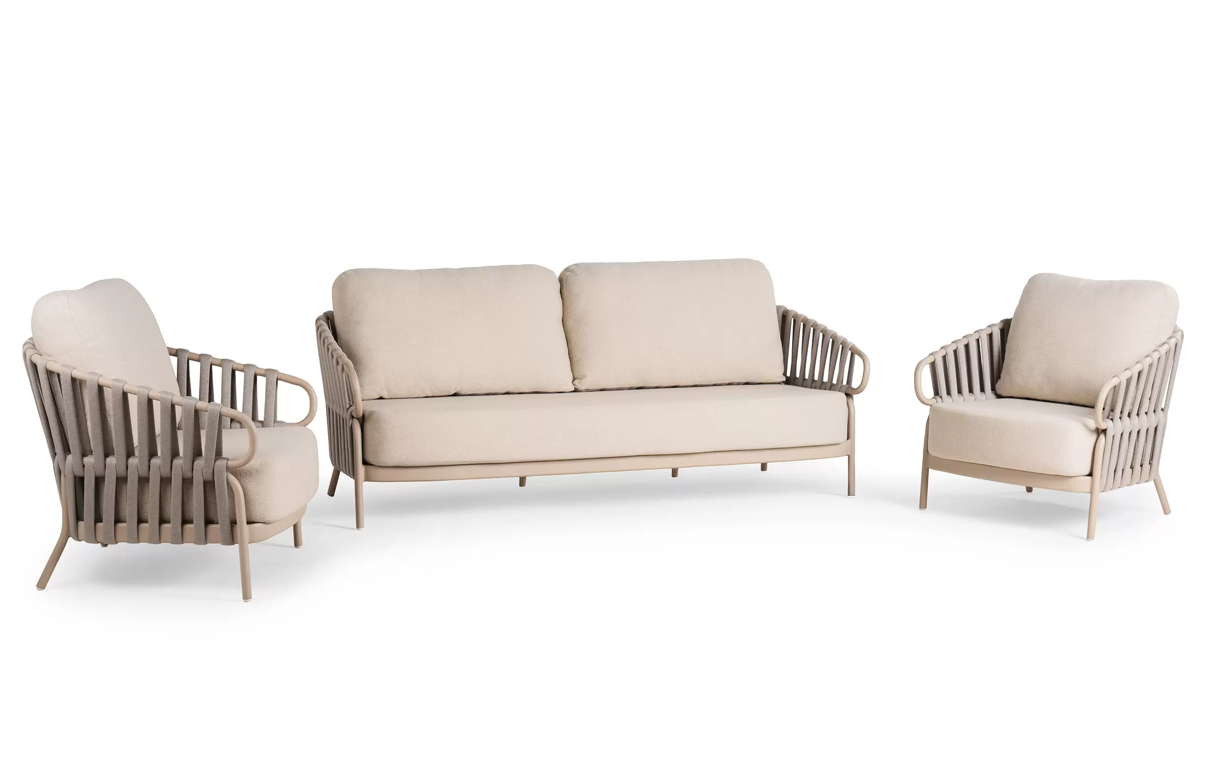 Komplet mebli ogrodowych NURI od TierraOutdoor to kwintesencja nowoczesnego designu, stworzona z myślą o aranżacji luksusowych tarasów i ogrodowych stref wypoczynku. W skład zestawu wchodzi przestronna, trzyosobowa sofa oraz dwa komfortowe fotele, które wspólnie tworzą estetyczną i zapraszającą do relaksu przestrzeń. Cała kolekcja bazuje na lekkich, aluminiowych stelażach w subtelnym odcieniu Champagne, które dzięki światowej klasy powłoce AkzoNobel zyskują najwyższą ochronę przed korozją. Charakterystycznym detalem są boki i oparcia wykończone dekoracyjną plecionką typu rope, która nadaje bryłom wizualnej lekkości i dba o swobodną cyrkulację powietrza.
